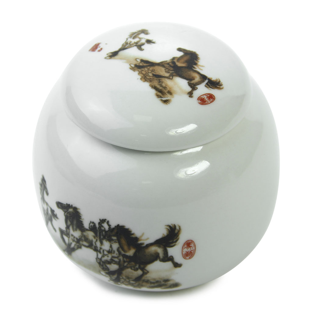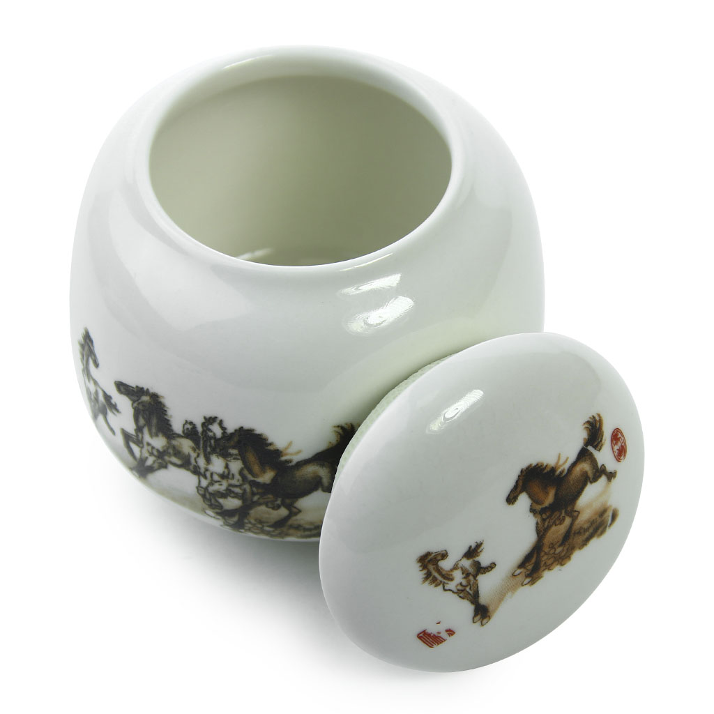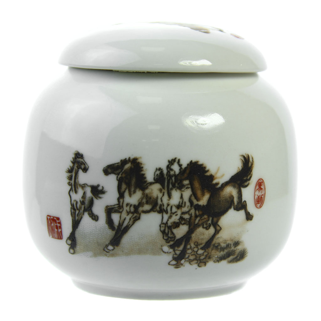 Сосуд для хранения чая объемом 220 мл, округлой формы, с уплотненной крышкой. Декорирован монохромным изображением бегущих лошадей
