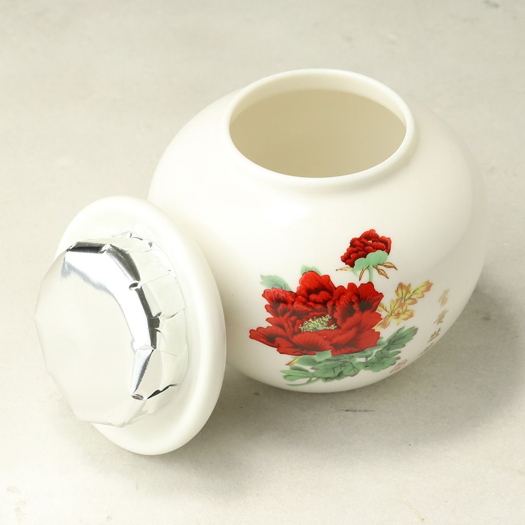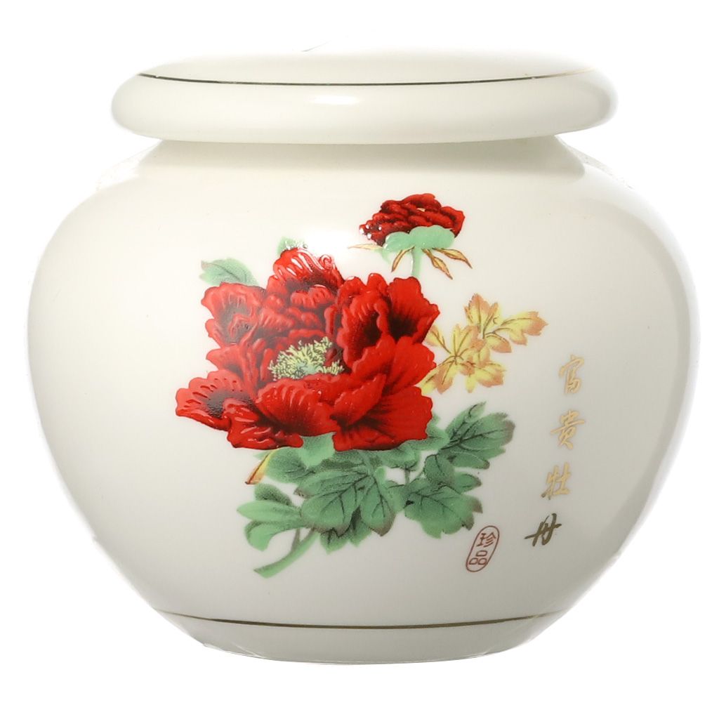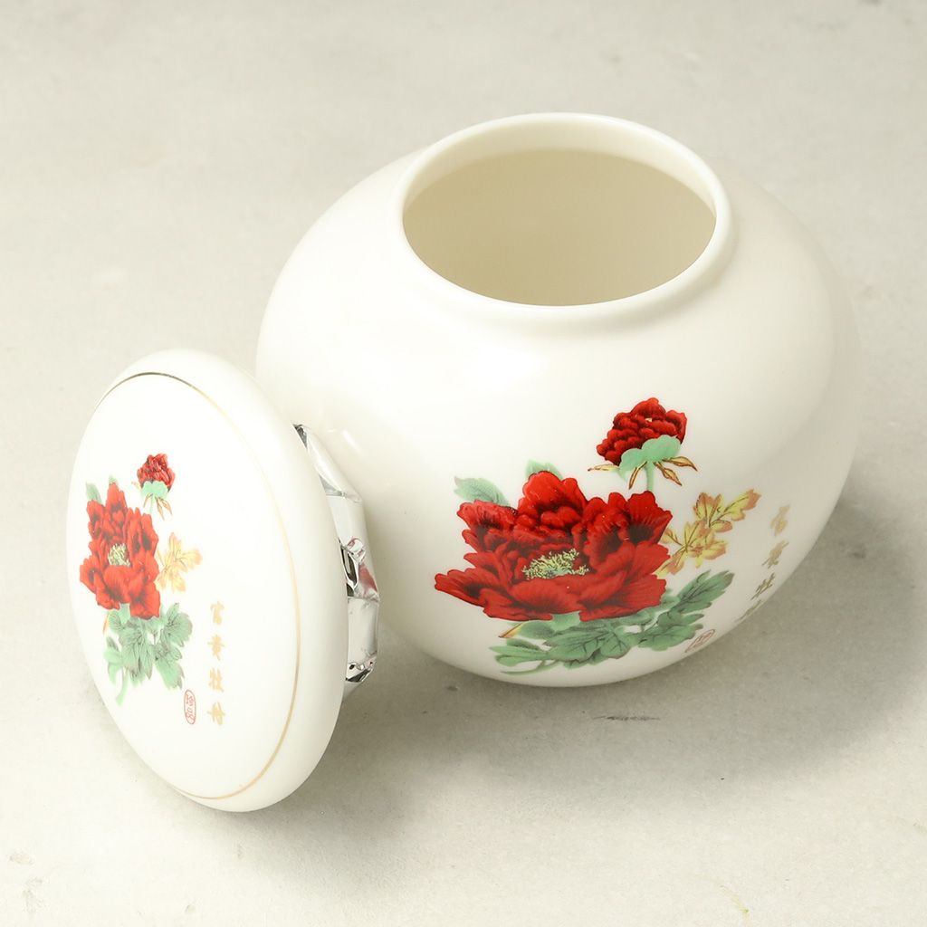 Фарфоровый сосуд для хранения чая, округлой формы, с уплотненной крышкой, объемом 200 мл. Белого цвета, с живописным изображением красного пиона.