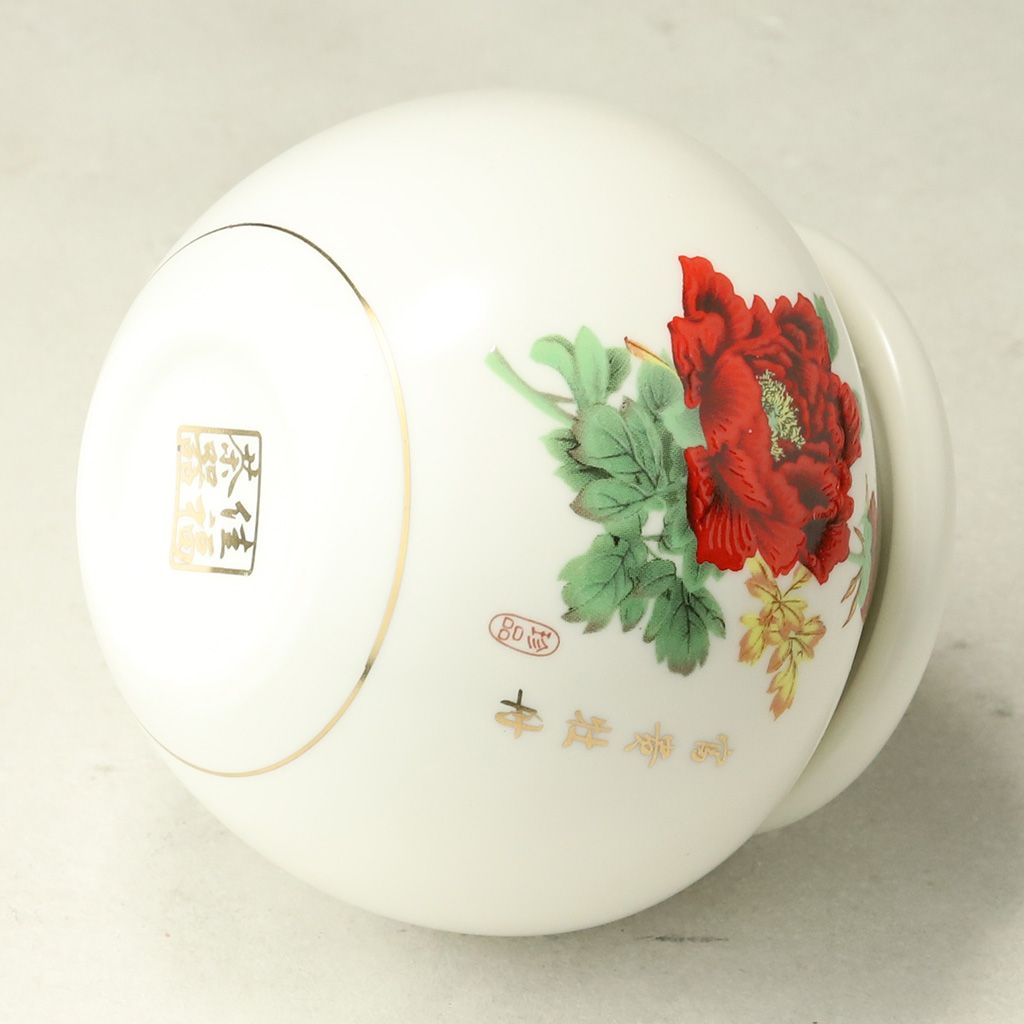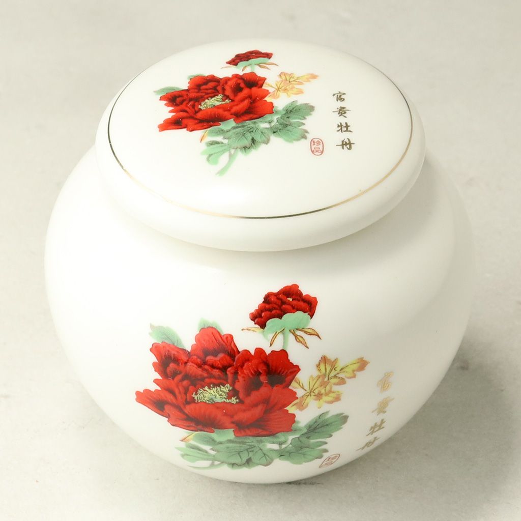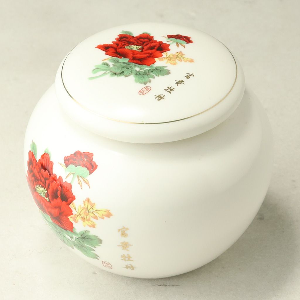 Фарфоровый сосуд для хранения чая, округлой формы, с уплотненной крышкой, объемом 200 мл. Белого цвета, с живописным изображением красного пиона.