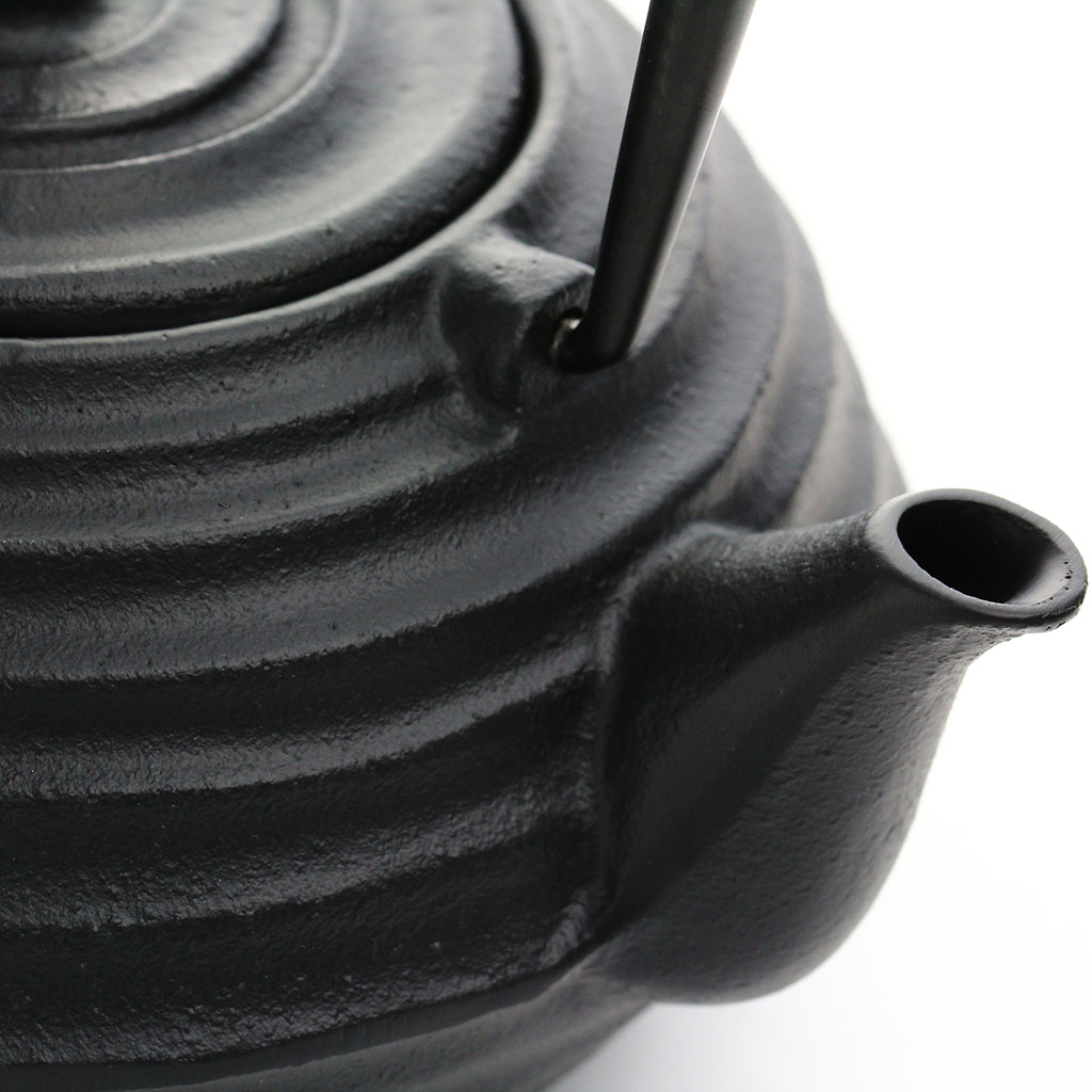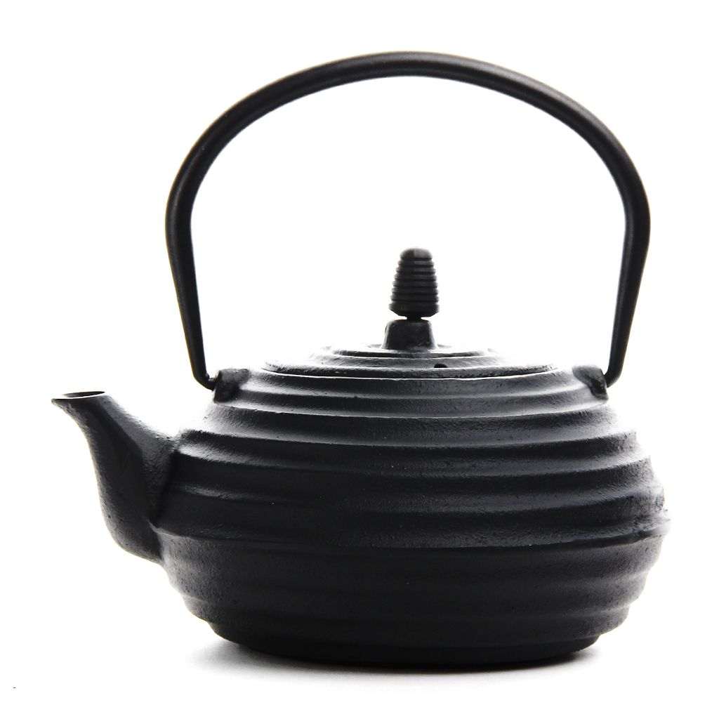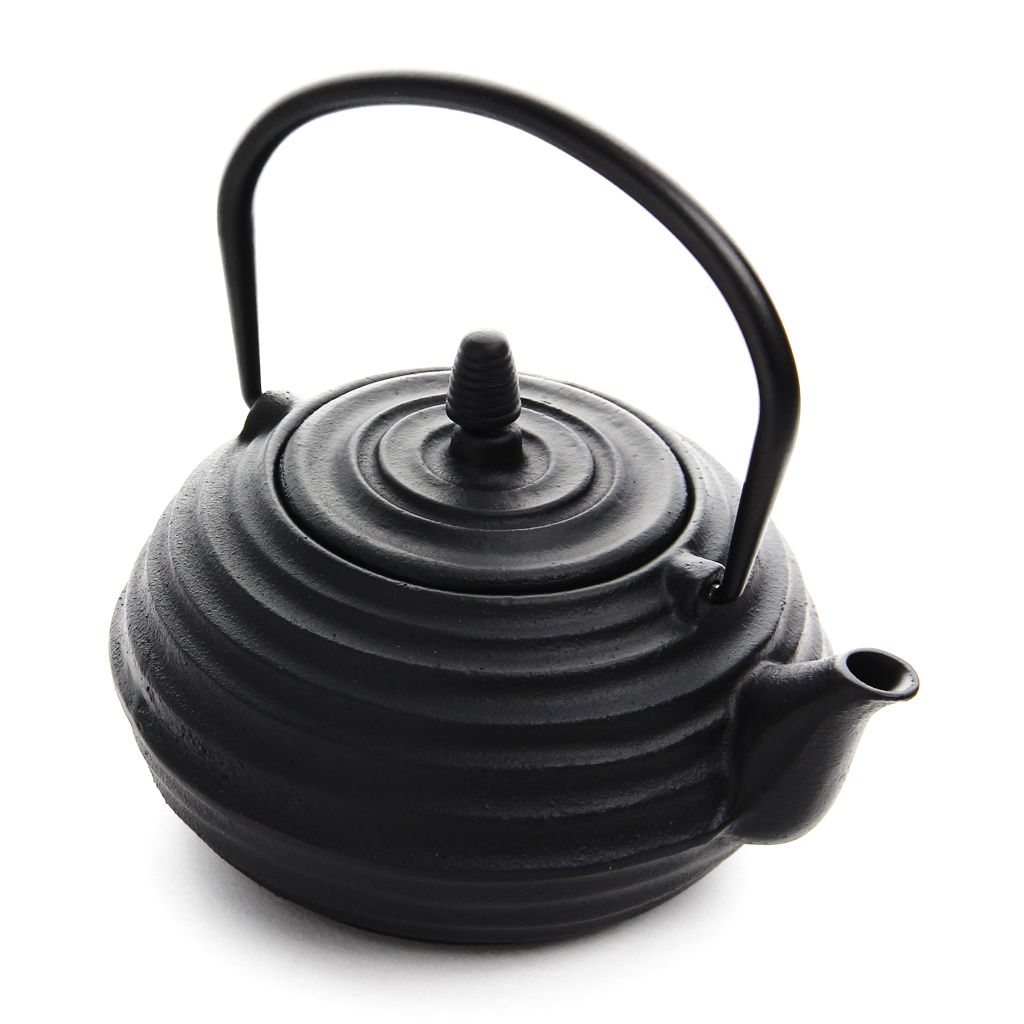 Чайник чугунный округлой приплюснутой формы, с коротким изогнутым носиком, крышкой увенчанной крошечным конусом, тонкой ручкой. Декорирован глубокими поперечными бороздками, формирующими ступенчатую форму на подобии улья.