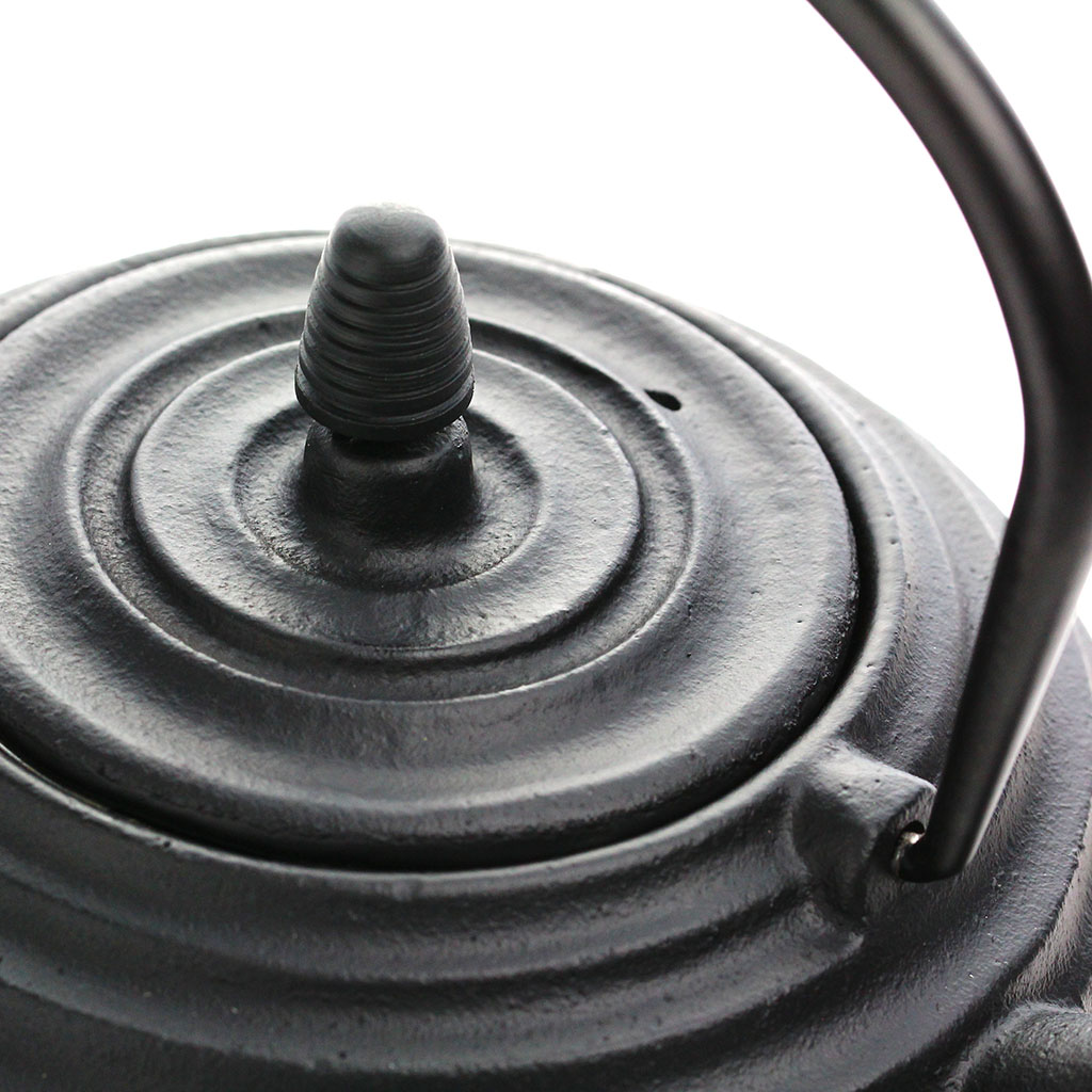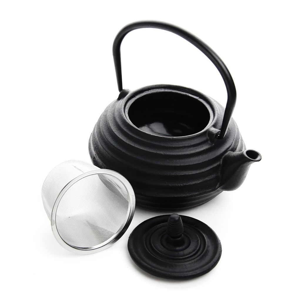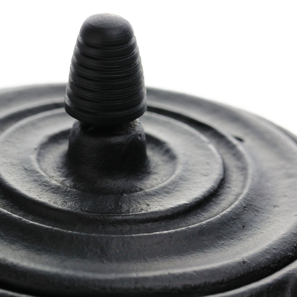 Чайник чугунный округлой приплюснутой формы, с коротким изогнутым носиком, крышкой увенчанной крошечным конусом, тонкой ручкой. Декорирован глубокими поперечными бороздками, формирующими ступенчатую форму на подобии улья.