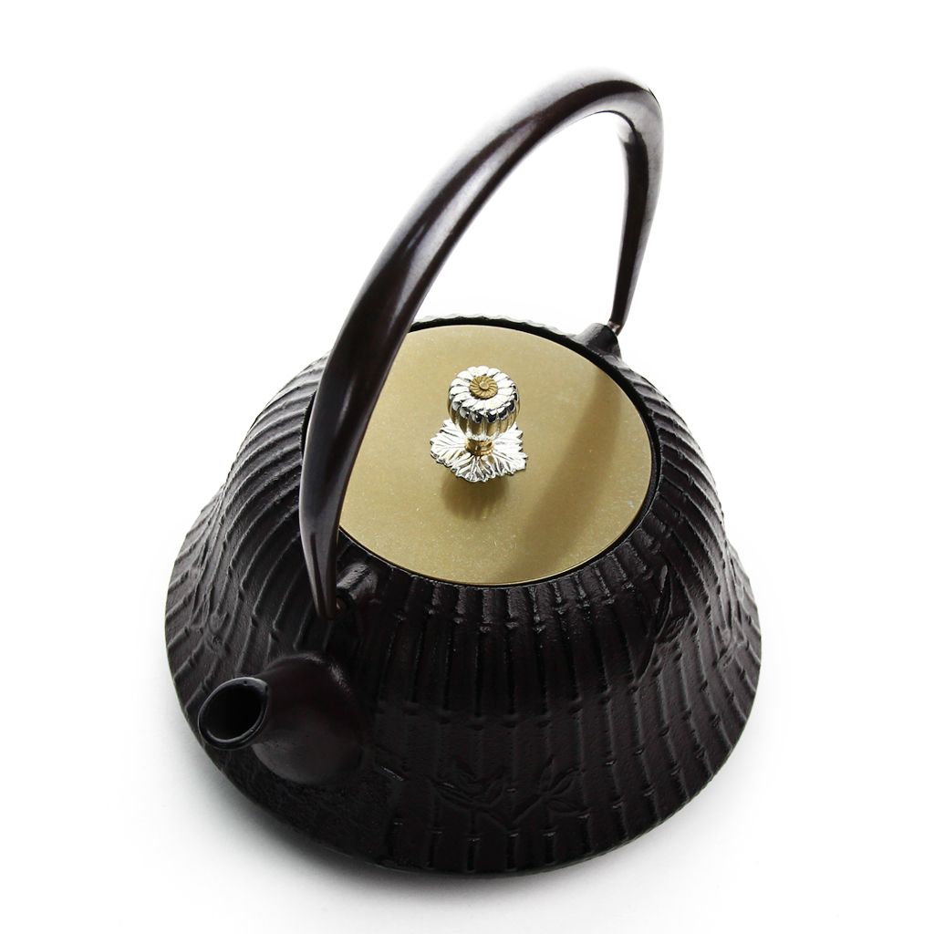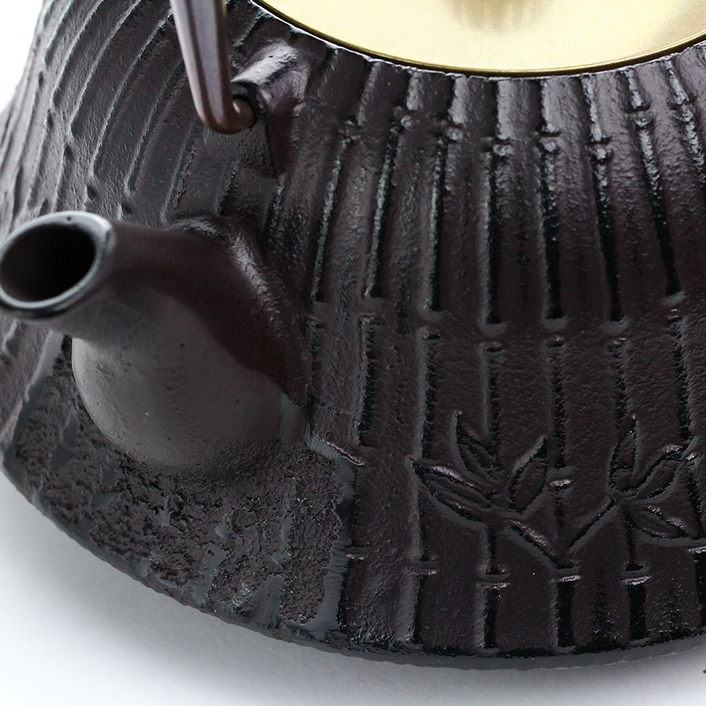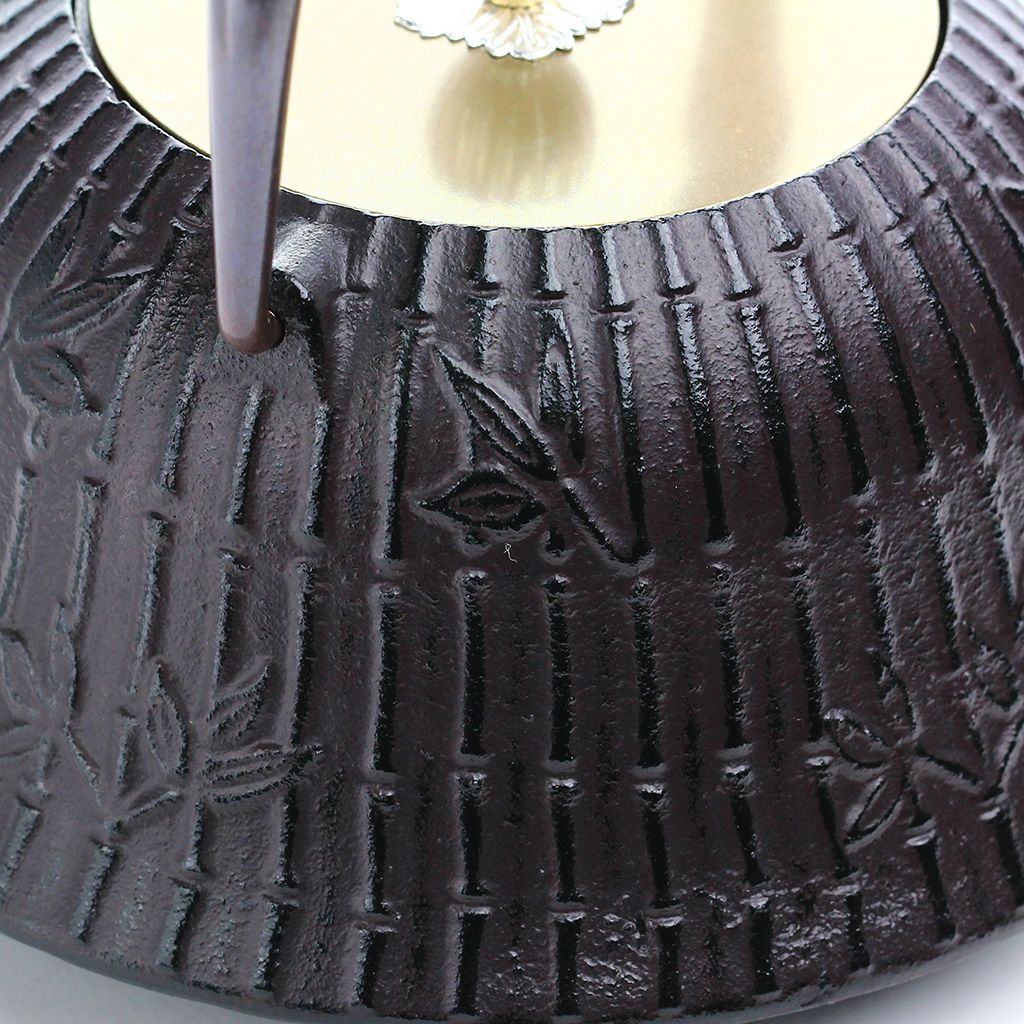 Чугунный чайник полуконической скругленной формы, с плоской крышкой увенчанной серебристым бутоном, слегка изогнутым носиком, изящной ручкой. Красновато-черный чайник с крышкой цвета золота декорирован рельефным бамбуковым орнаментом.