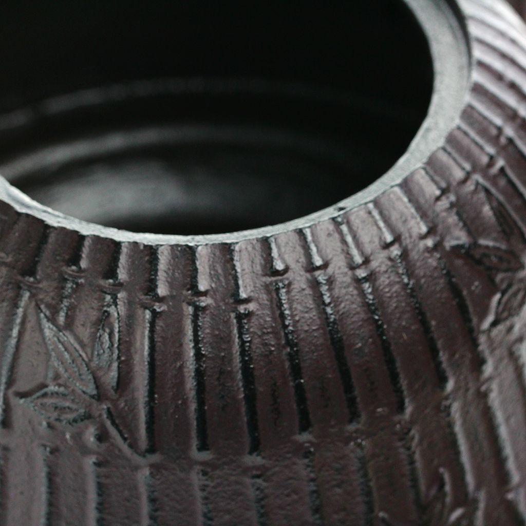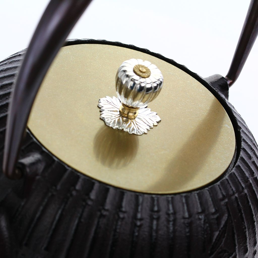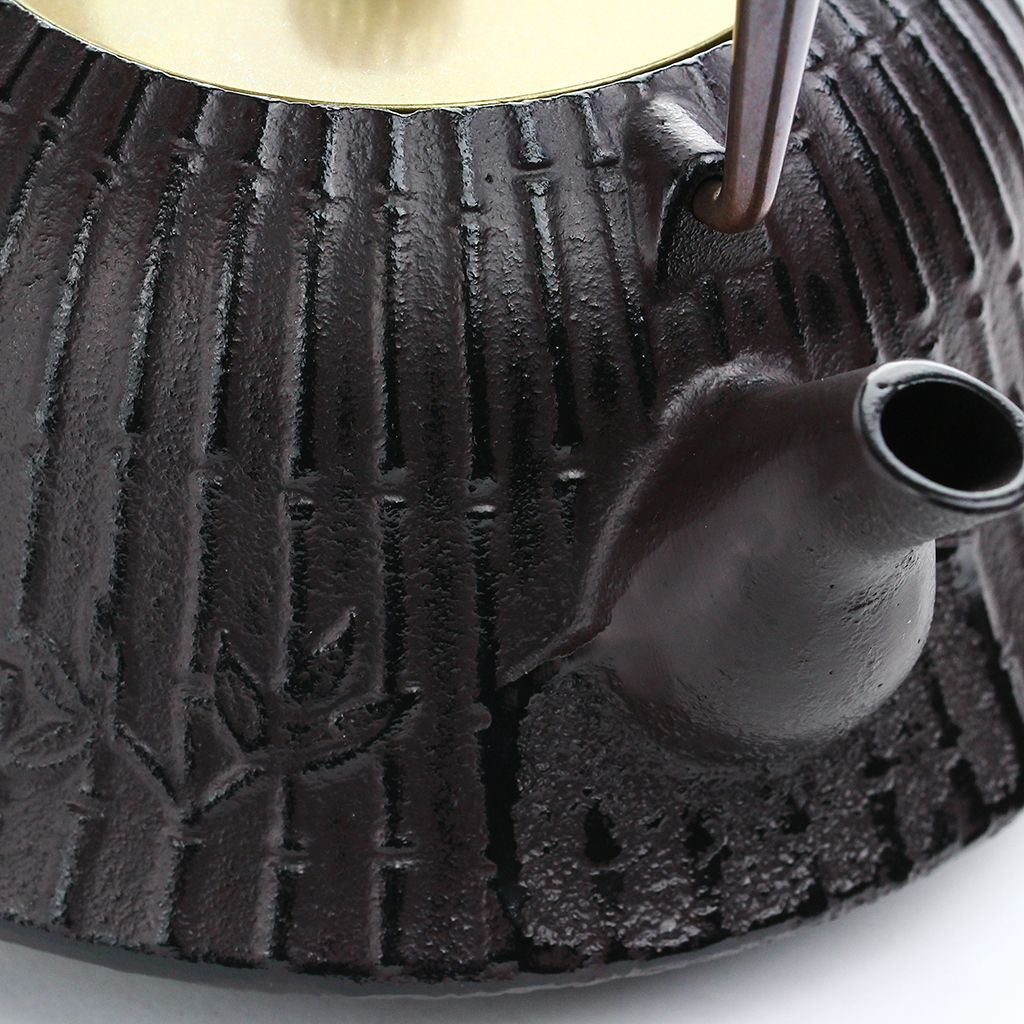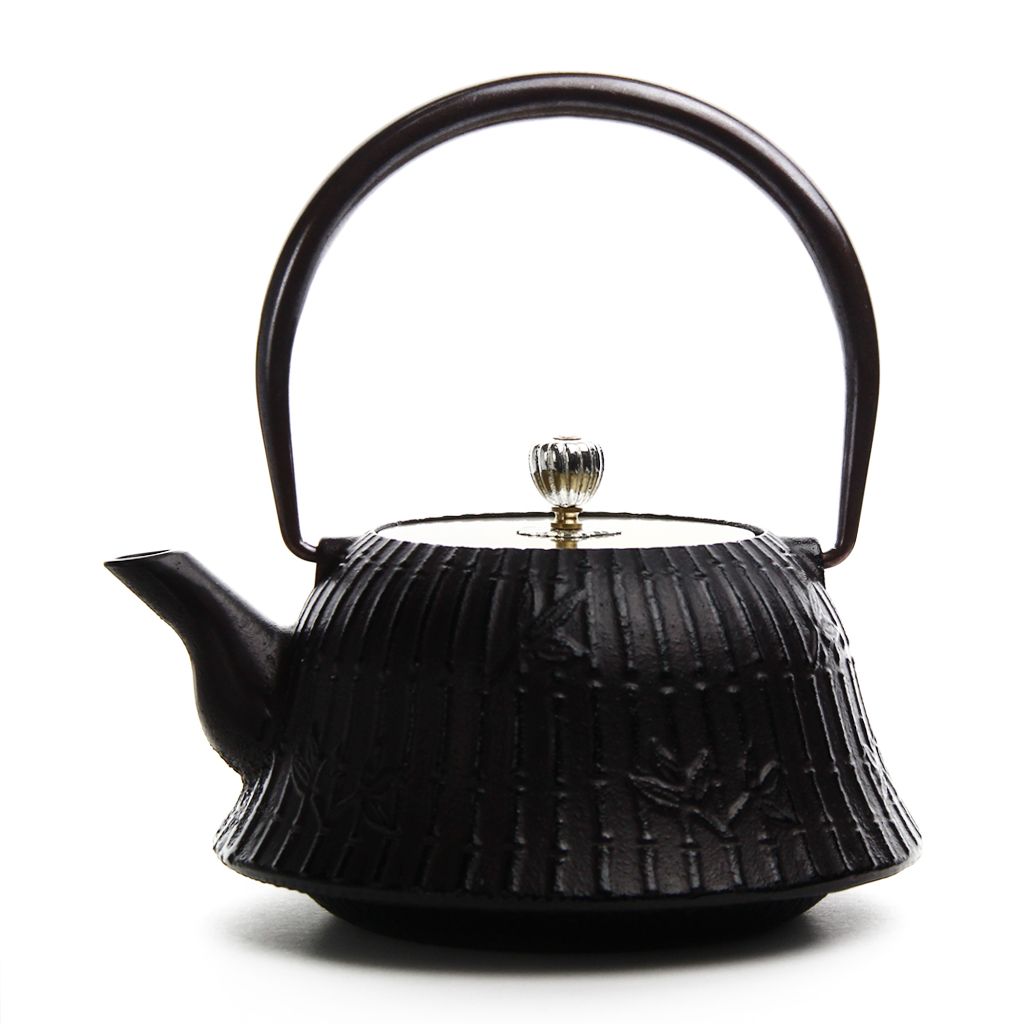 Чугунный чайник полуконической скругленной формы, с плоской крышкой увенчанной серебристым бутоном, слегка изогнутым носиком, изящной ручкой. Красновато-черный чайник с крышкой цвета золота декорирован рельефным бамбуковым орнаментом.