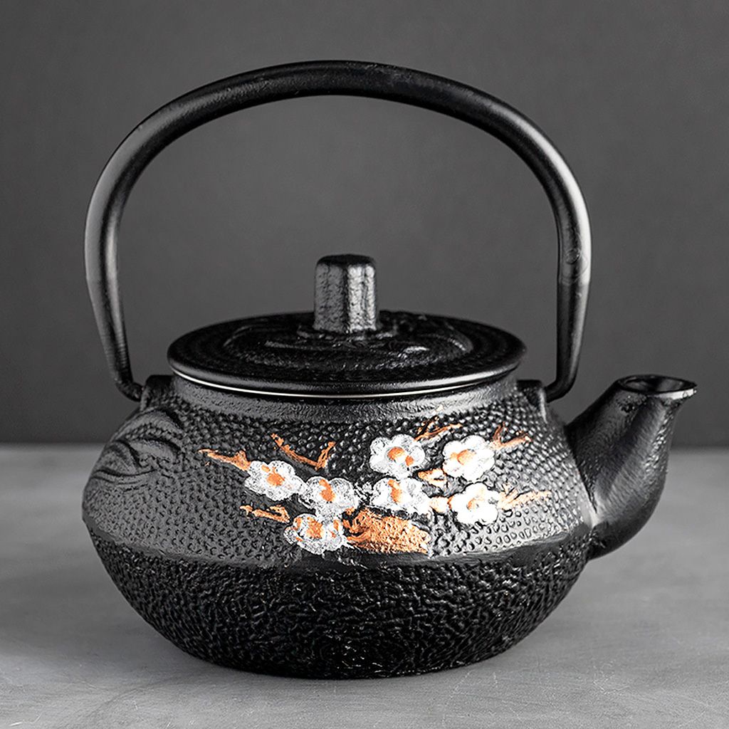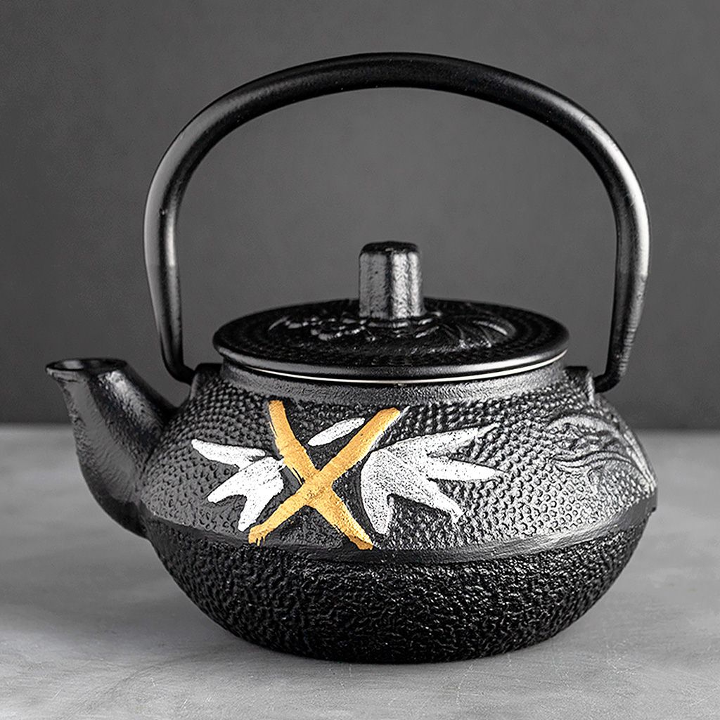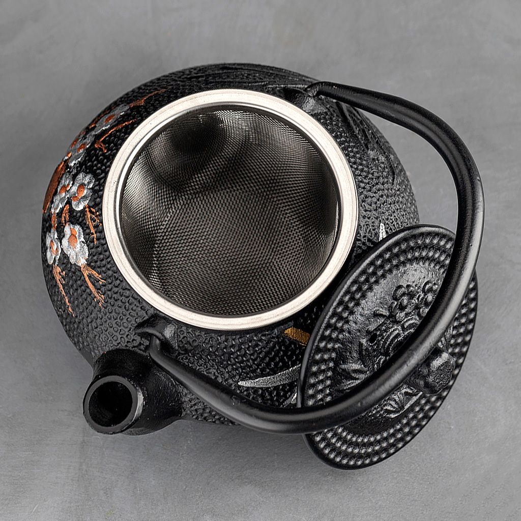 Маленький чугунный чайник округлой приплюснутой формы, с плоской крышкой, коротким широким носиком, тонкой ручкой. Со вставным металлическим ситечком. Имеет фактурную поверхность, с изображением цветов.