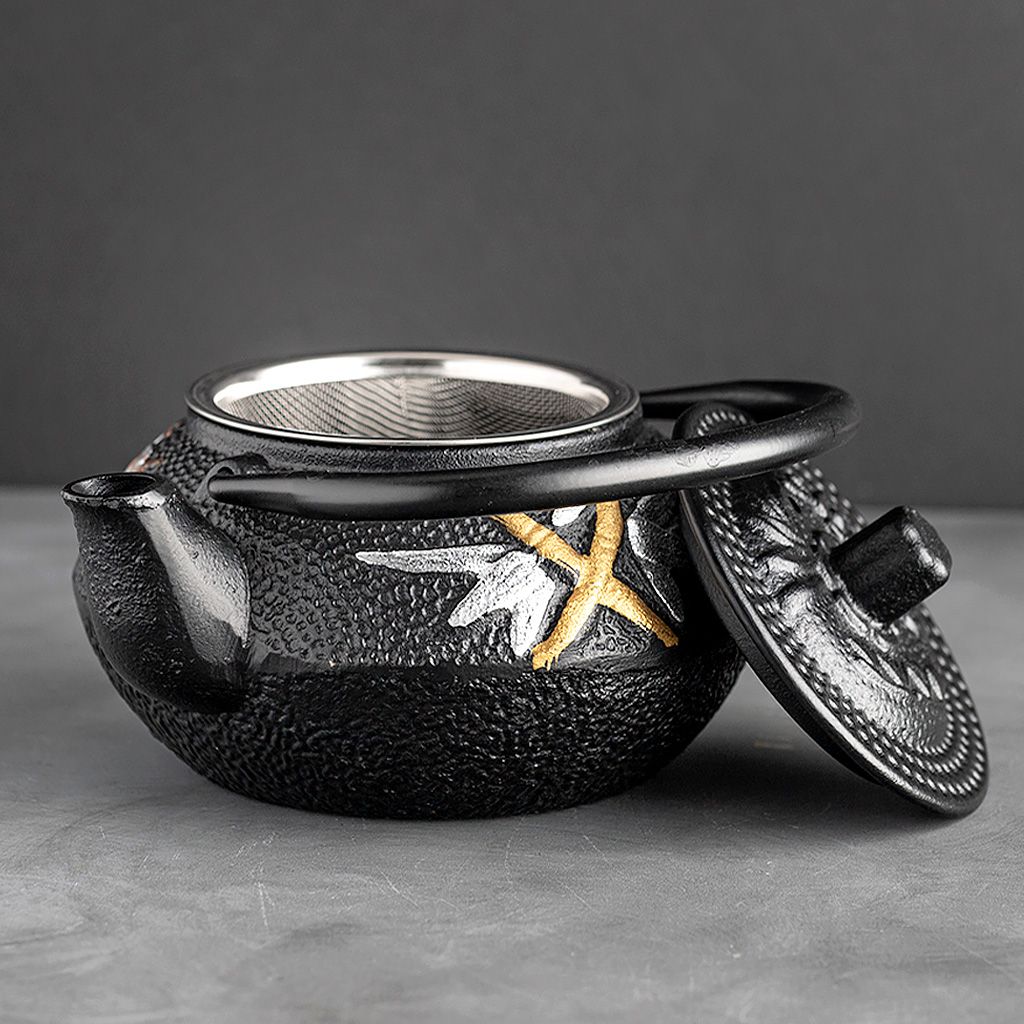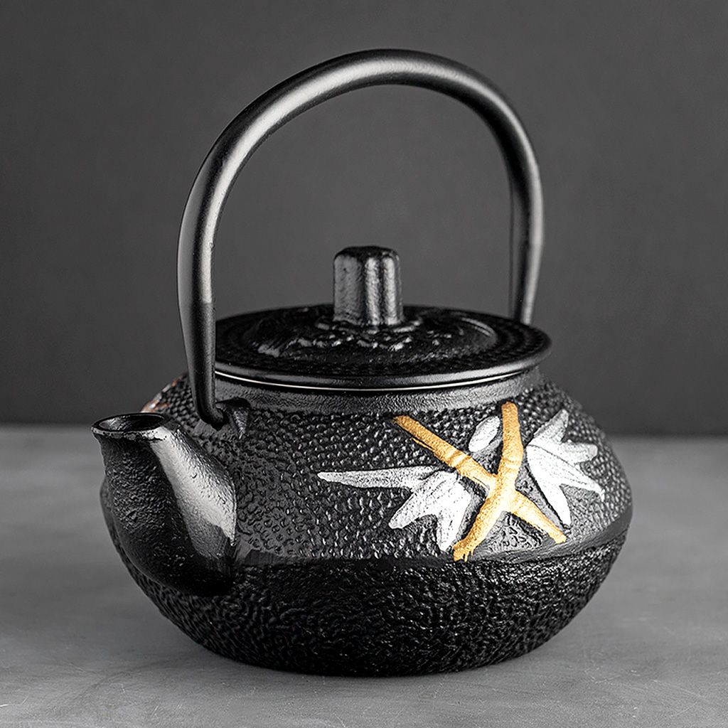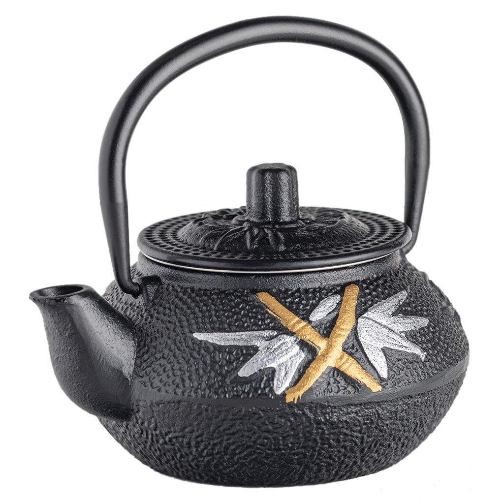 Маленький чугунный чайник округлой приплюснутой формы, с плоской крышкой, коротким широким носиком, тонкой ручкой. Со вставным металлическим ситечком. Имеет фактурную поверхность, с изображением цветов.