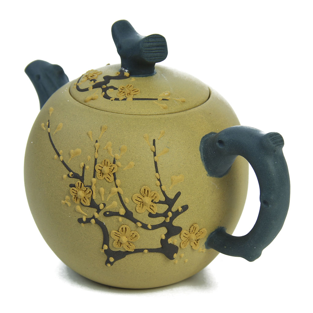 Глиняный чайник желтый шарообразной формы, носик, ручка и ручка на крышке выполнены под дерево и окрашены в темный цвет. Чайник украшен изображением цветущей веточки