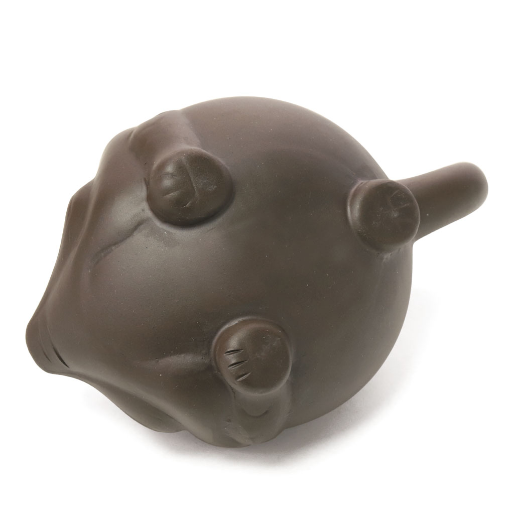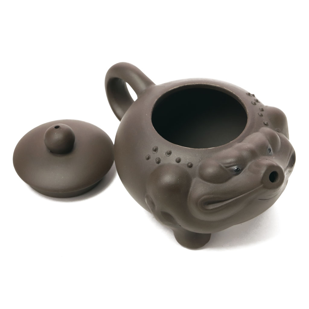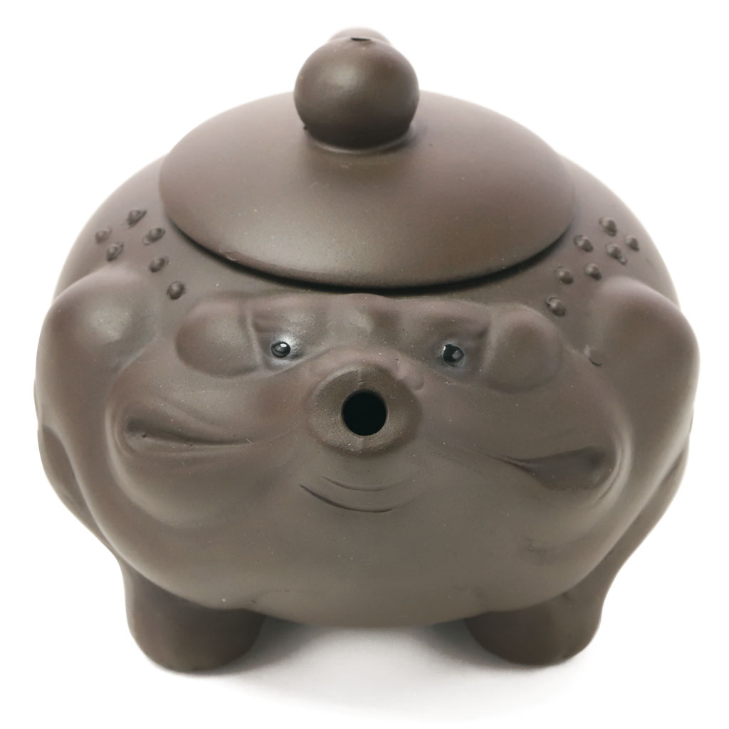 Маленький глиняный чайник приплюснутой шарообразной формы, в виде китайской трехлапой жабы, с петлеобразной ручкой, носик стилизован под мордочку. Мягко округлая крышка увенчана шариком