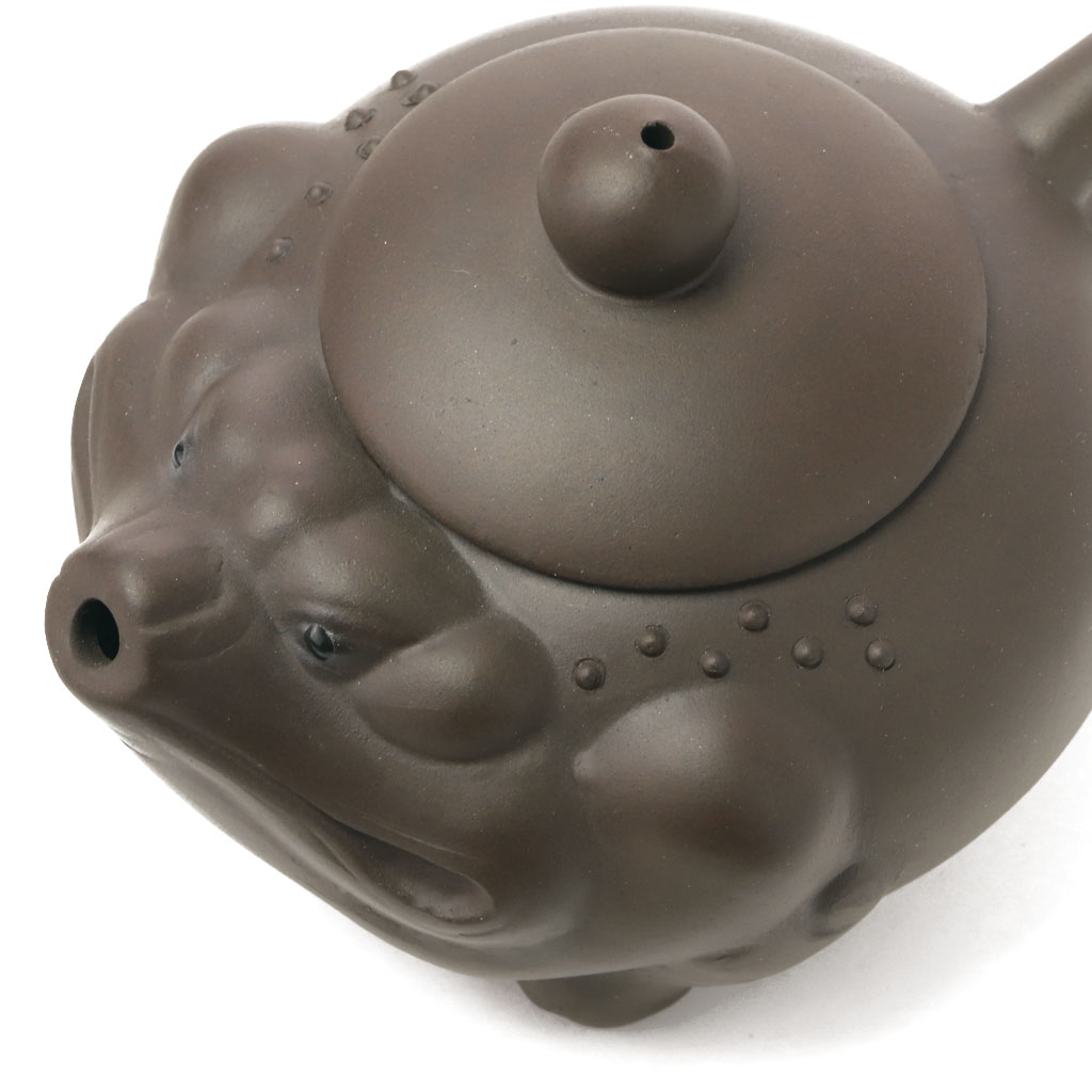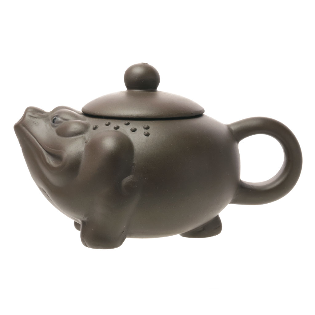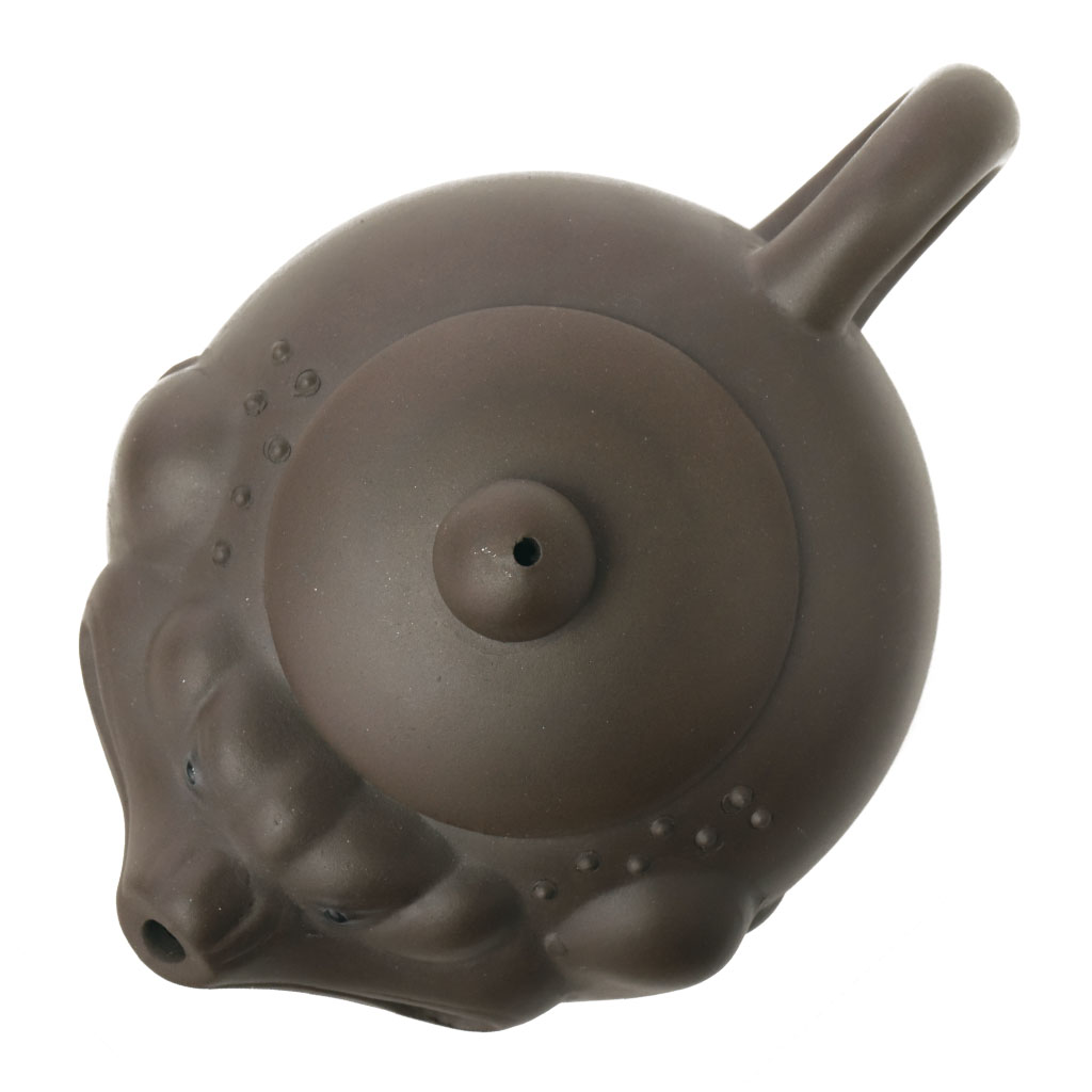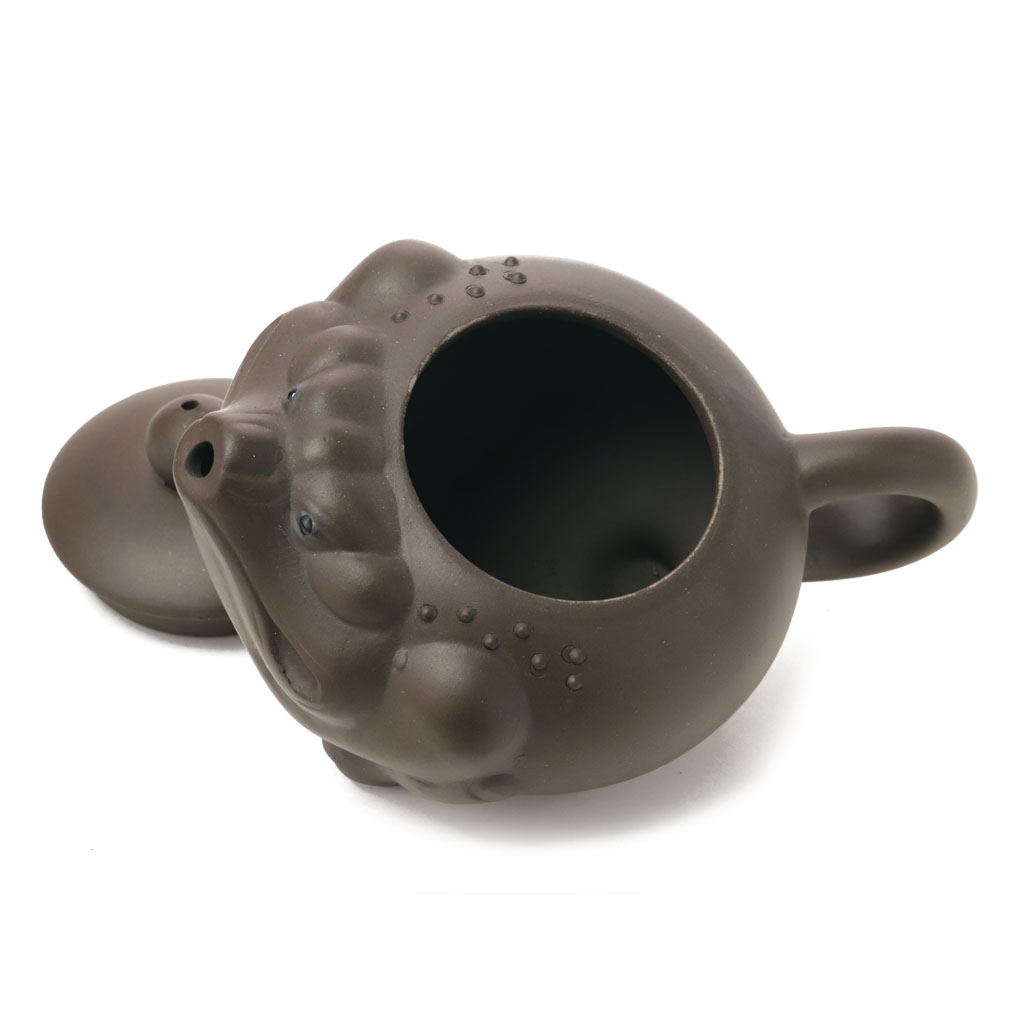 Маленький глиняный чайник приплюснутой шарообразной формы, в виде китайской трехлапой жабы, с петлеобразной ручкой, носик стилизован под мордочку. Мягко округлая крышка увенчана шариком