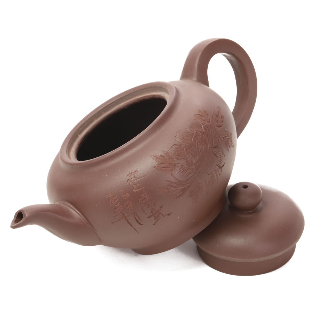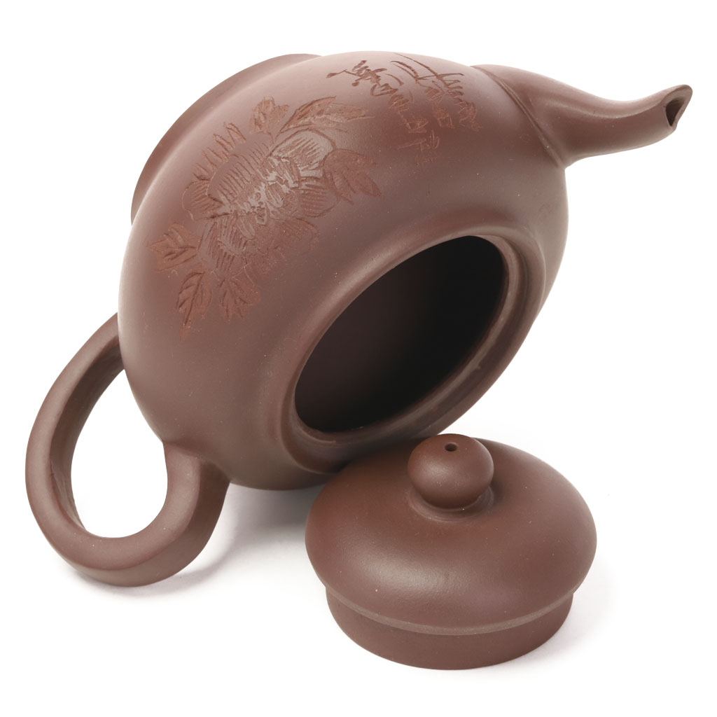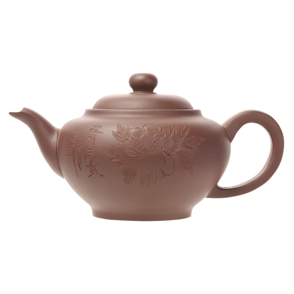 Чайник украшен контр рельефным изображением цветка шиповника и иероглифами