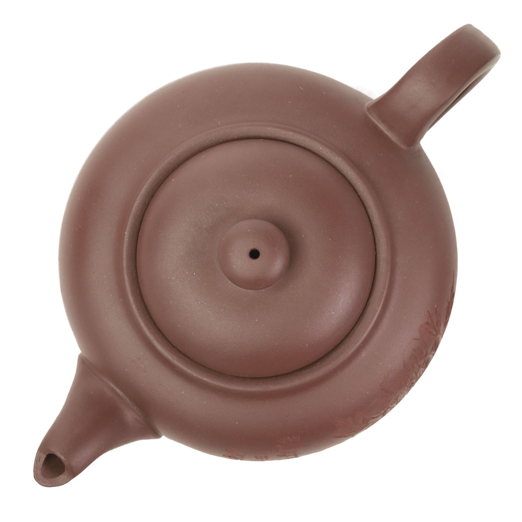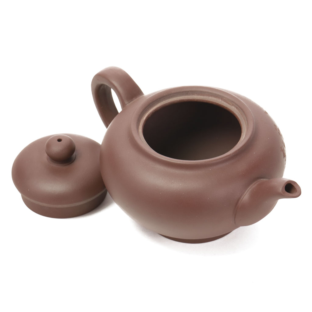 Глиняный чайник округлой формы, плавно расширяющейся в верхней трети корпуса, со слегка изогнутым носиком и четырехгранной ручкой. Округлая крышка увенчана шариком.