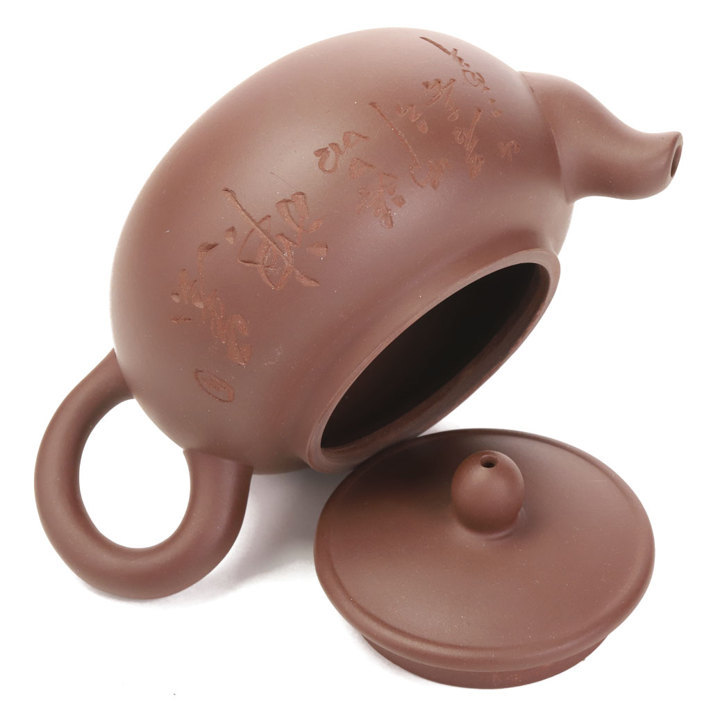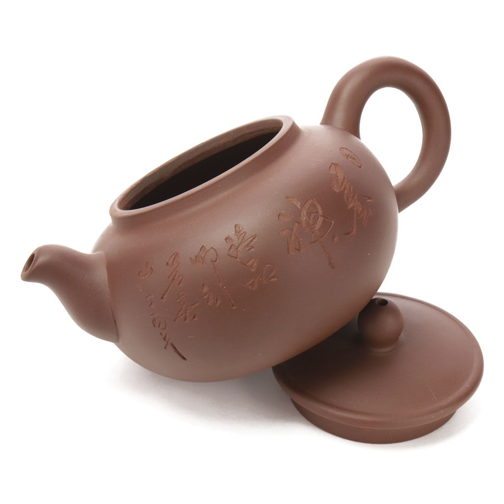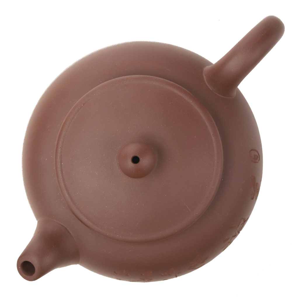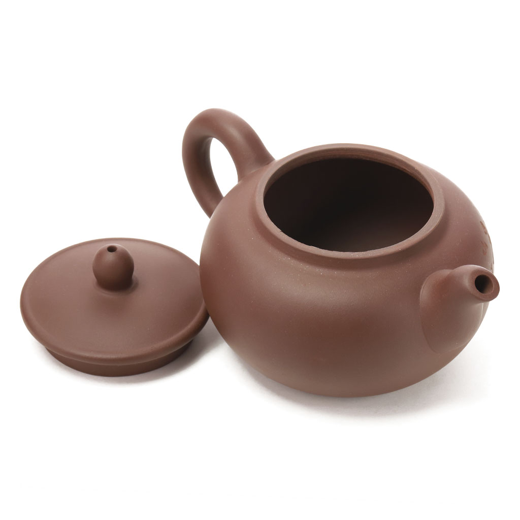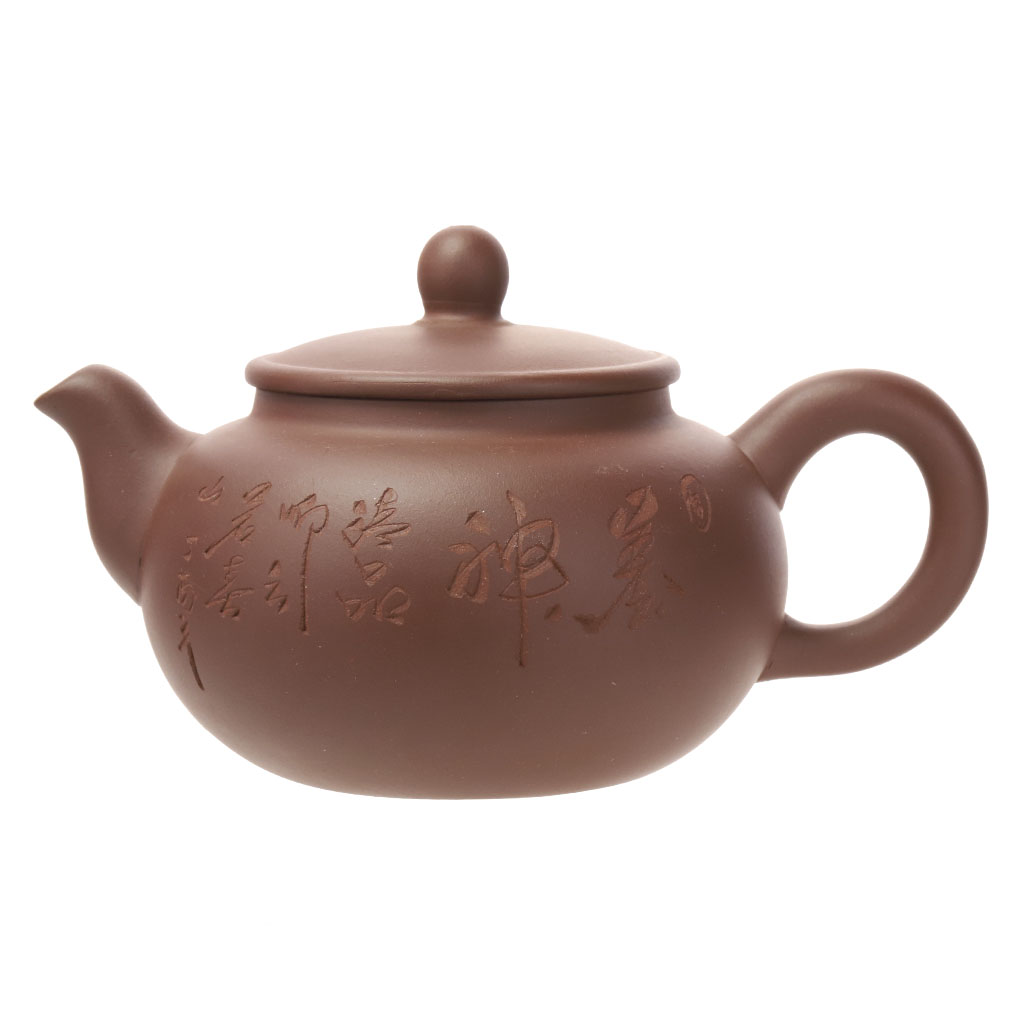 Глиняный чайник приплюснутой шарообразной формы, со слегка изогнутым носиком и петлеобразной ручкой. Слегка округлая крышка увенчана шариком.