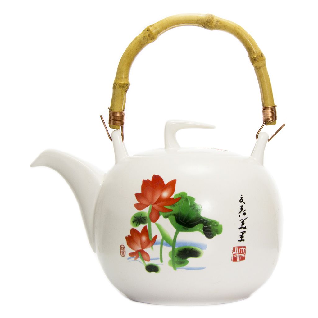 Чайник белого цвета, с живописным изображением красных цветов лотоса