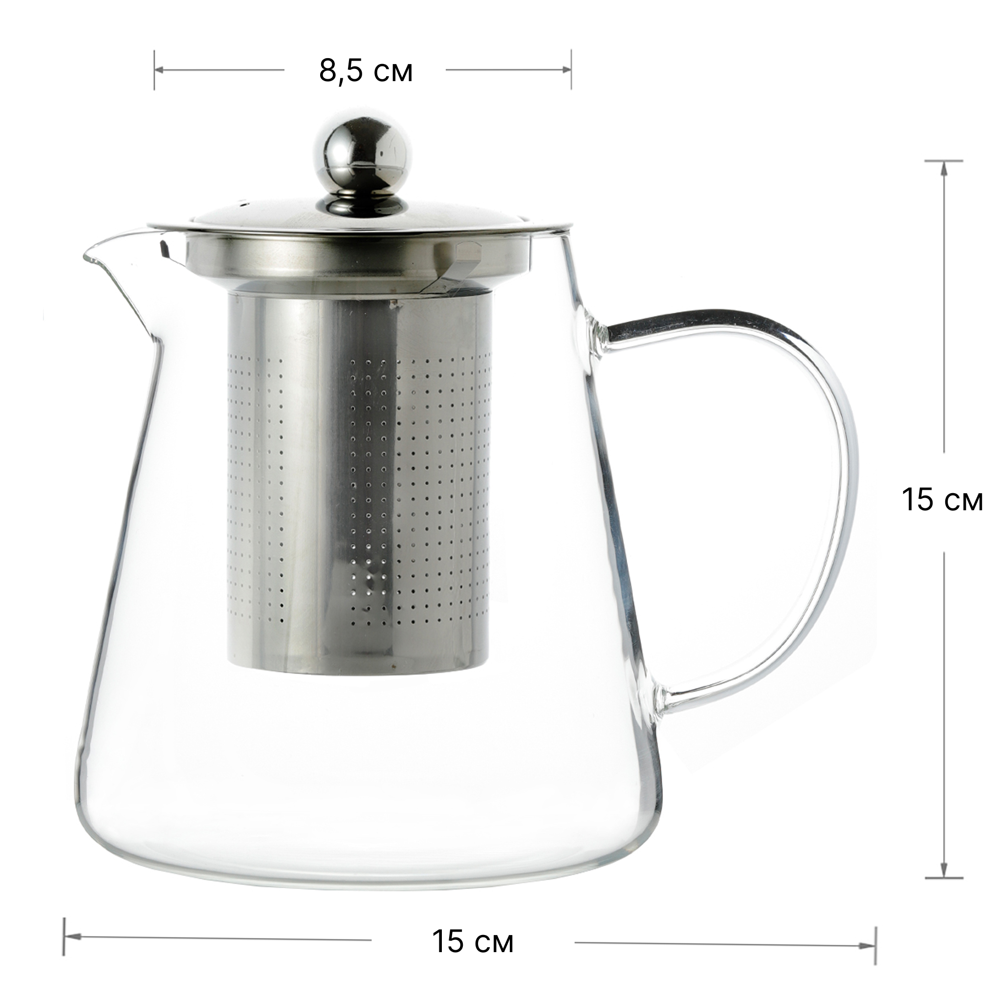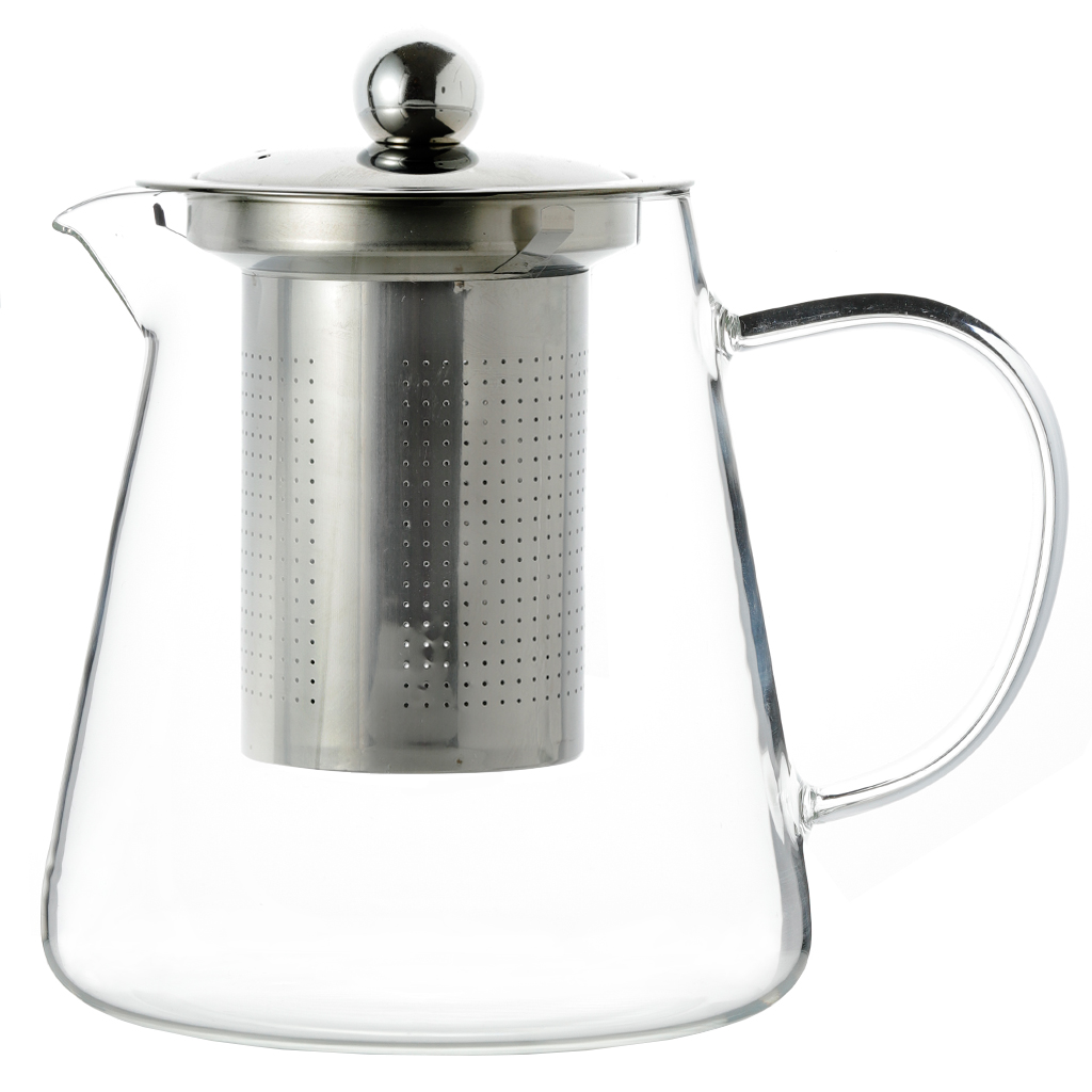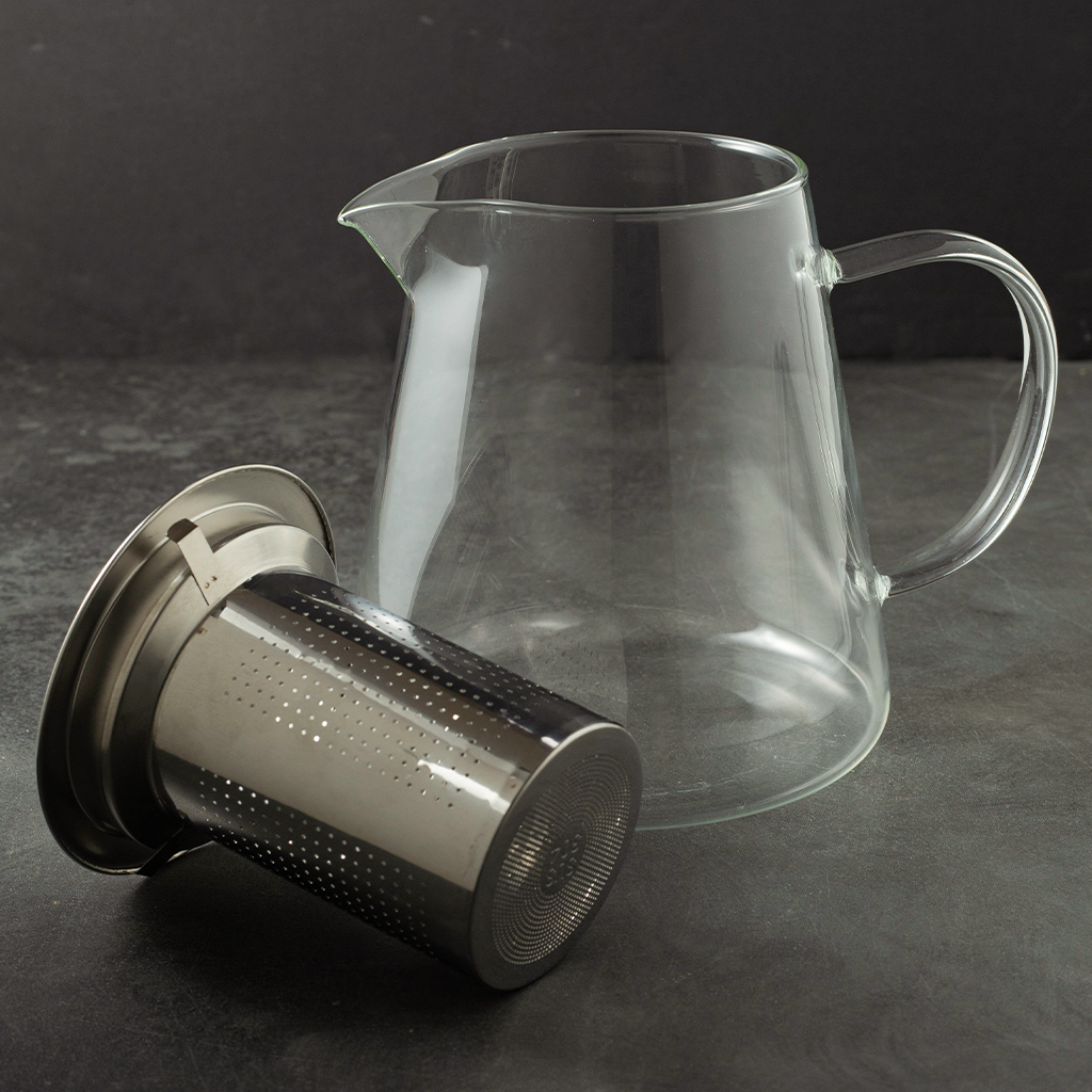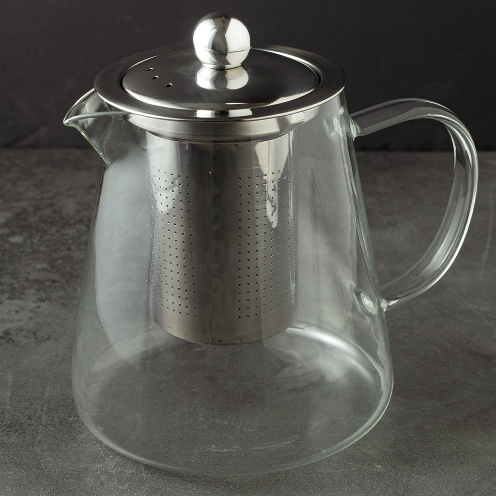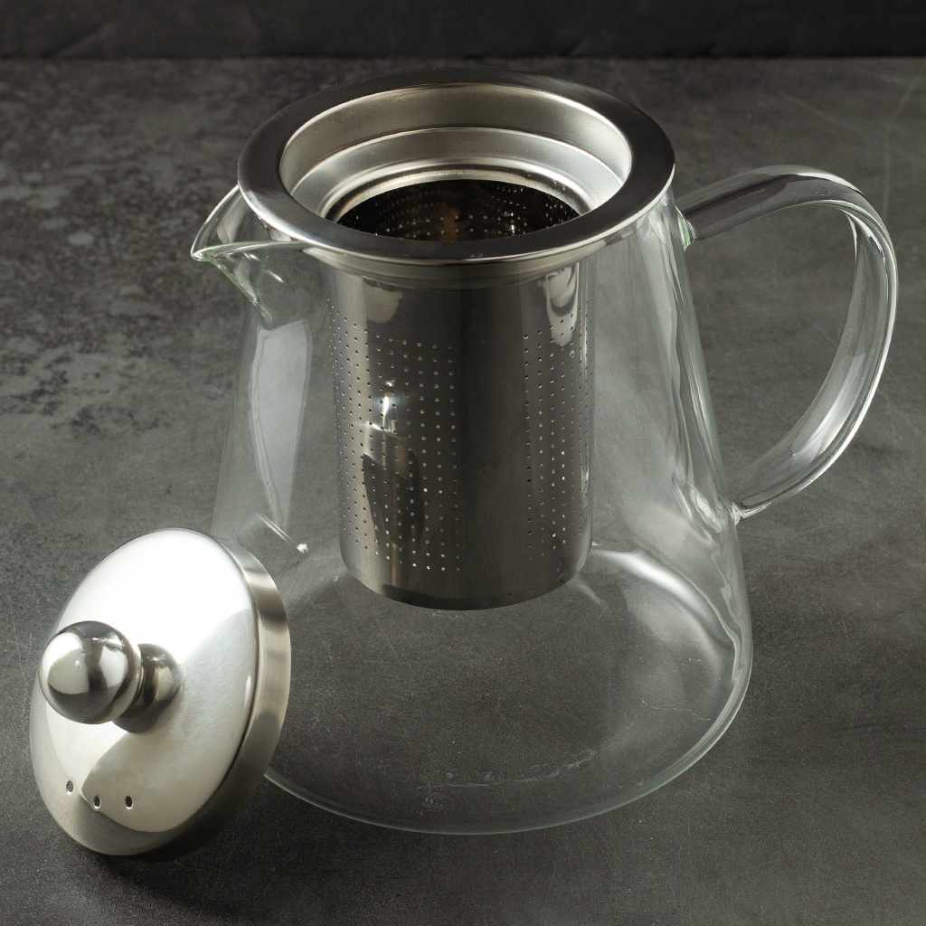 Стеклянный чайник с металлической крышкой и съёмным фильтром — удобный и практичный вариант для ежедневного использования. Подходит для листового чая и травяных сборов, легко разбирается и моется. Сдержанный дизайн хорошо впишется в любую кухню или чайную зону.