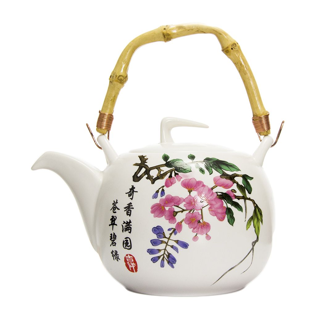 Чайник белого цвета, с живописным изображением ветки сакуры и иероглифами