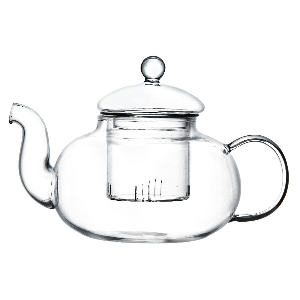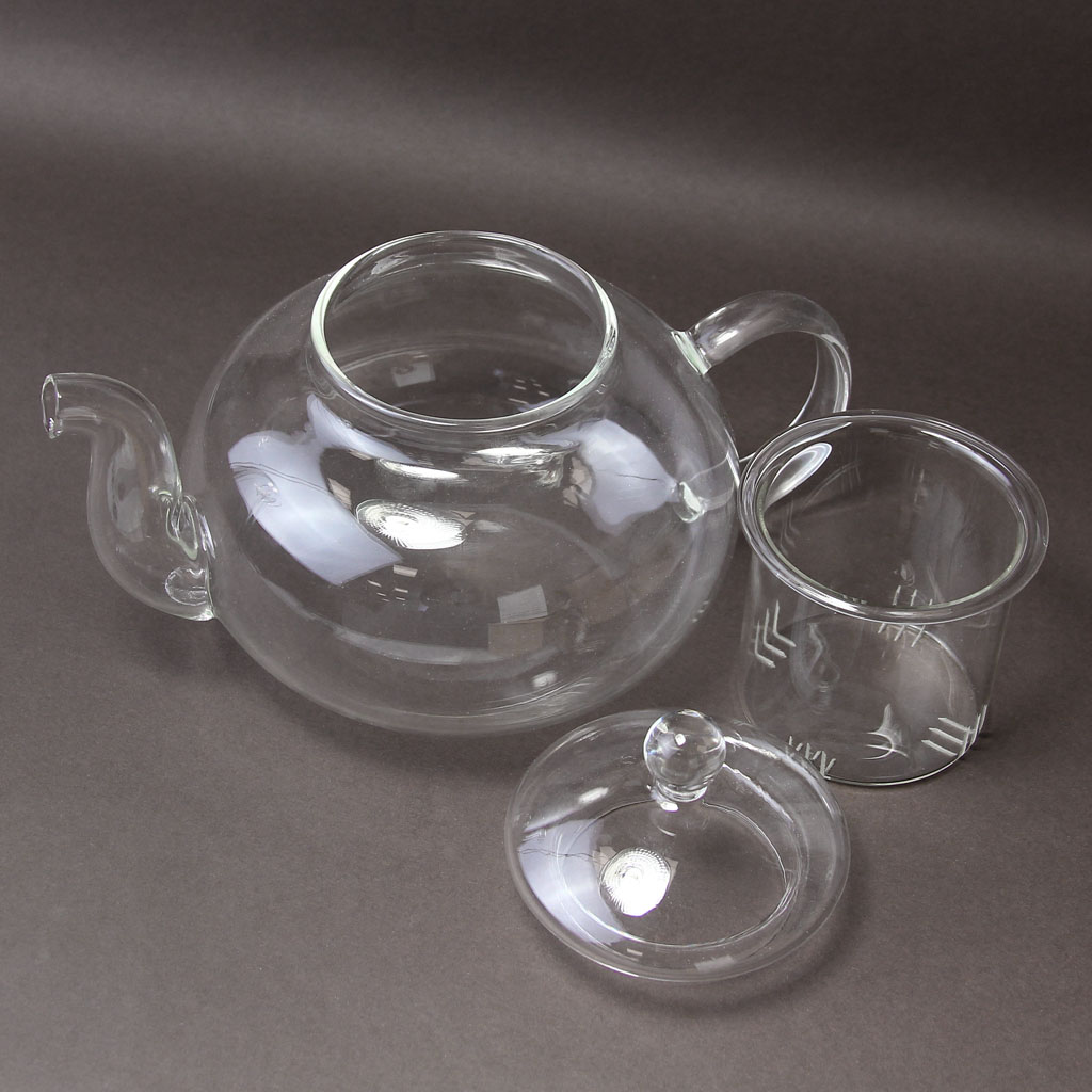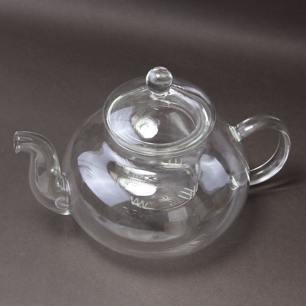 Заварочный чайник приплюснутой округлой формы, с изогнутым носиком и С-образной ручкой, со вставной стеклянной колбой, из жаропрочного стекла, объем 750 мл.