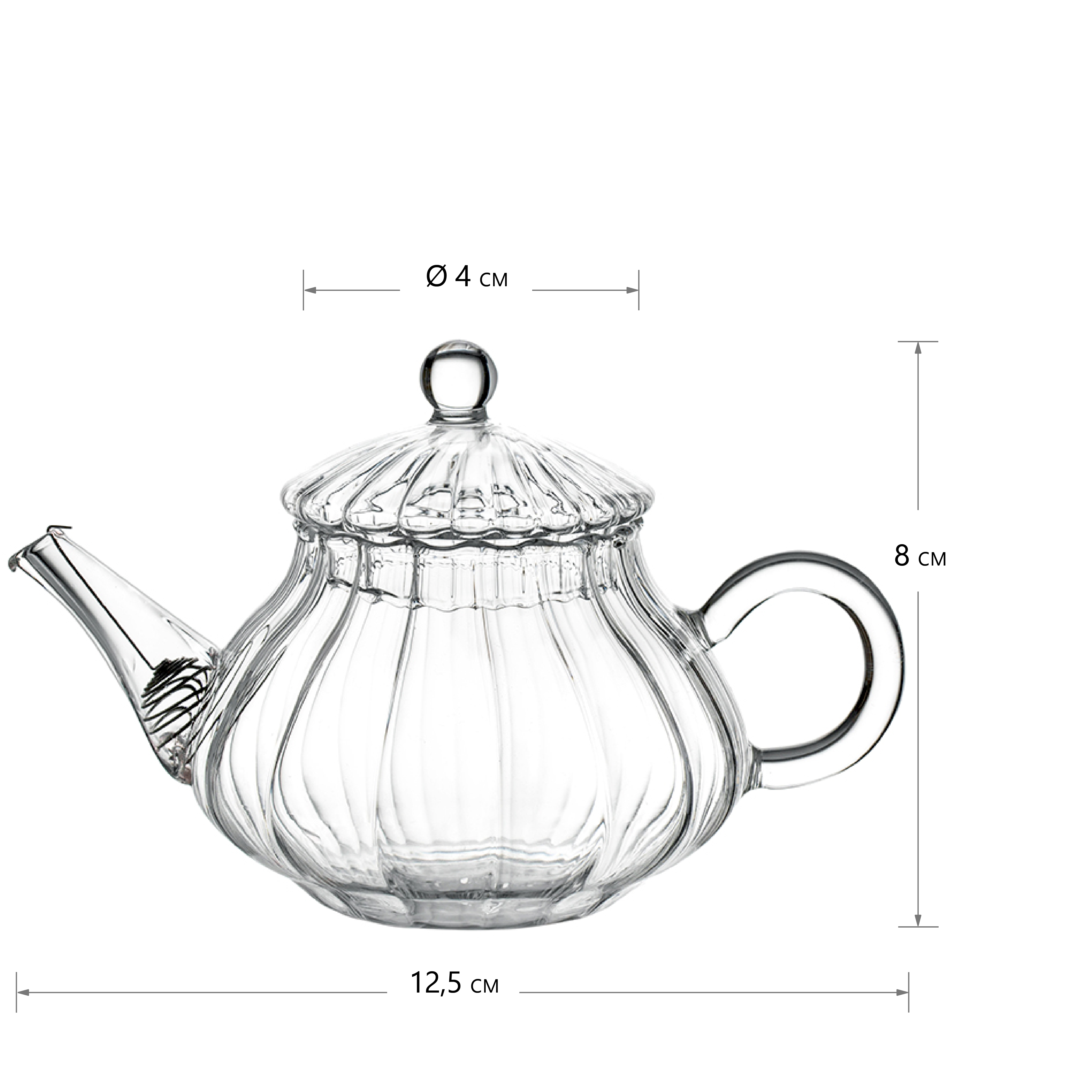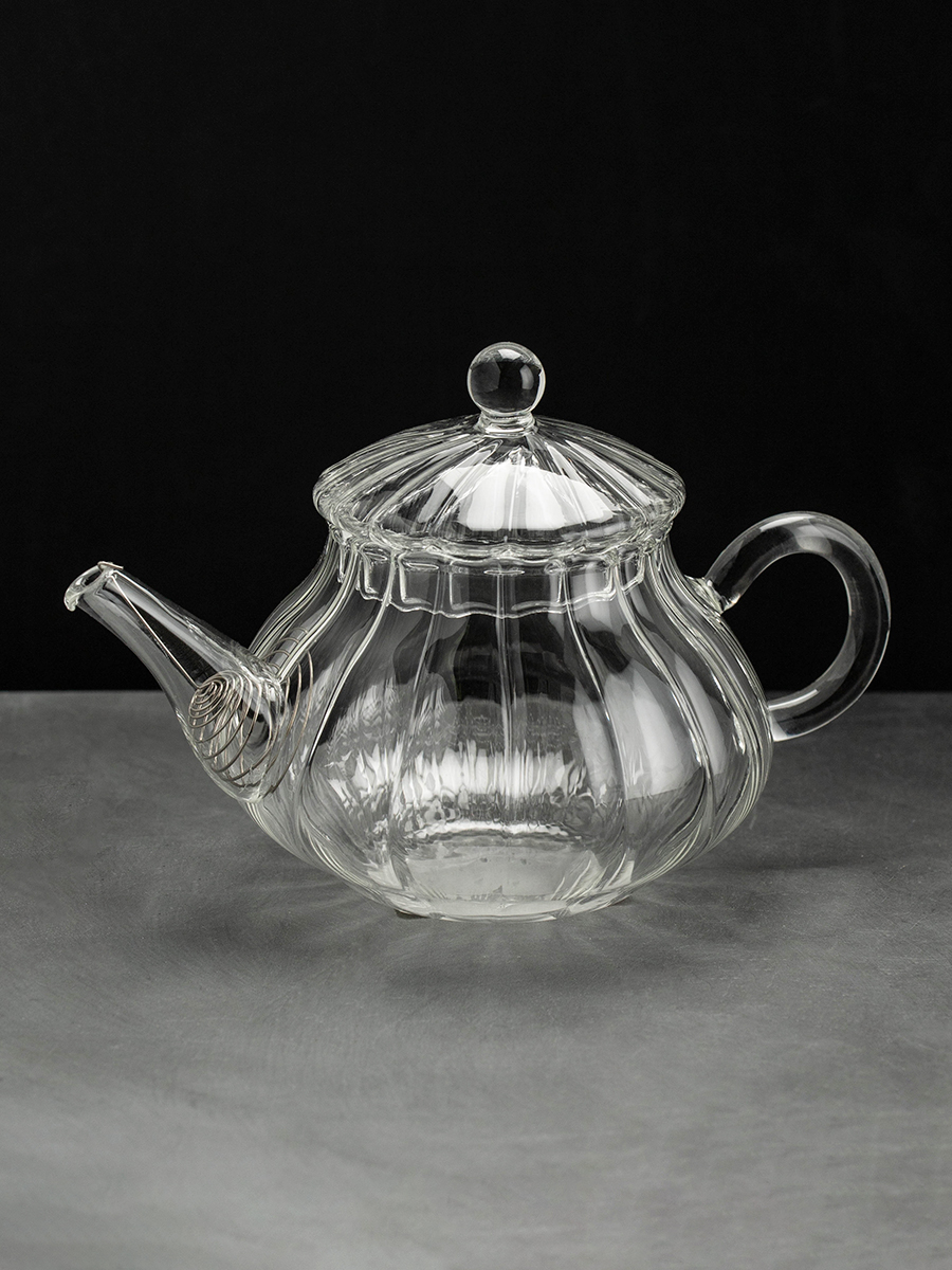 Заварочный чайник рифленый, грушевидной формы с коническим носиком, из жаропрочного стекла, с сито пружинкой, объем 100 мл.