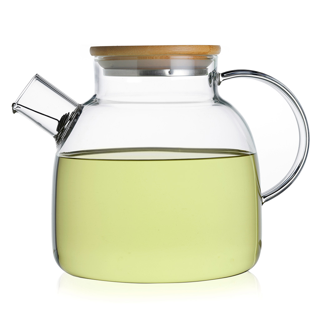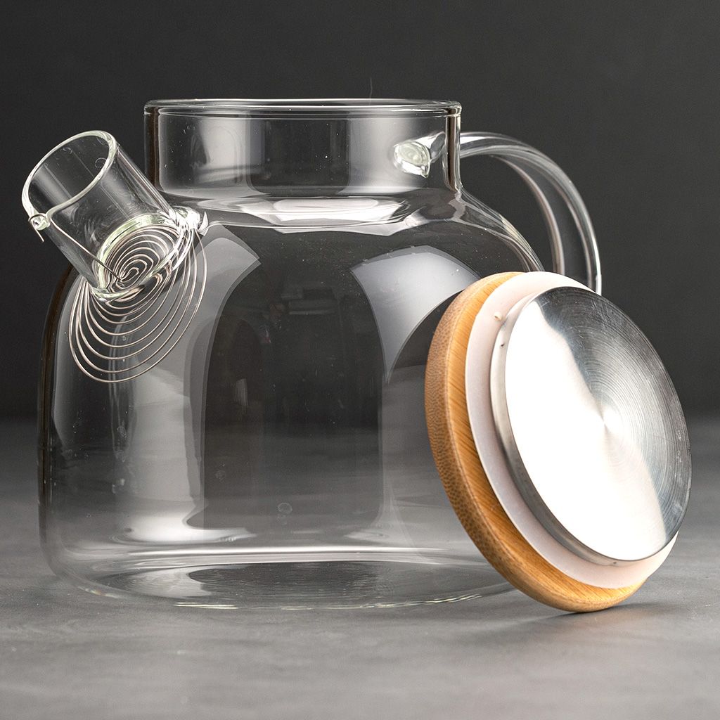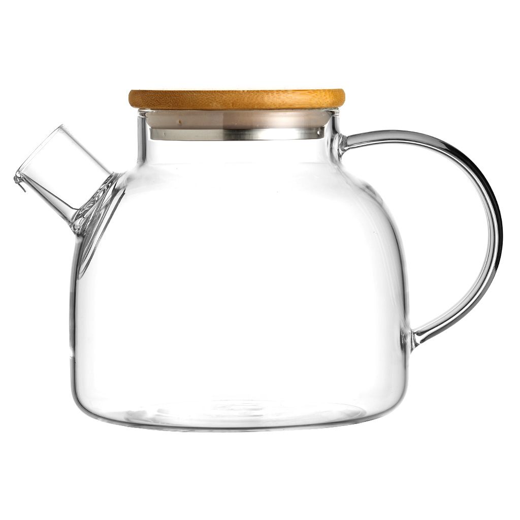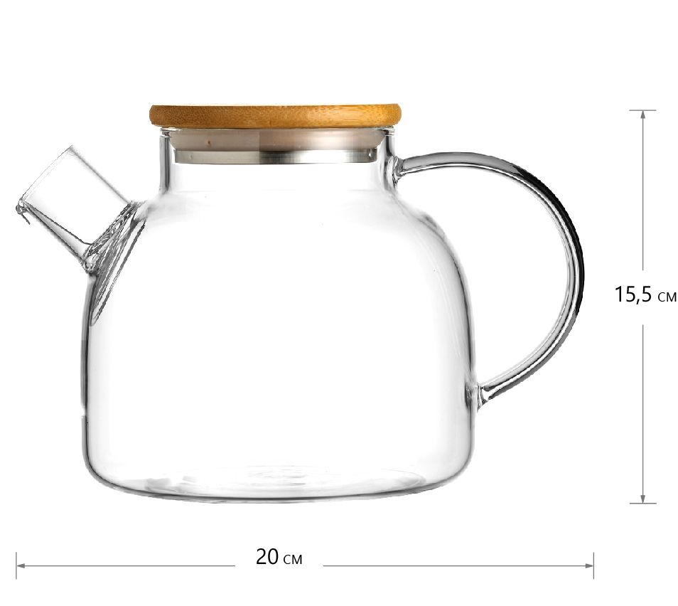 Заварочный чайник грушевидной формы, с коротким цилиндрическим носиком с пружинкой, широкой С-образной ручкой, из жаропрочного стекла, объем 1200 мл. Крышка деревянная, снизу окованная металлом с силиконовым ободком.
