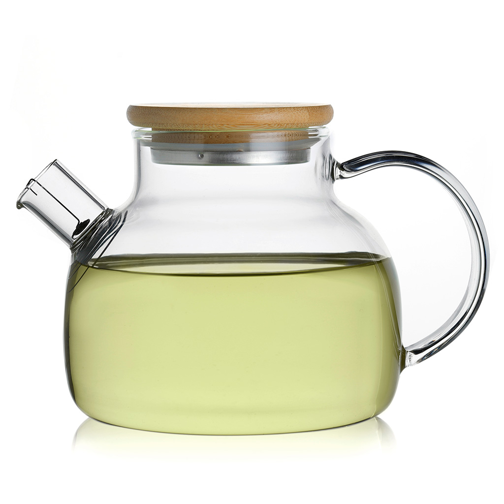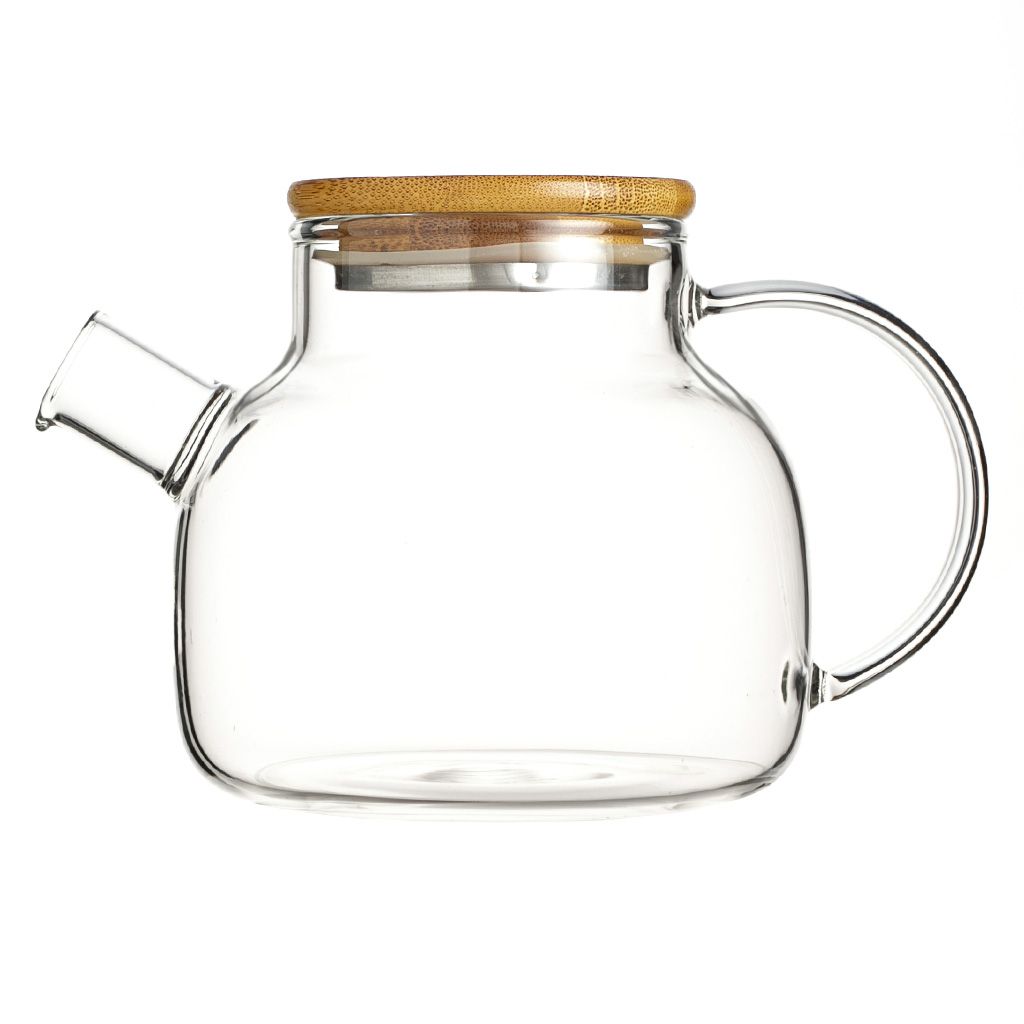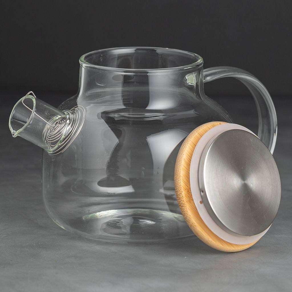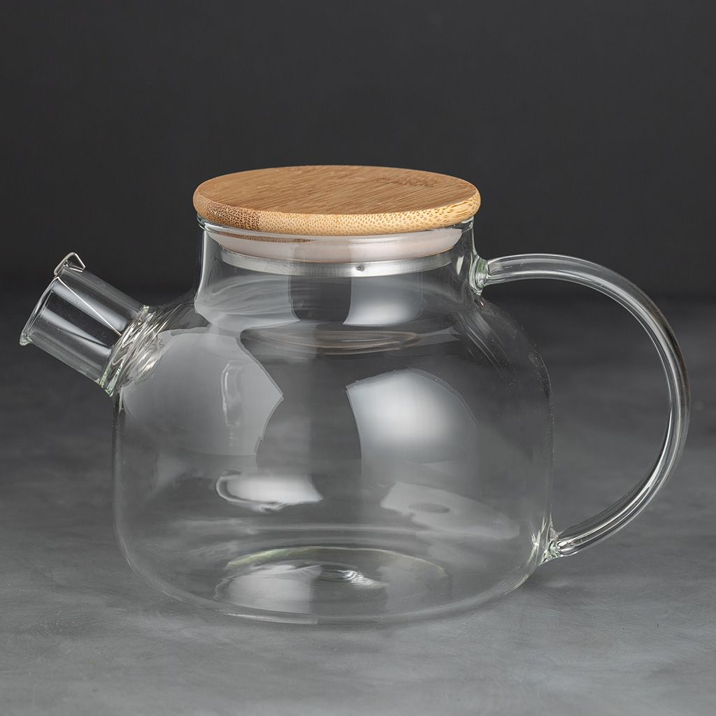 Заварочный чайник грушевидной формы, с коротким цилиндрическим носиком с пружинкой, широкой С-образной ручкой, из жаропрочного стекла, объем 600 мл. Крышка деревянная, снизу окованная металлом с силиконовым ободком.