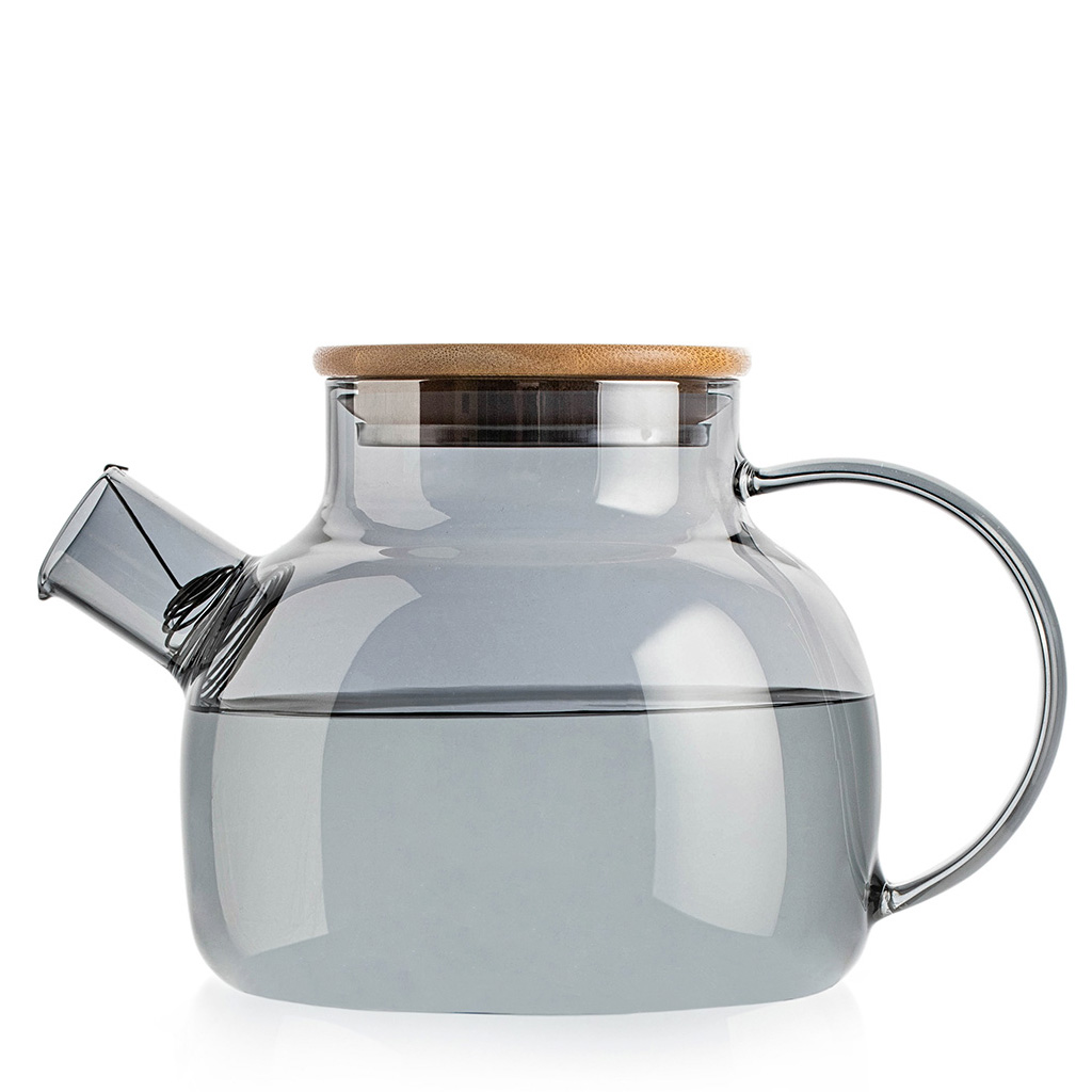 Заварочный чайник грушевидной формы, с коротким цилиндрическим носиком с пружинкой, широкой С-образной ручкой, из жаропрочного стекла, объем 900 мл. Крышка деревянная, снизу окованная металлом с силиконовым ободком. Цвет: графит