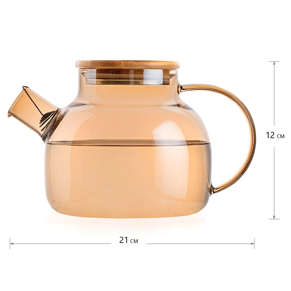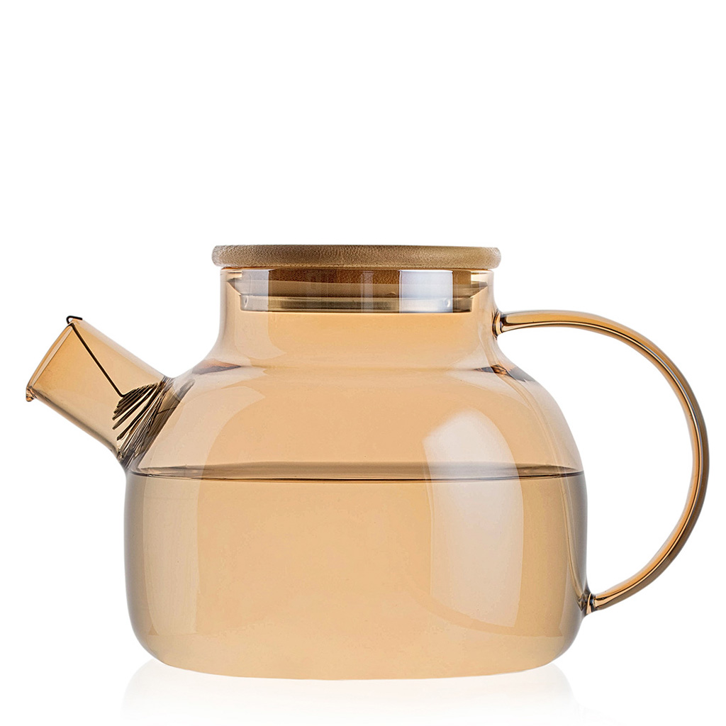 Заварочный чайник грушевидной формы, с коротким цилиндрическим носиком с пружинкой, широкой С-образной ручкой, из жаропрочного стекла, объем 900 мл. Крышка деревянная, снизу окованная металлом с силиконовым ободком. Цвет: карамель / золото.