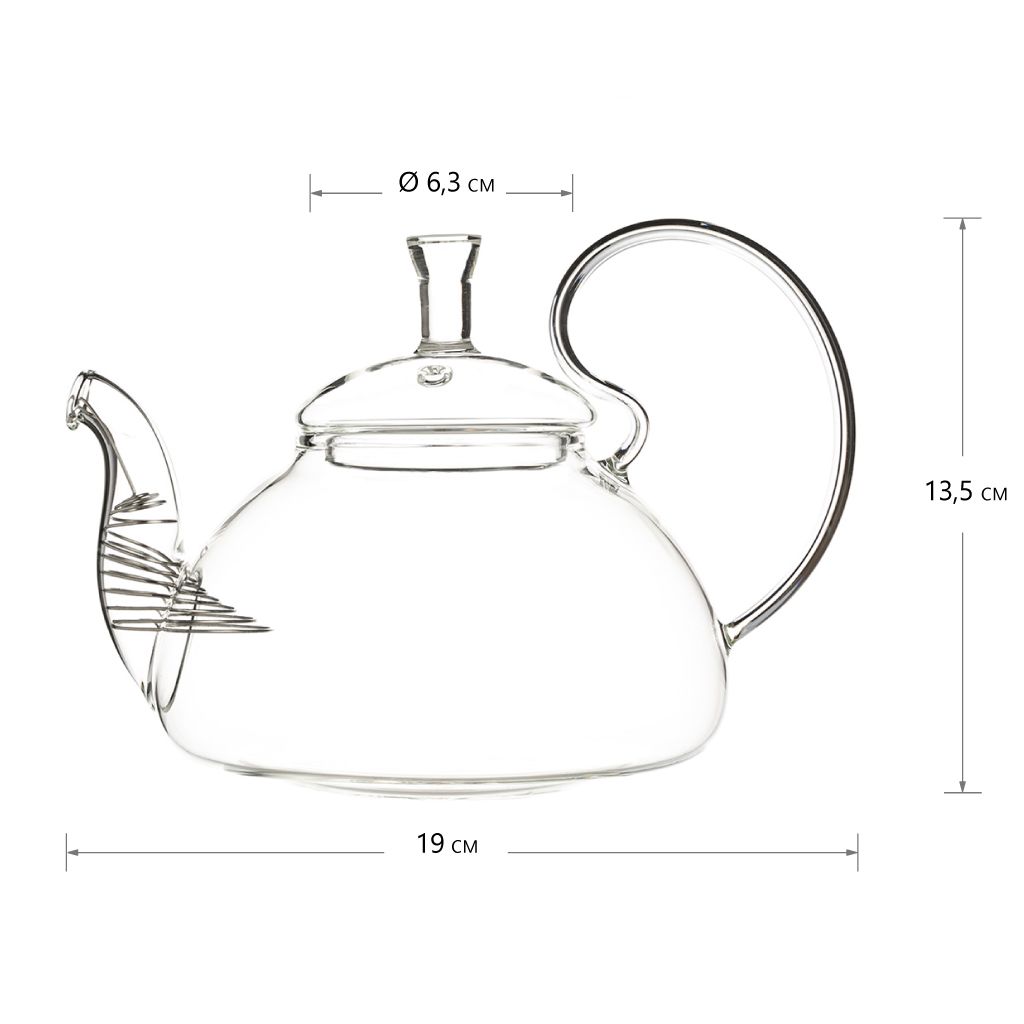 Заварочный чайник грушевидной приплюснутой формы, с изогнутым носиком и высокой изогнутой ручкой, со спиралевидным ситечком в носике, из жаропрочного стекла, объем 750 мл.