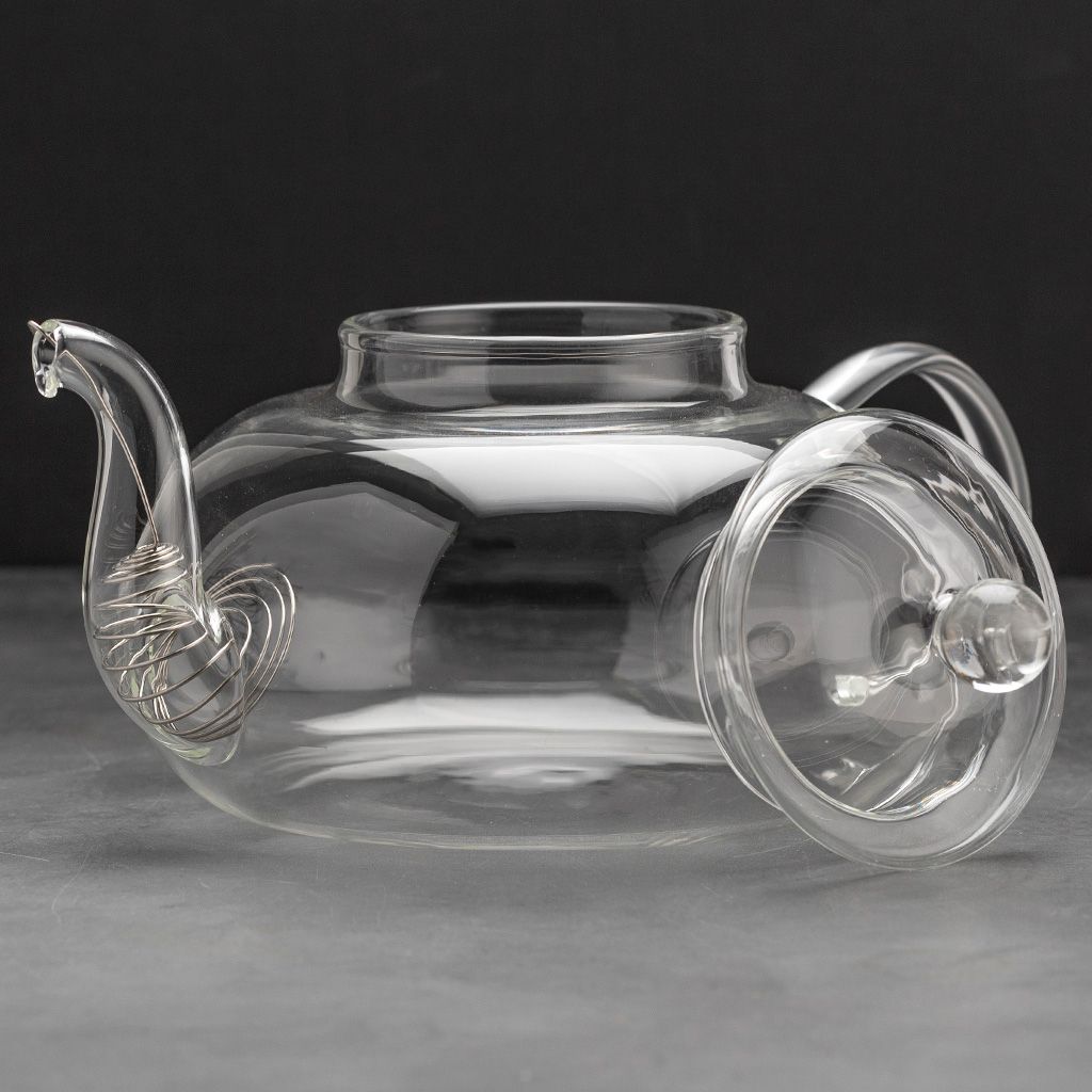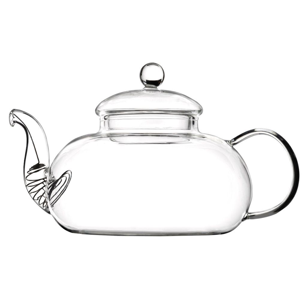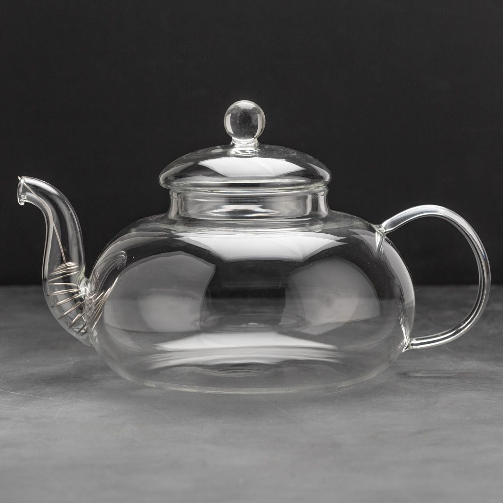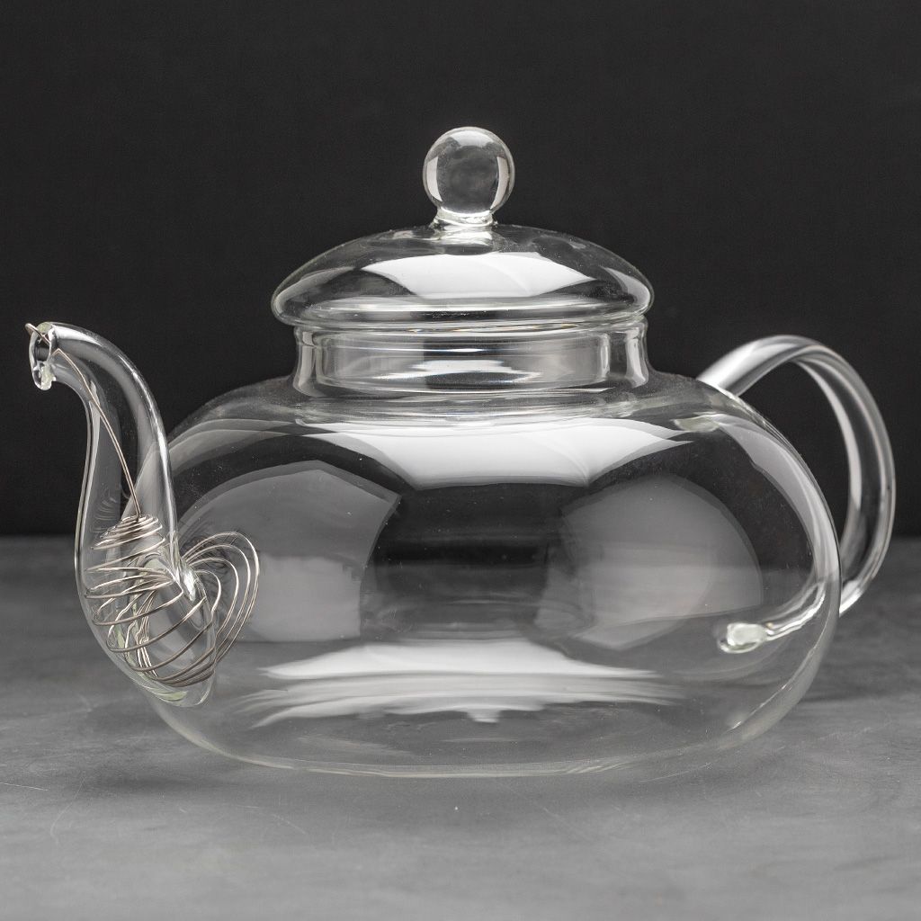 Заварочный чайник приплюснутой округлой формы, с коротким прямым носиком, из жаропрочного стекла, со спиралевидным ситечком в носике, объем 1,2 л.
