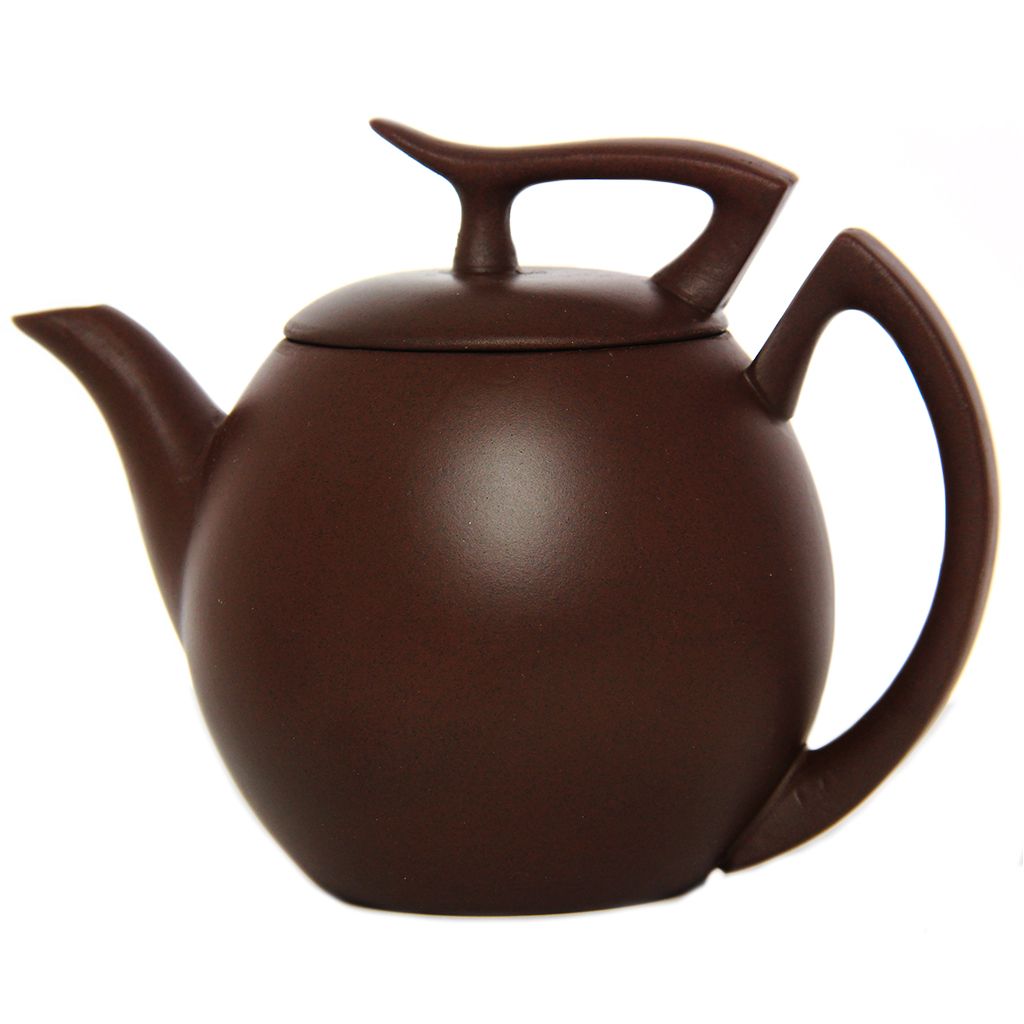 Глиняный чайник вытянутой шарообразной формы, со слегка изогнутым носиком. Ручка на корпусе и крышке составляет волнообразную линию