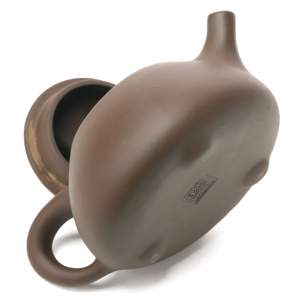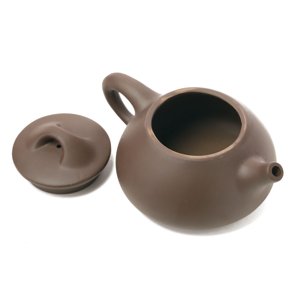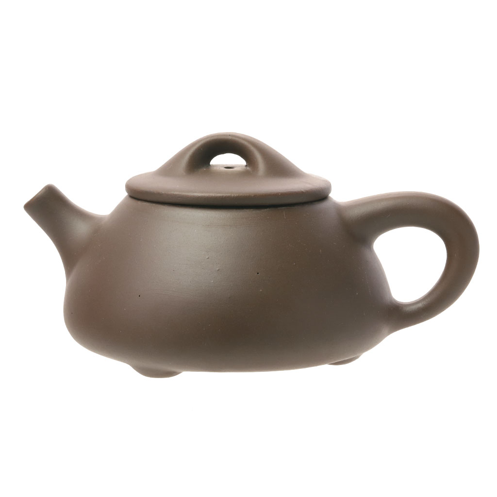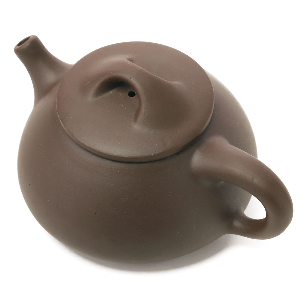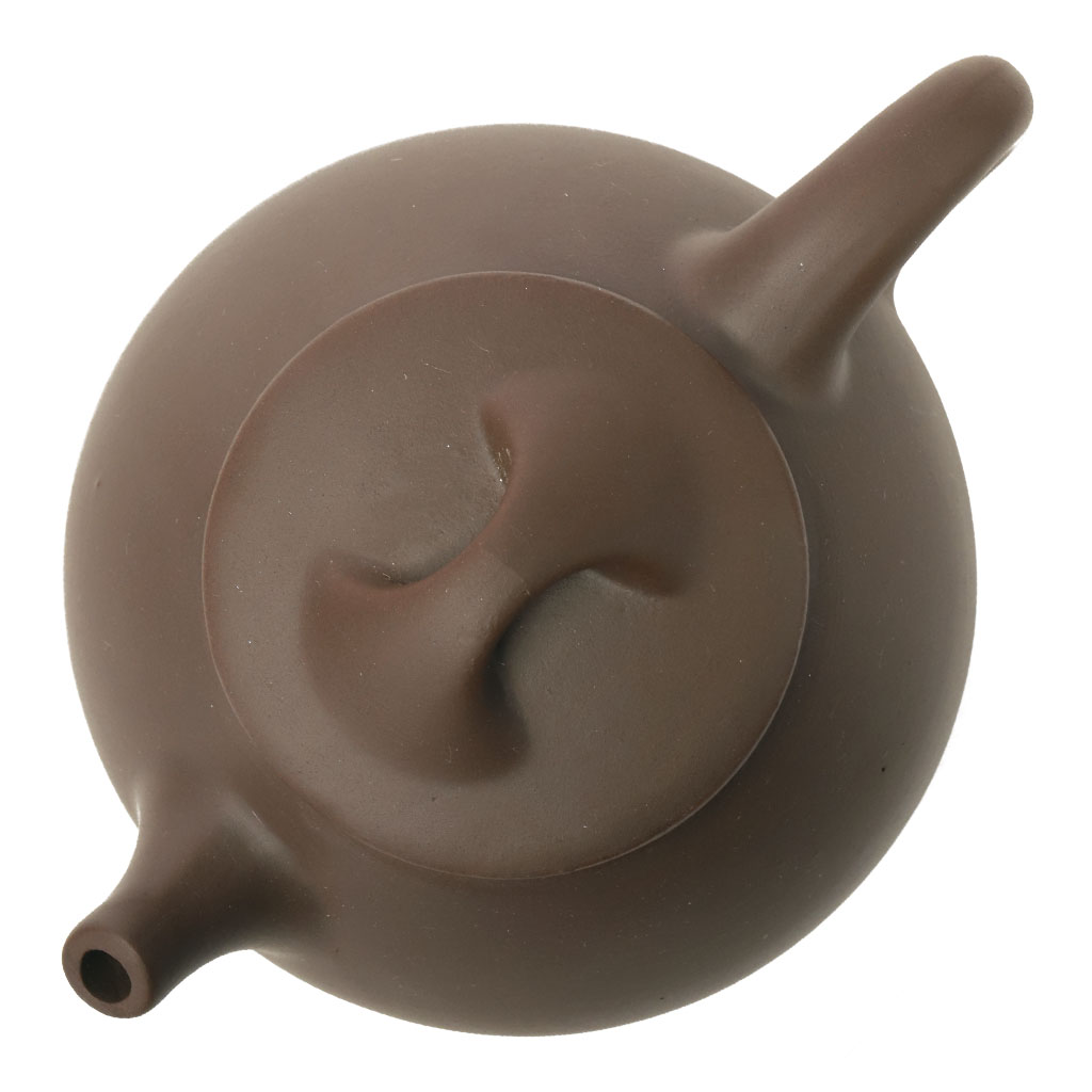 Маленький глиняный чайник округлой формы, мягко расширяющейся к низу, носик и ручка плавно переходят в корпус без резкой границы. Поверхность плоской крышки перетекает в ручку