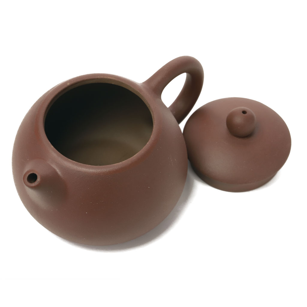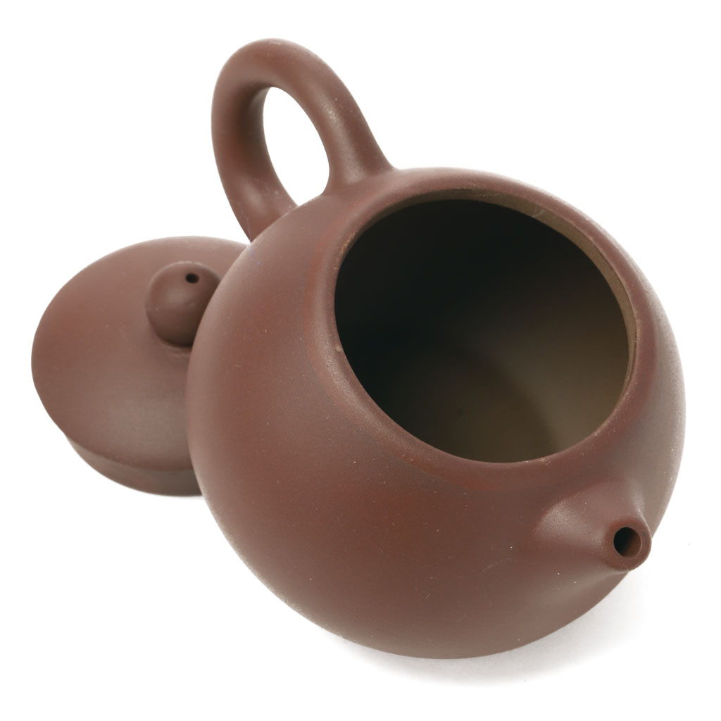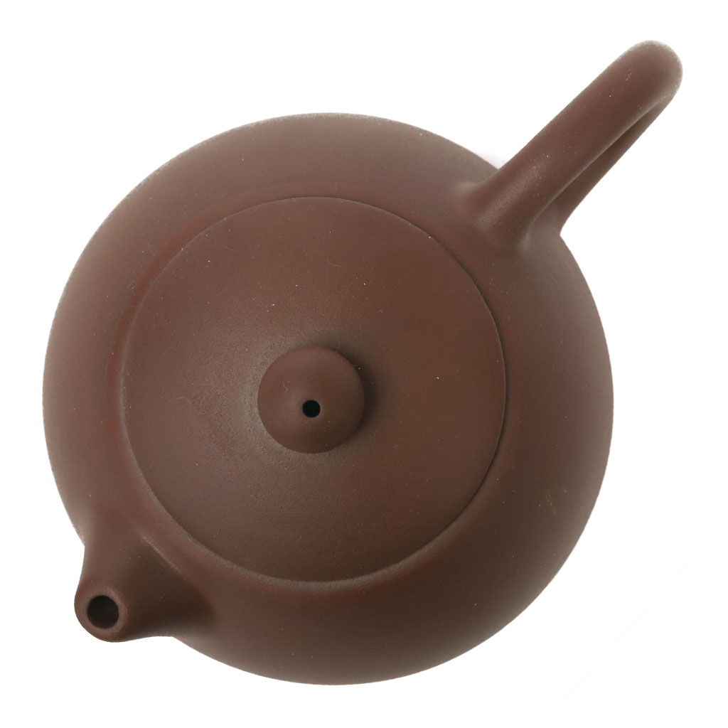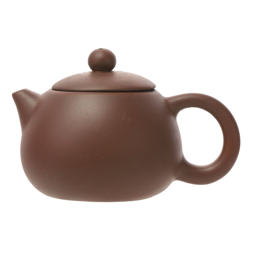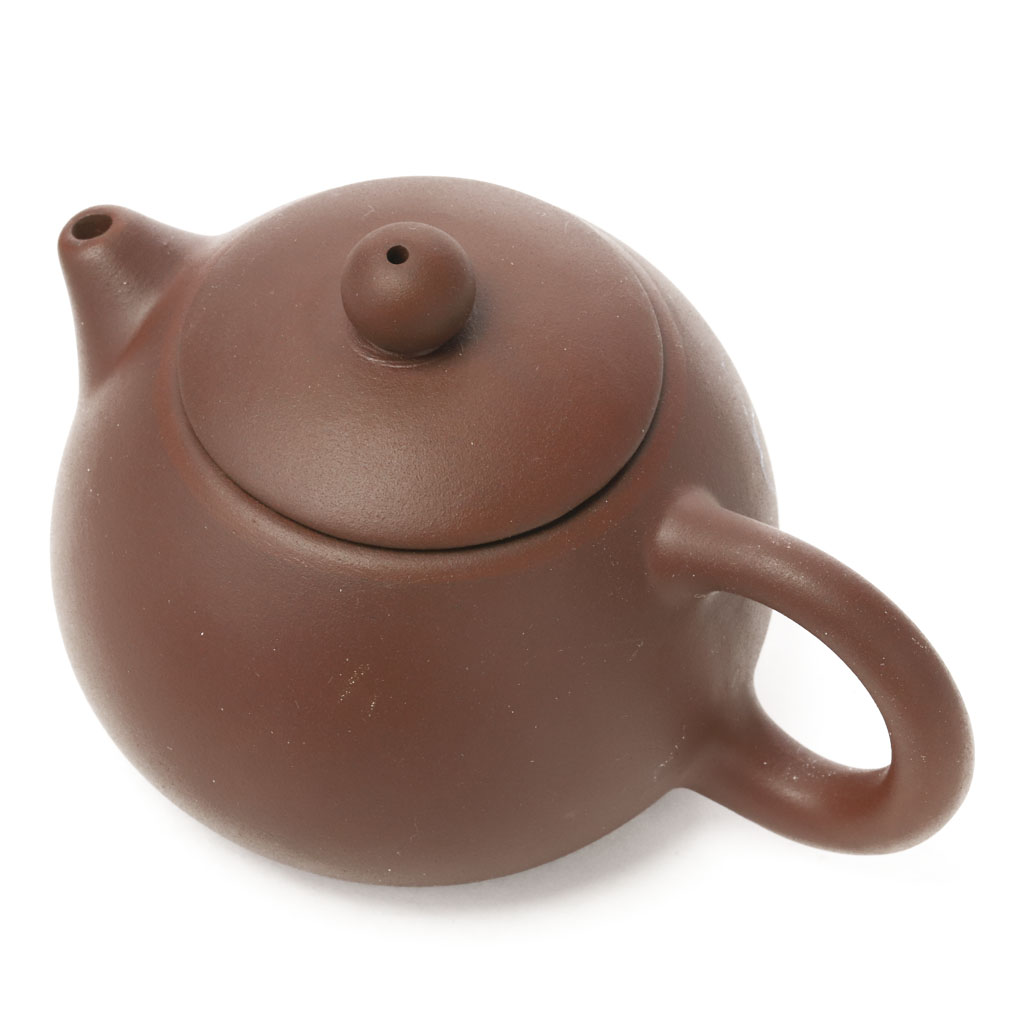 Маленький глиняный чайник шарообразной слегка приплюснутой формы, с коротким носиком и ручкой, плавно сливающимися с корпусом. Крышка увенчана шариком