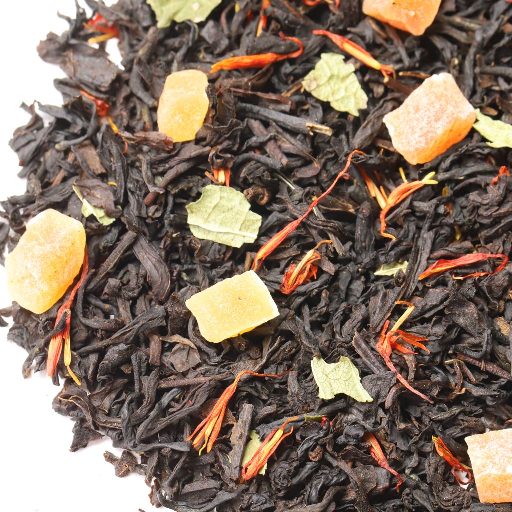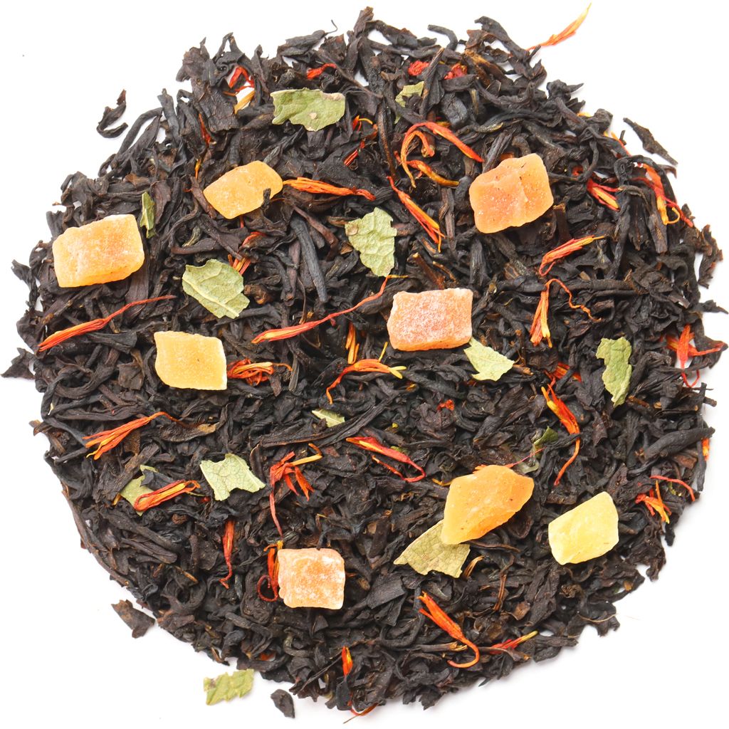 Чай черный цейлонский, кусочки папайи, лепестки сафлора, листья смородины, аромат персика.