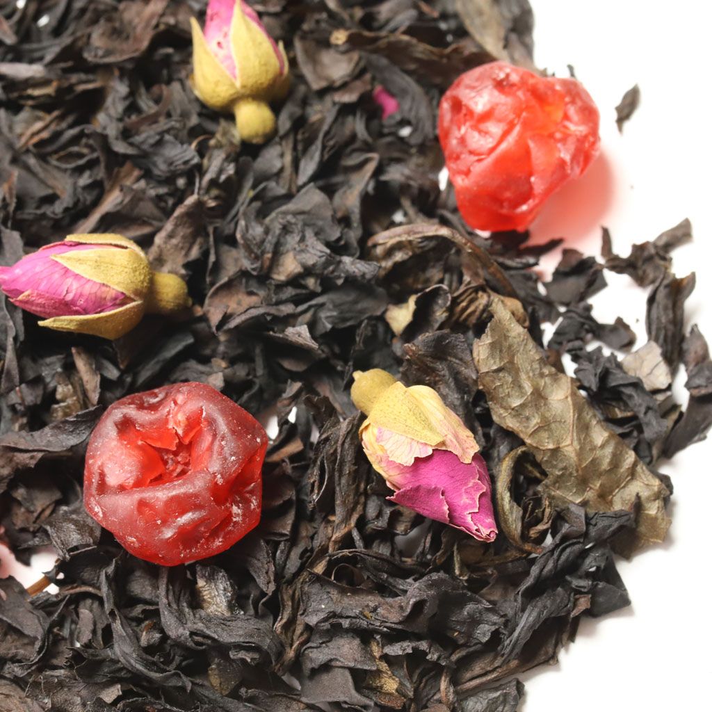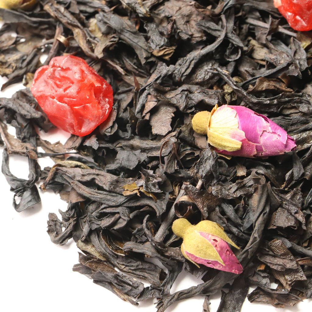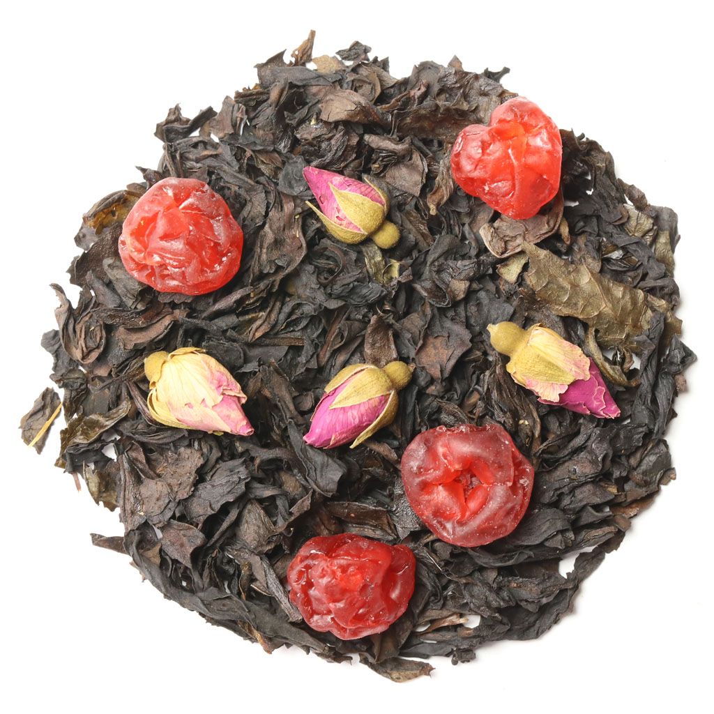 Крупный слегка скрученный сухой лист, от почти черного до зеленоватого, дополнен бутонами роз и ягодами вишни.