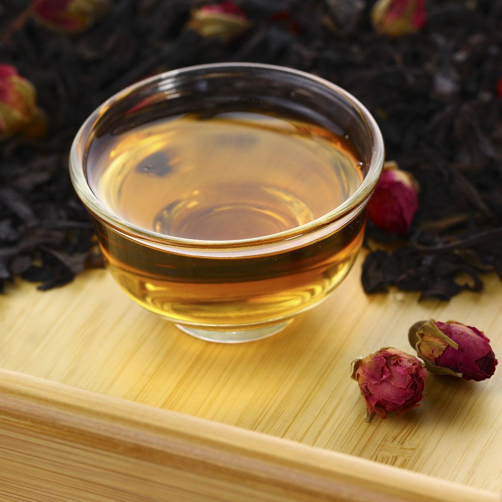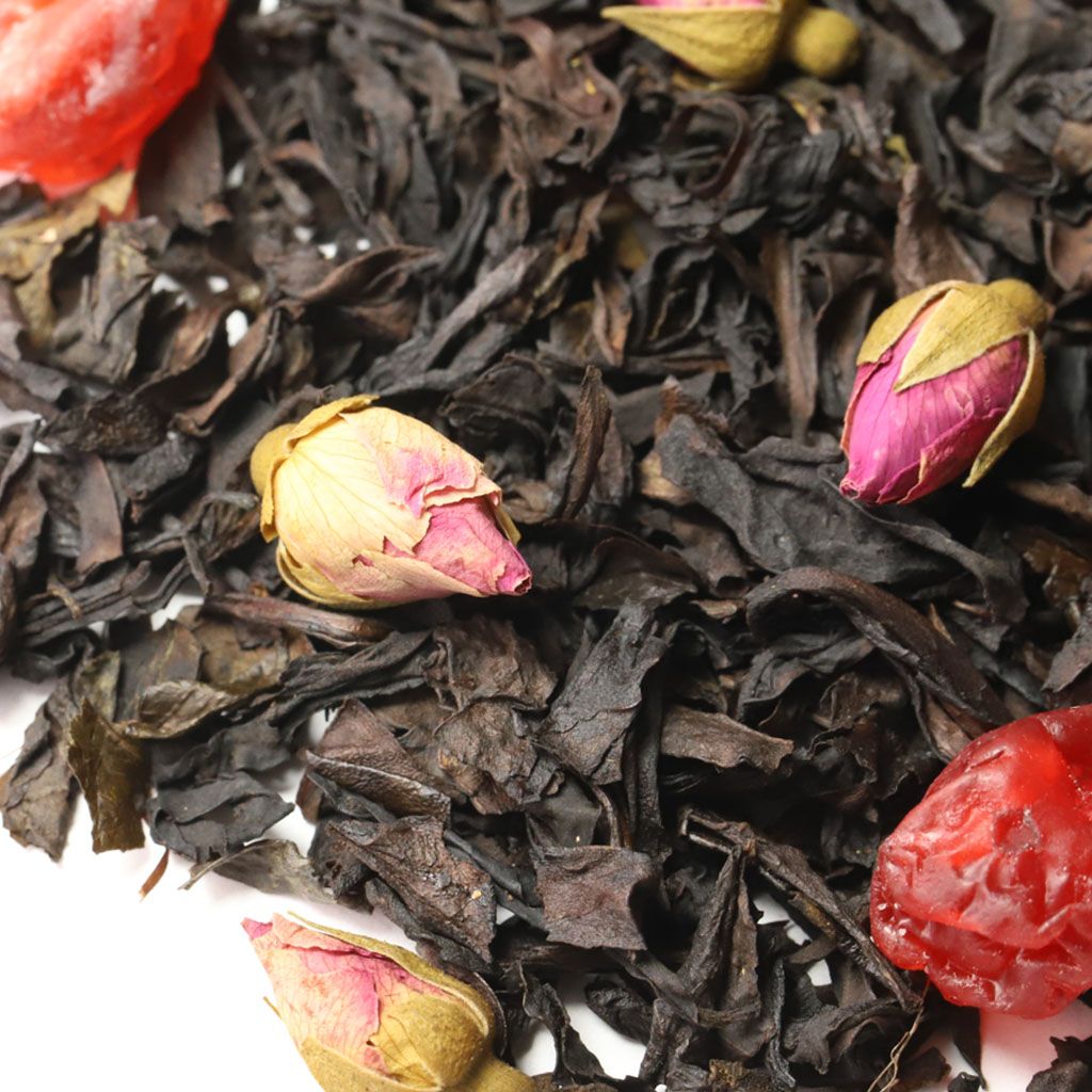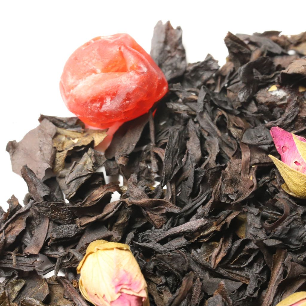 Крупный слегка скрученный сухой лист, от почти черного до зеленоватого, дополнен бутонами роз и ягодами вишни.
