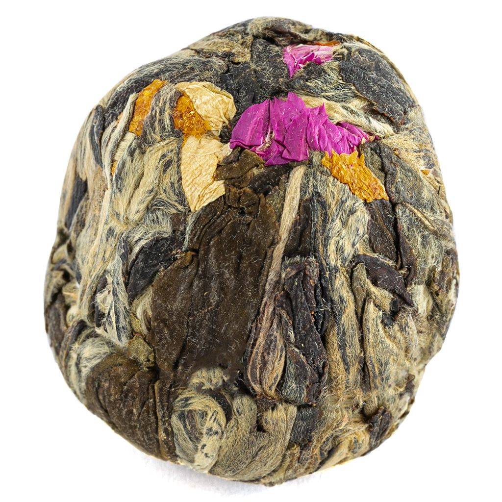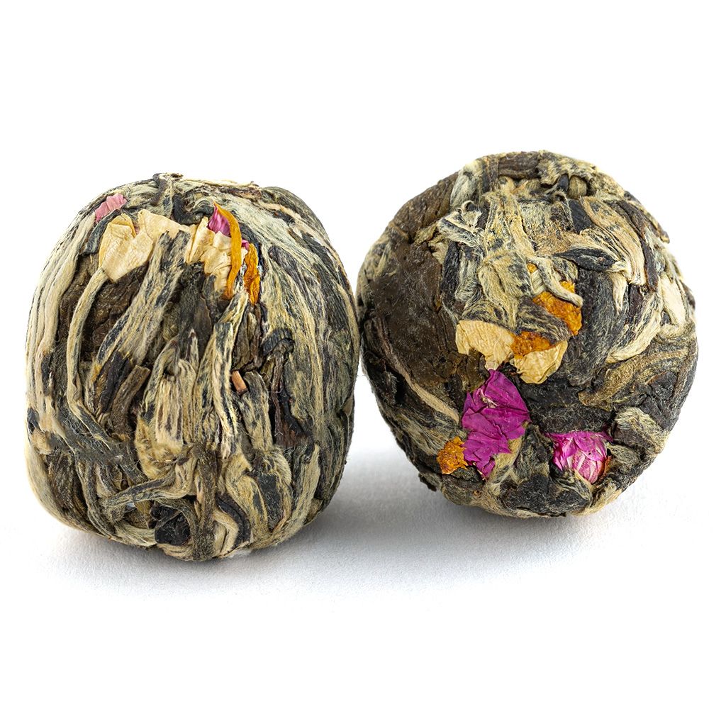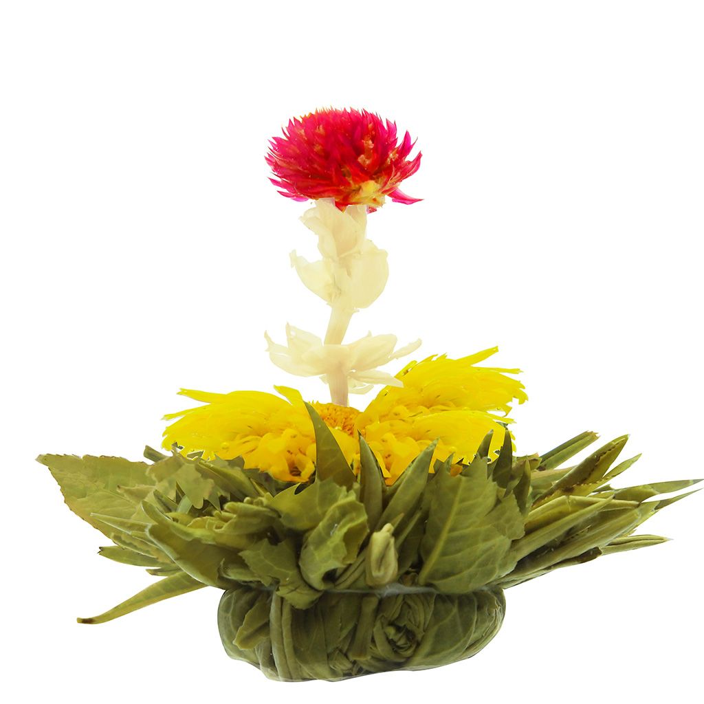 Отличительной чертой этого чая является то, что в нем идеально сочетаются листья белого и зеленого чая, а также нежный вкус цветков жасмина, розового клевера и желтой хризантемы. Благодаря аромату манго, напиток приобретает еще большую глубину и сладкий обволакивающий шлейф. Для создания напитка используют чайные листья из китайской провинции Фуцзянь. Листья чая связывают в импровизированный бутон, в центр которого помещают цветы розового клевера, жасмина и хризантемы. Процесс заваривания этой композиции это поистине неповторимое зрелище: плотный зеленый шарик распускается в невероятной красоты композицию, насыщая настой янтарным сиянием и неповторимым вкусом.