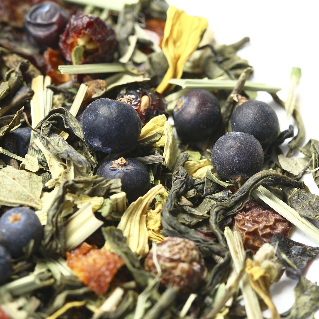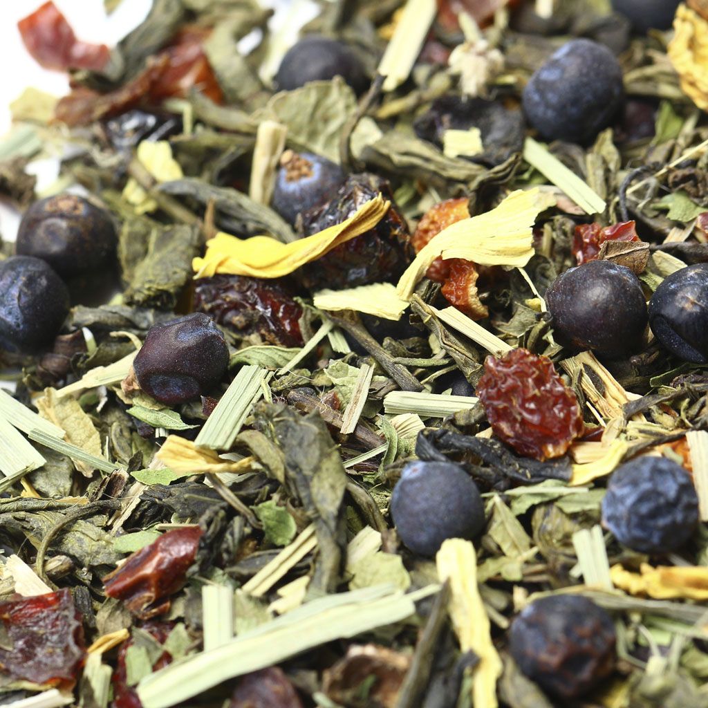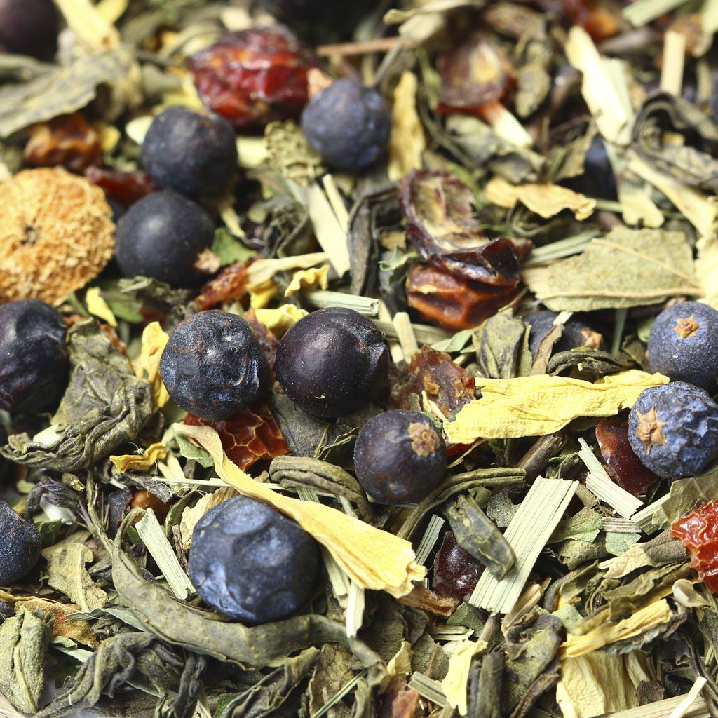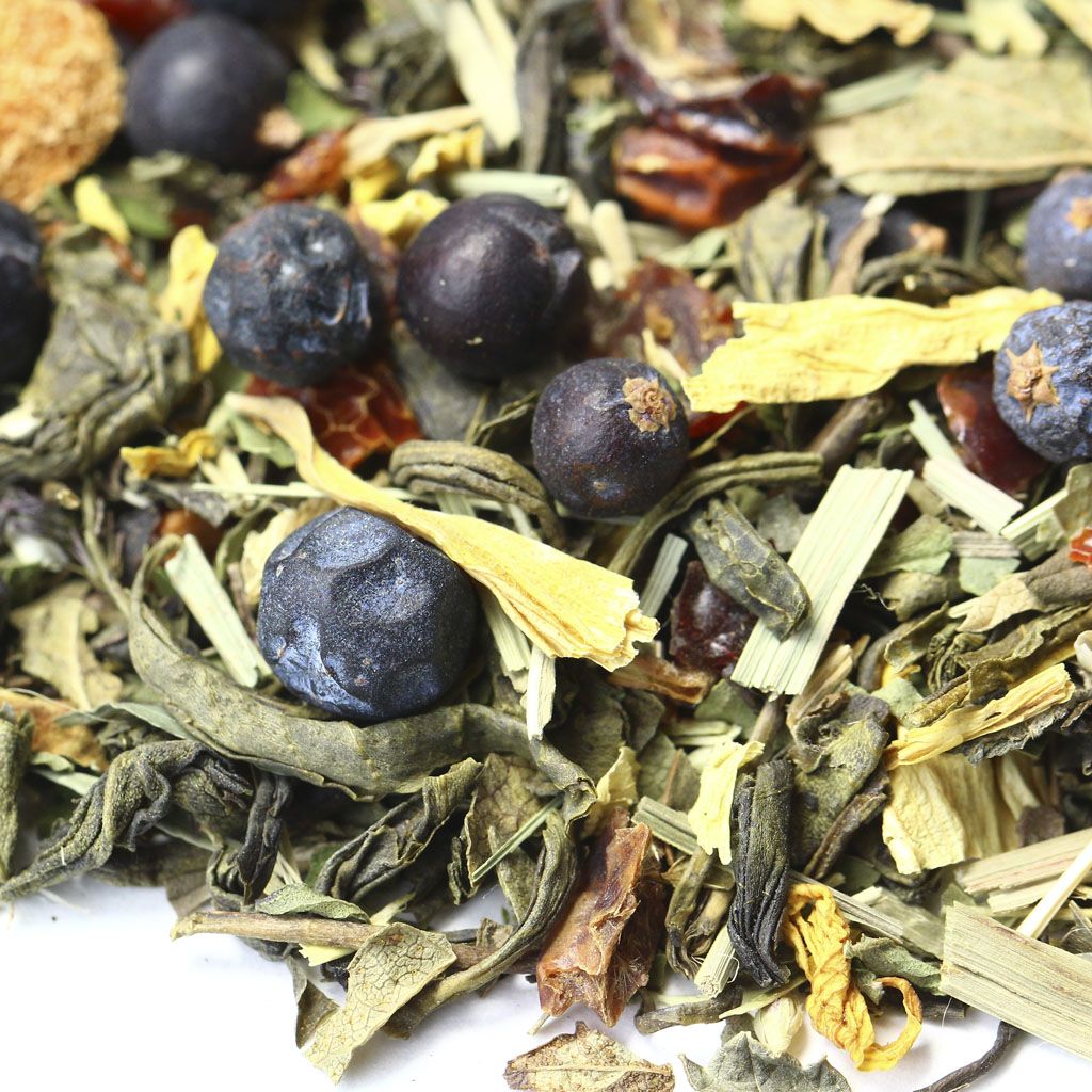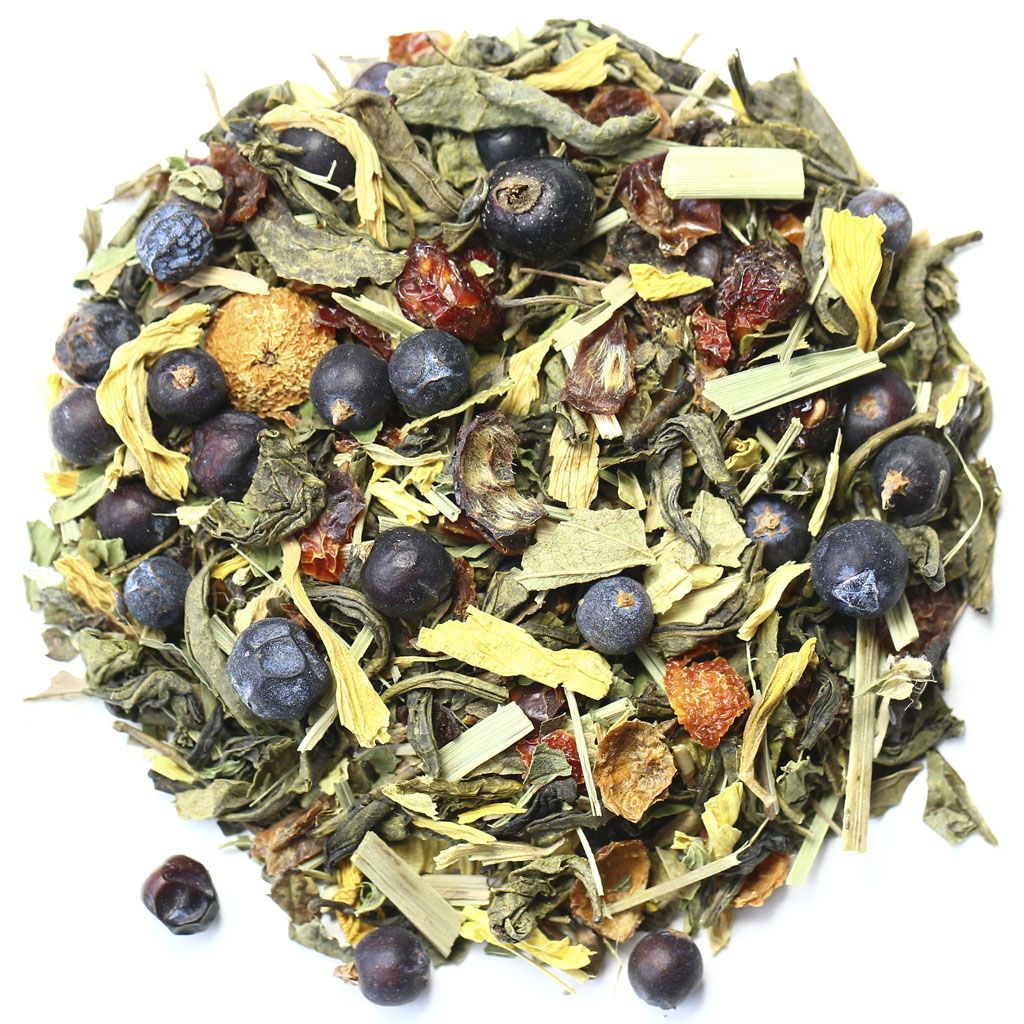 Чай зеленый китайский среднелистовой, плоды можжевельника, плоды шиповника измельченные, листья мяты, листья крапивы, лемонграсс, ягоды черной смородины, лист смородины, лепестки подсолнечника.
