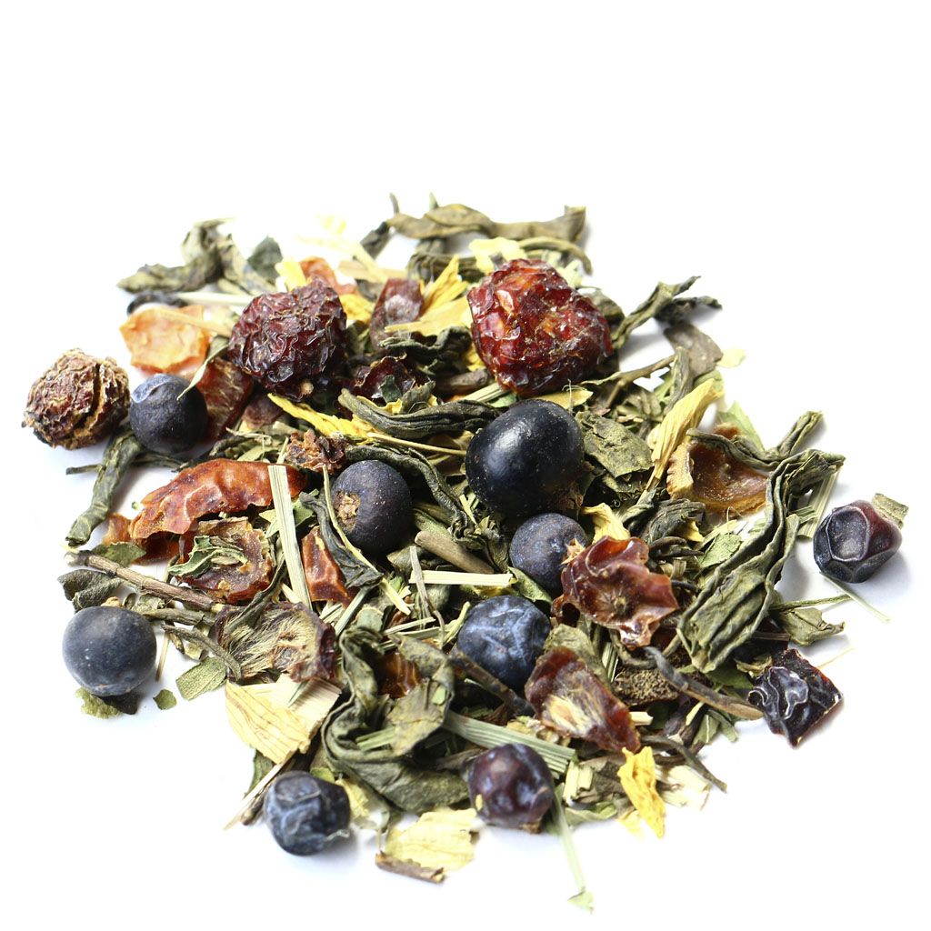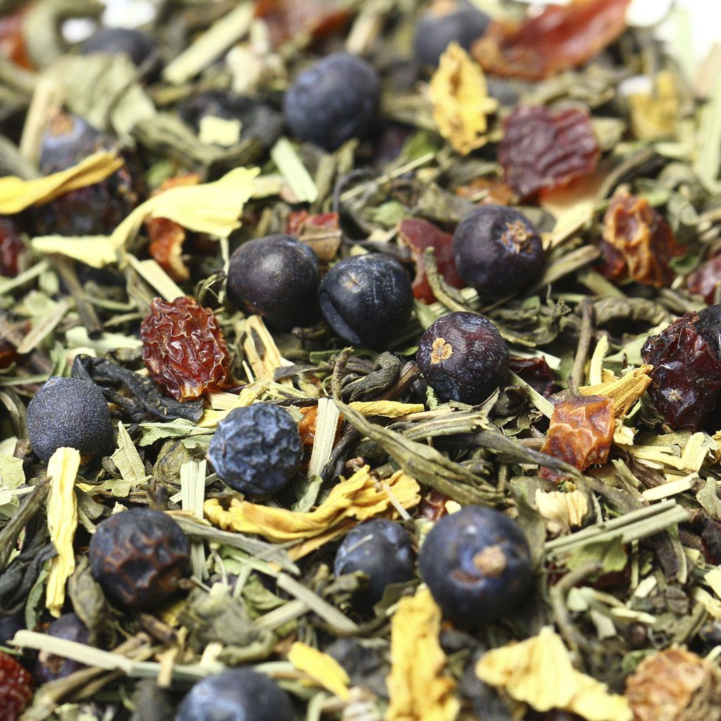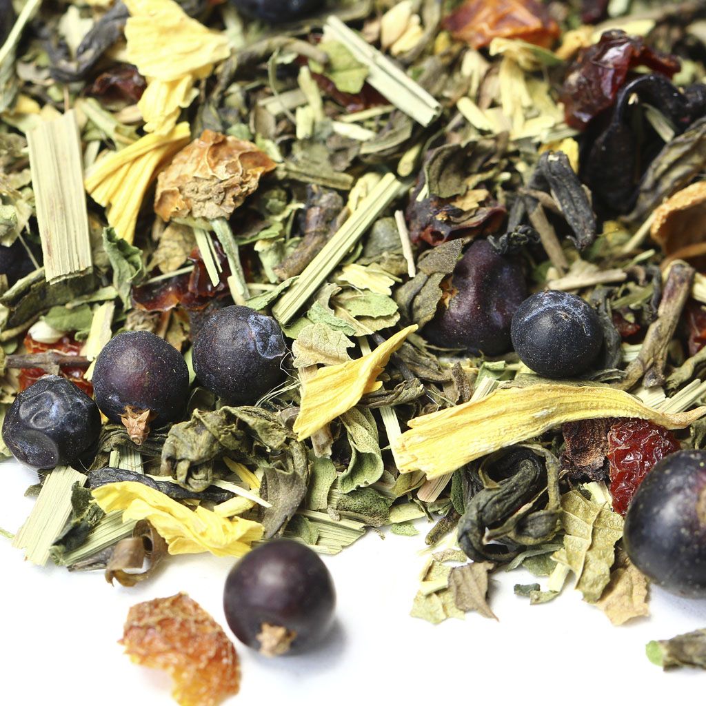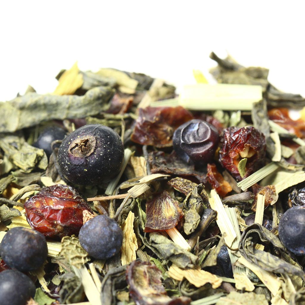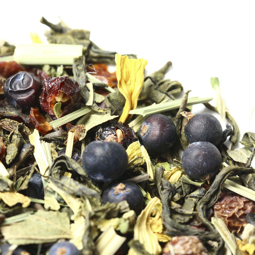 Чай зеленый китайский среднелистовой, плоды можжевельника, плоды шиповника измельченные, листья мяты, листья крапивы, лемонграсс, ягоды черной смородины, лист смородины, лепестки подсолнечника.