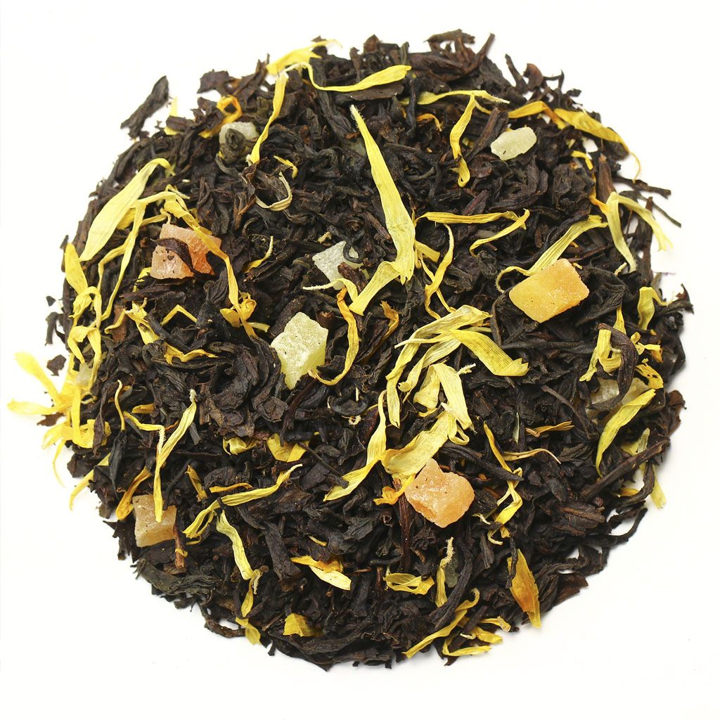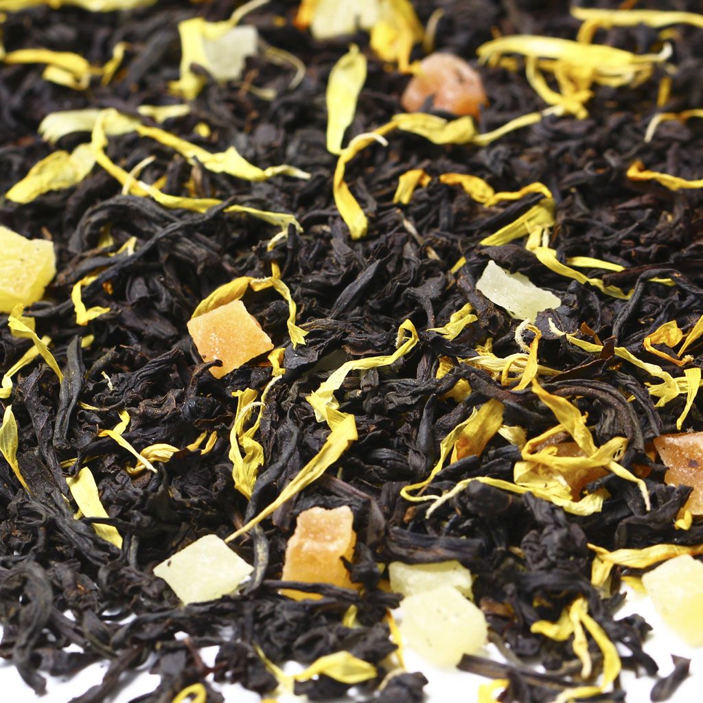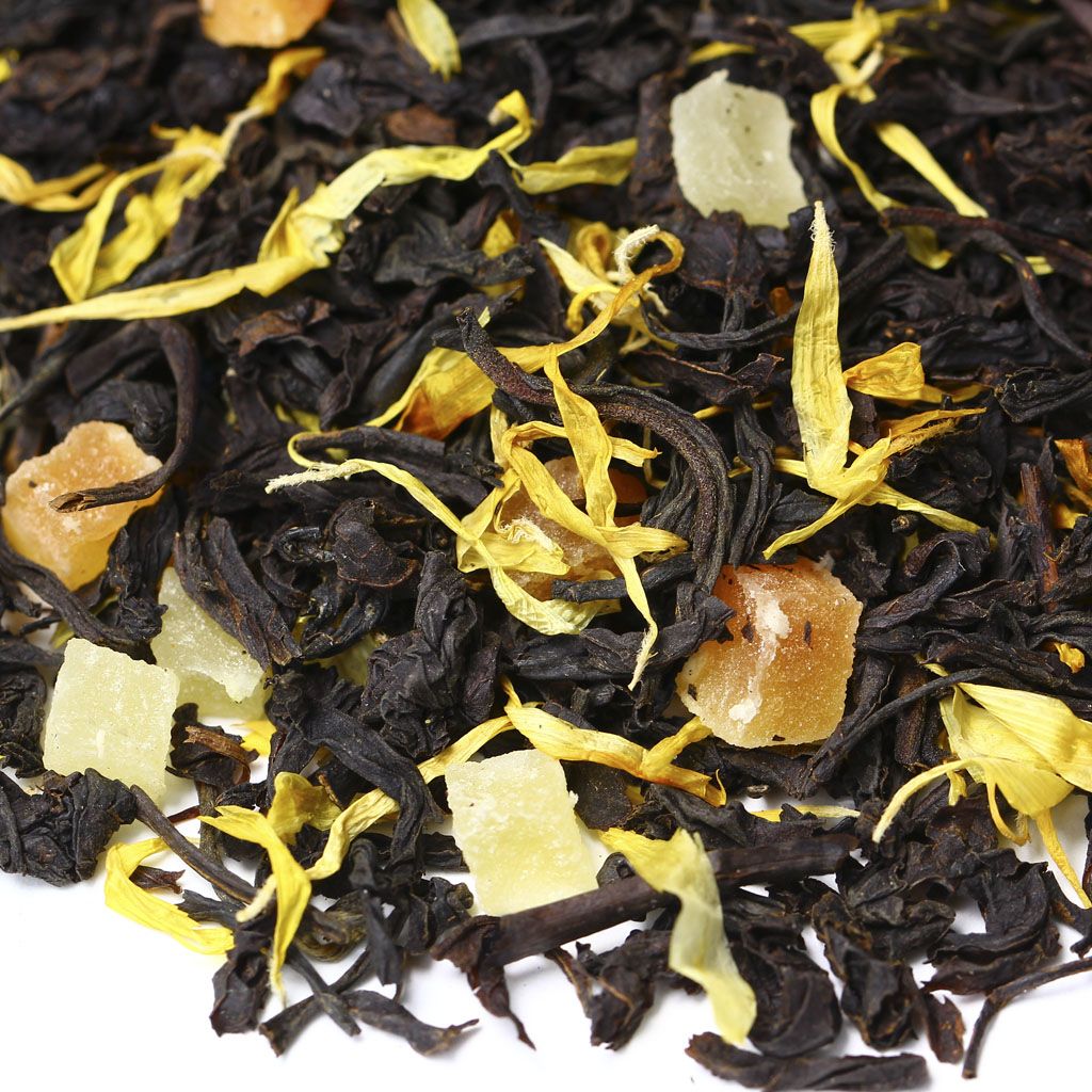 Чай черный цейлонский, кусочки ананаса, кусочки папайи, лепестки календулы, аромат дыни и сливок.