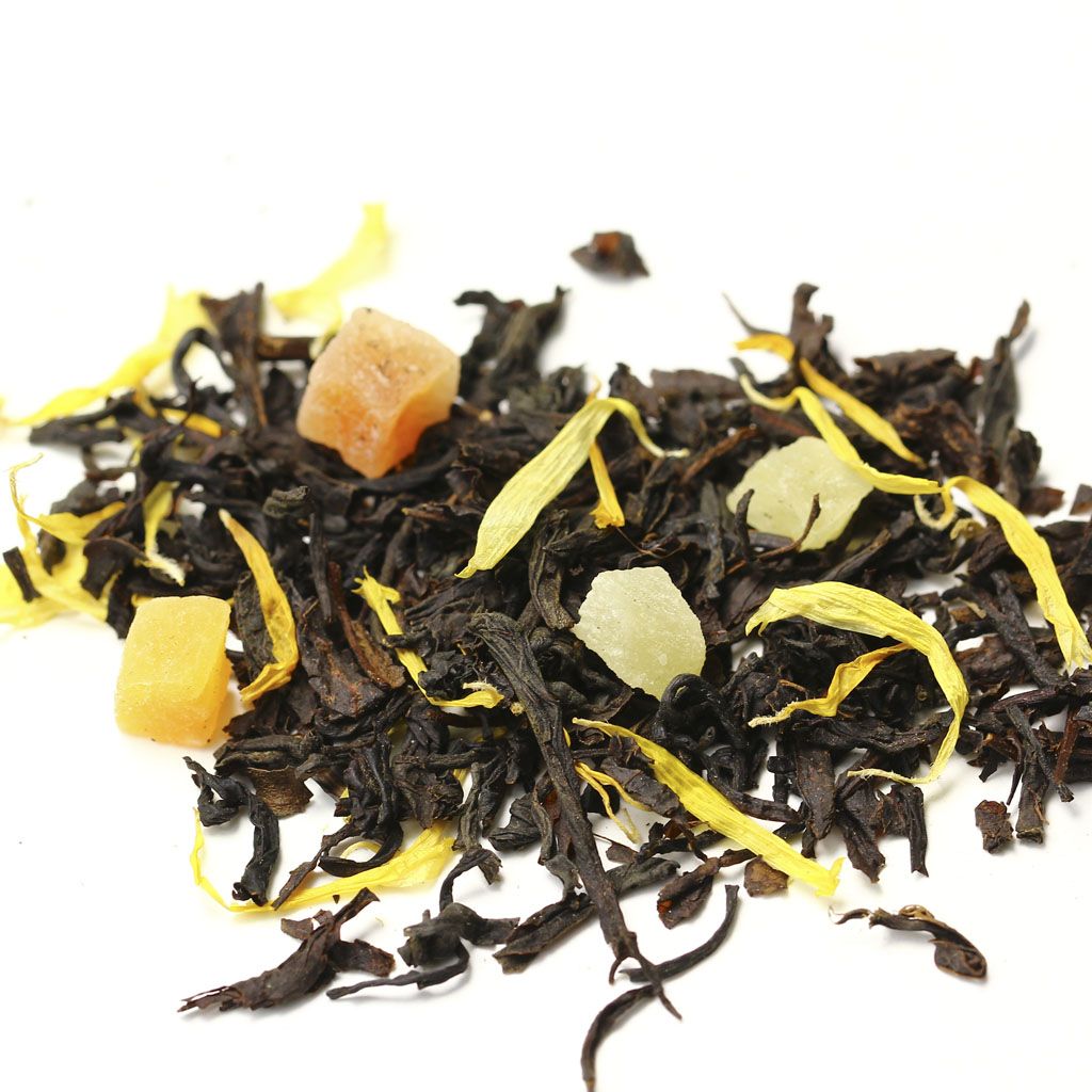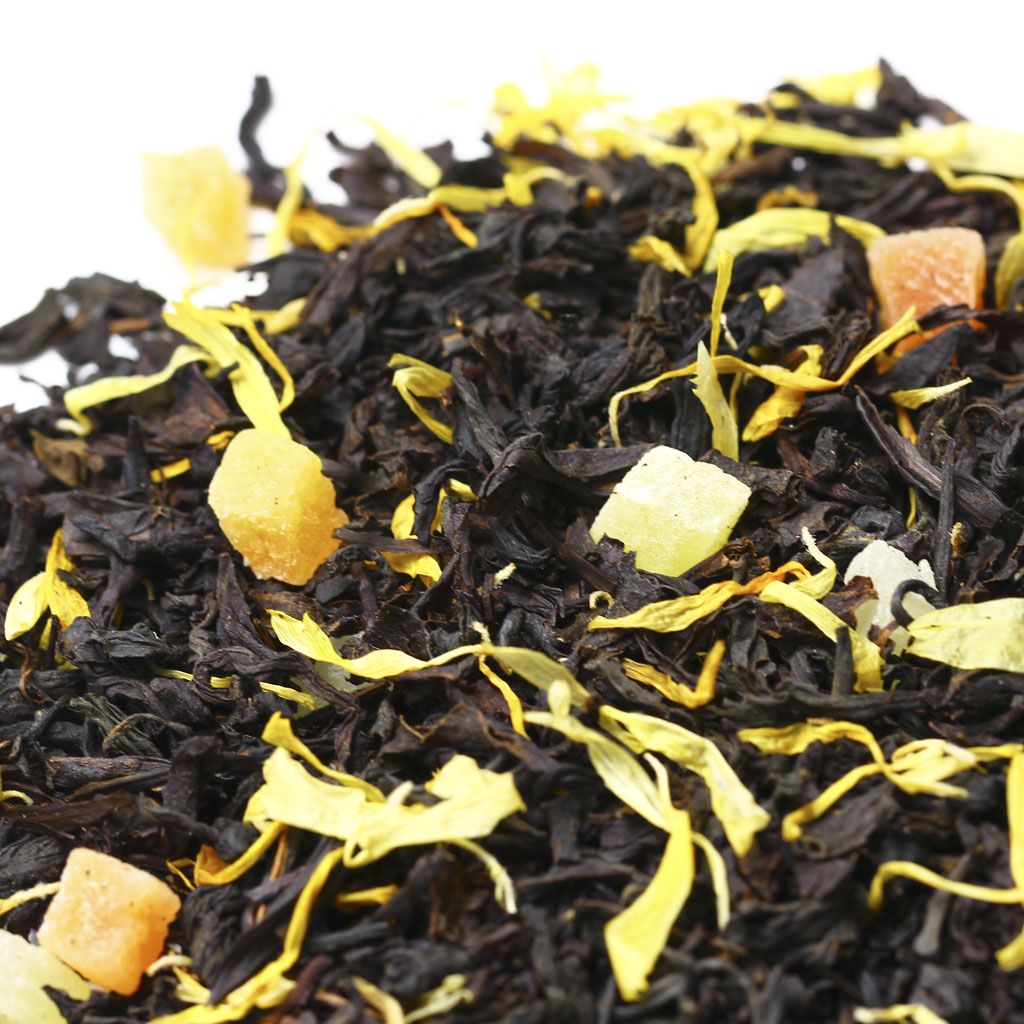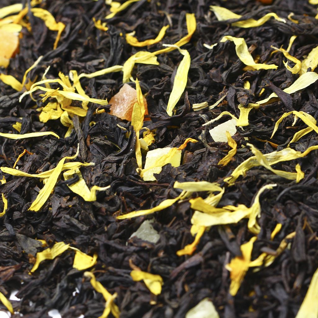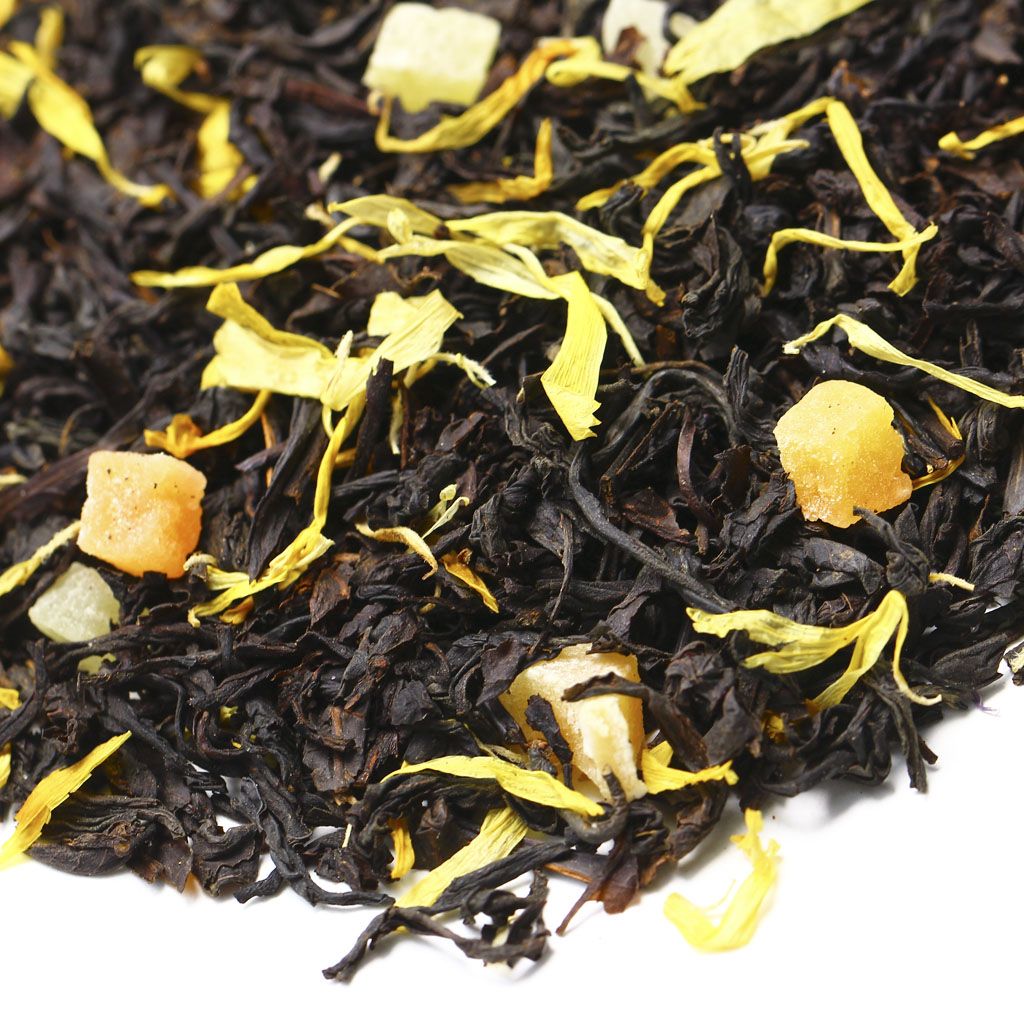 Чай черный цейлонский, кусочки ананаса, кусочки папайи, лепестки календулы, аромат дыни и сливок.