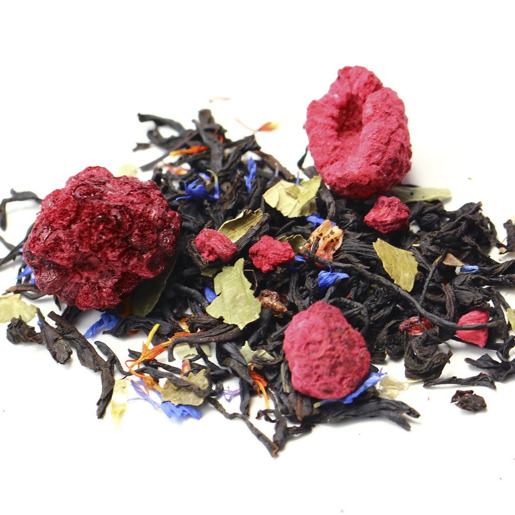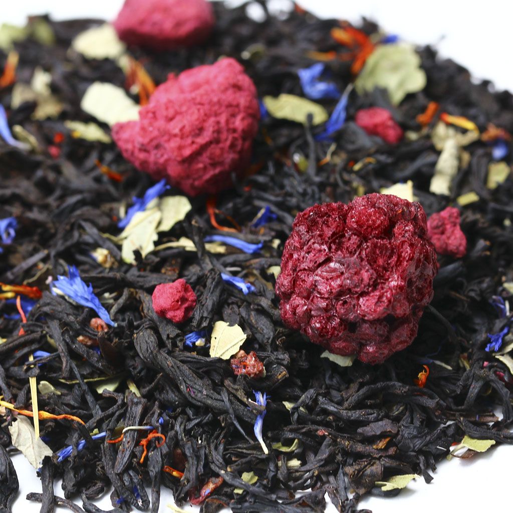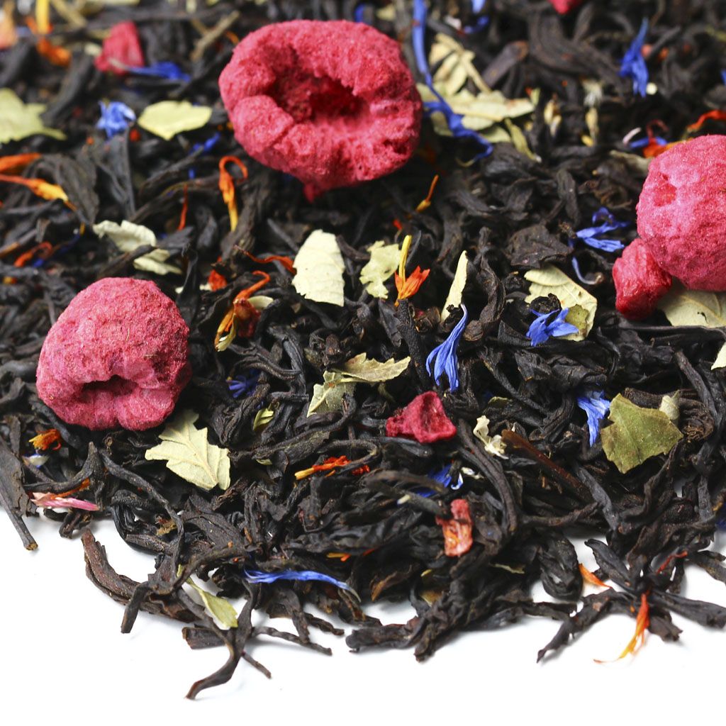 Чай черный индийский, целые ягоды ежевики, целые ягоды малины, кусочки малины, листья ежевики, лепестки василька, лепестки сафлора, аромат ежевики и малины