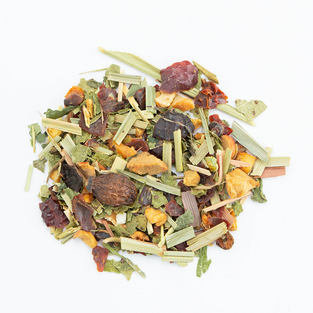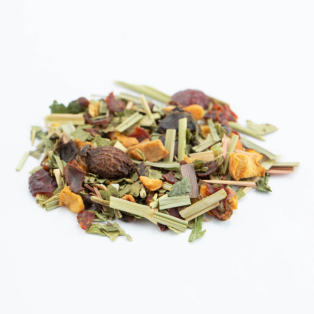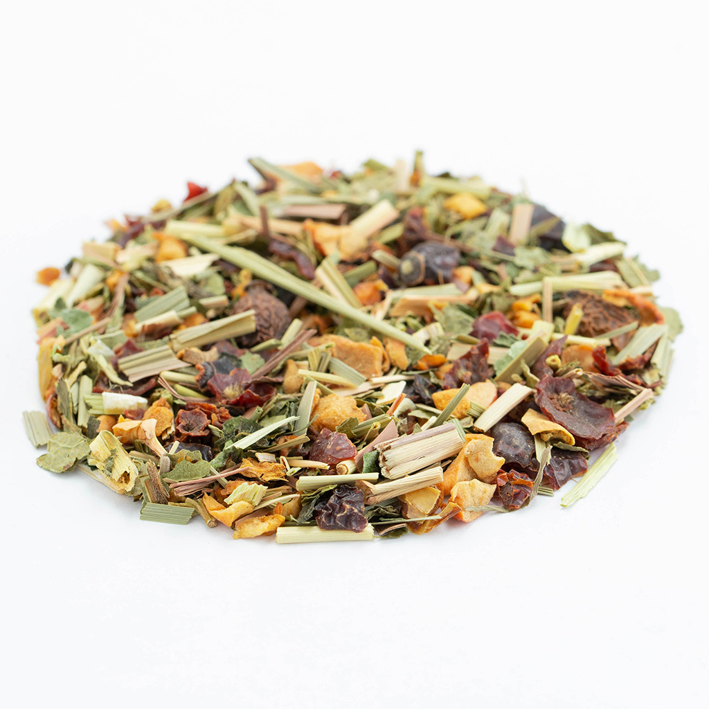 В состав сбора входят - эхинацея, шиповник измельченный, кусочки яблок, лемонграс, листья смородины, мята, крапива.