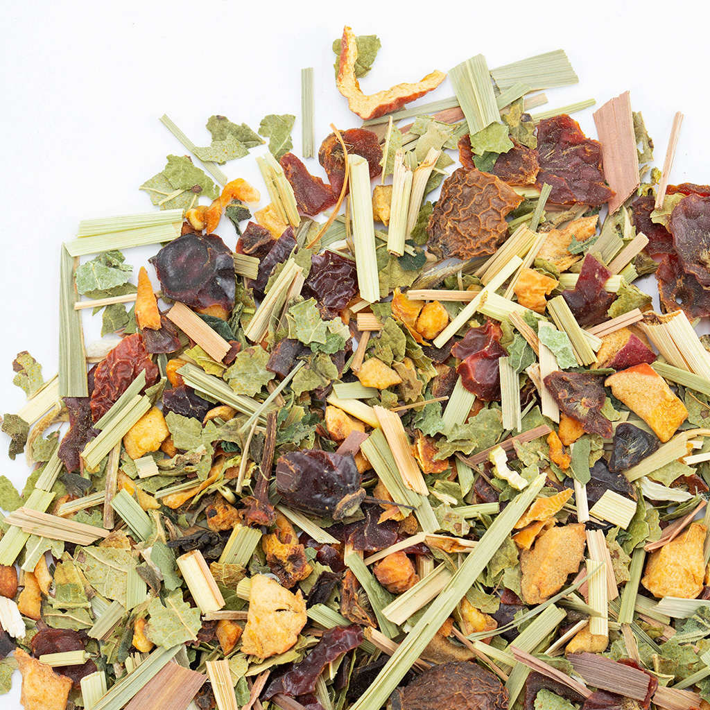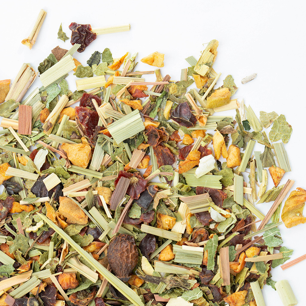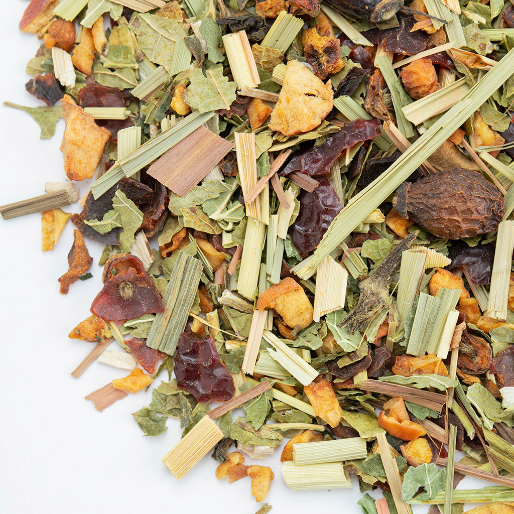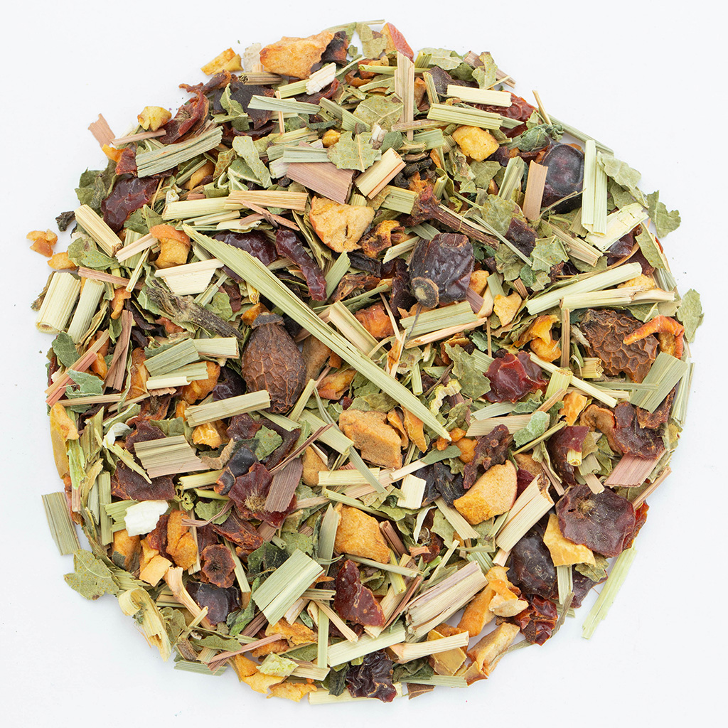 В состав сбора входят - эхинацея, шиповник измельченный, кусочки яблок, лемонграс, листья смородины, мята, крапива.