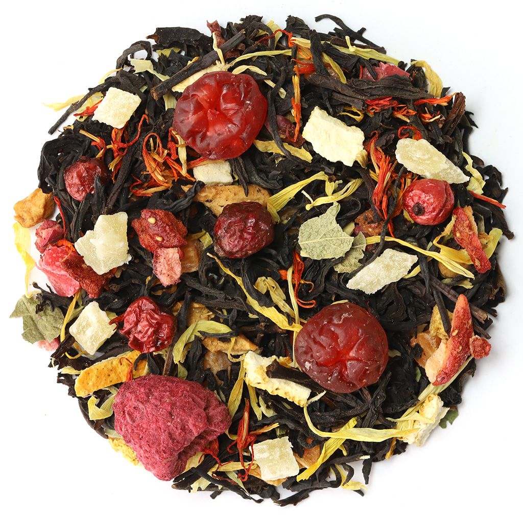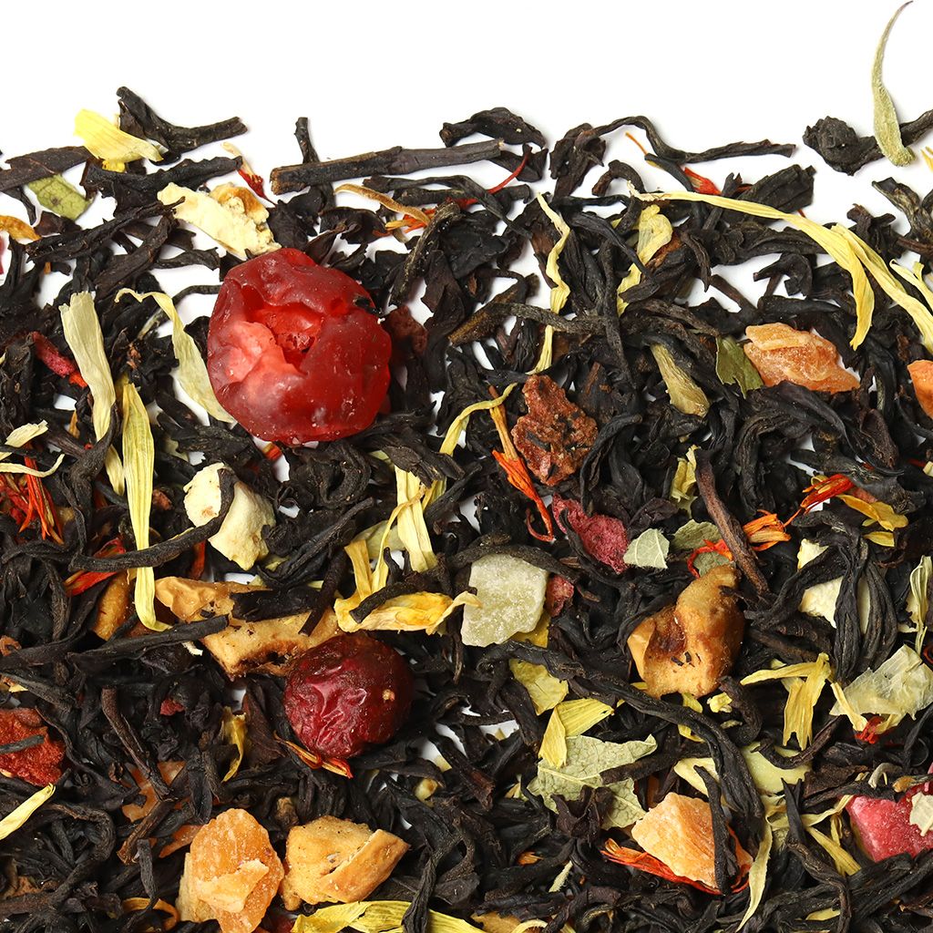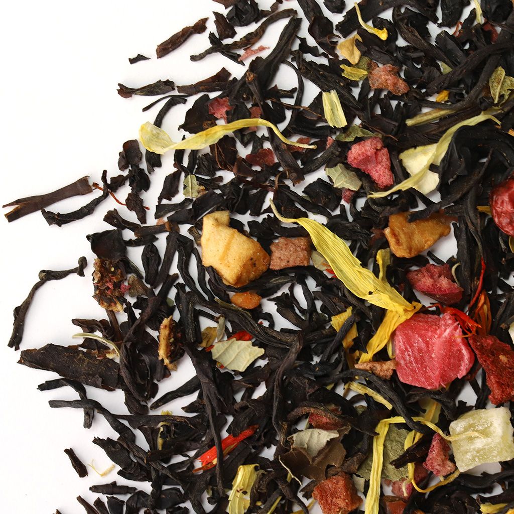 Чай черный цейлонский высокогорный, кусочки ананаса, целые ягоды малины, кусочки яблок, кусочки клубники, кусочки клюквы, ягоды красной смородины, лепестки календулы, листья смородины, сладкий фруктовый аромат