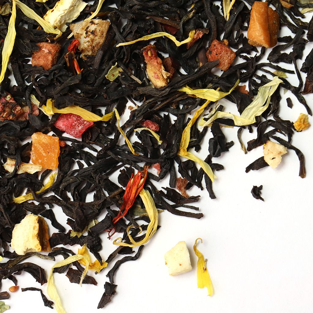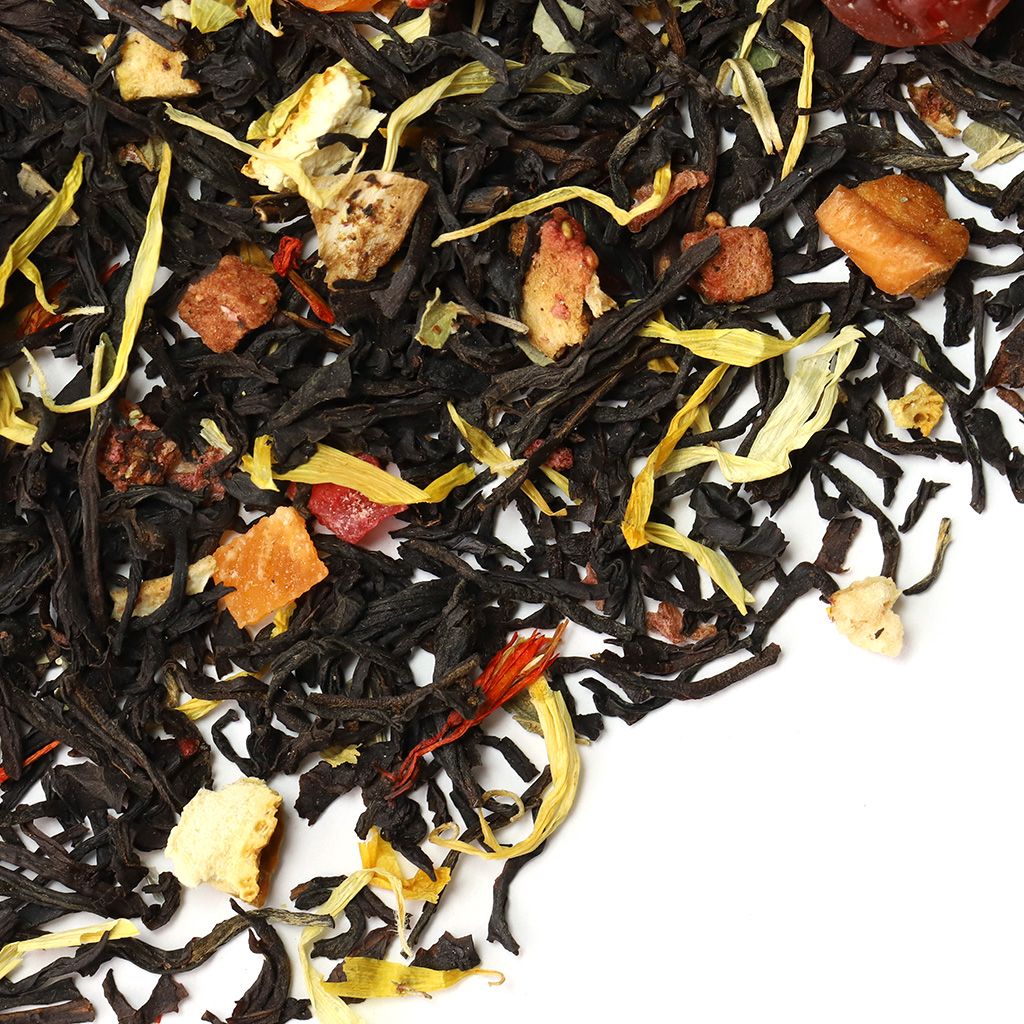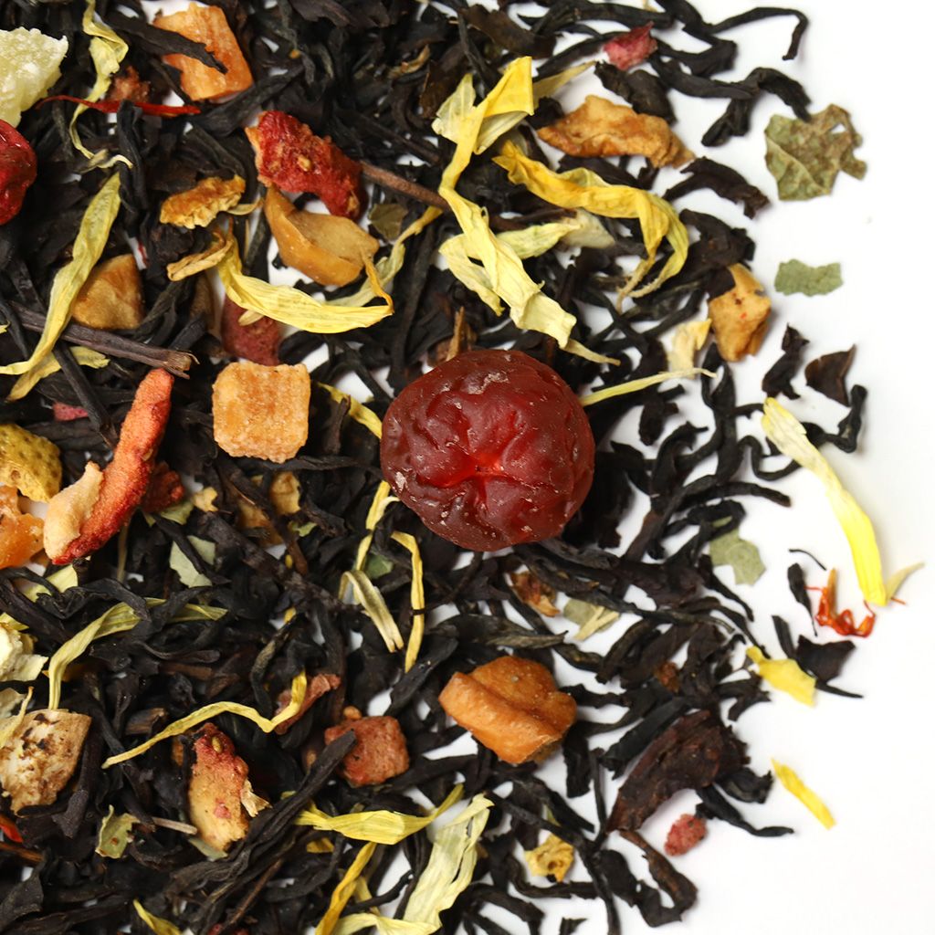 Чай черный цейлонский высокогорный, кусочки ананаса, целые ягоды малины, кусочки яблок, кусочки клубники, кусочки клюквы, ягоды красной смородины, лепестки календулы, листья смородины, сладкий фруктовый аромат