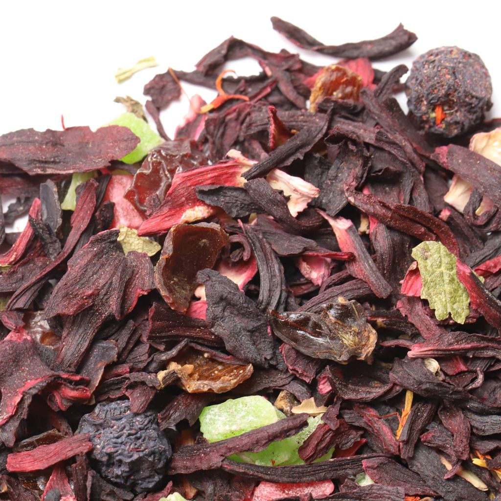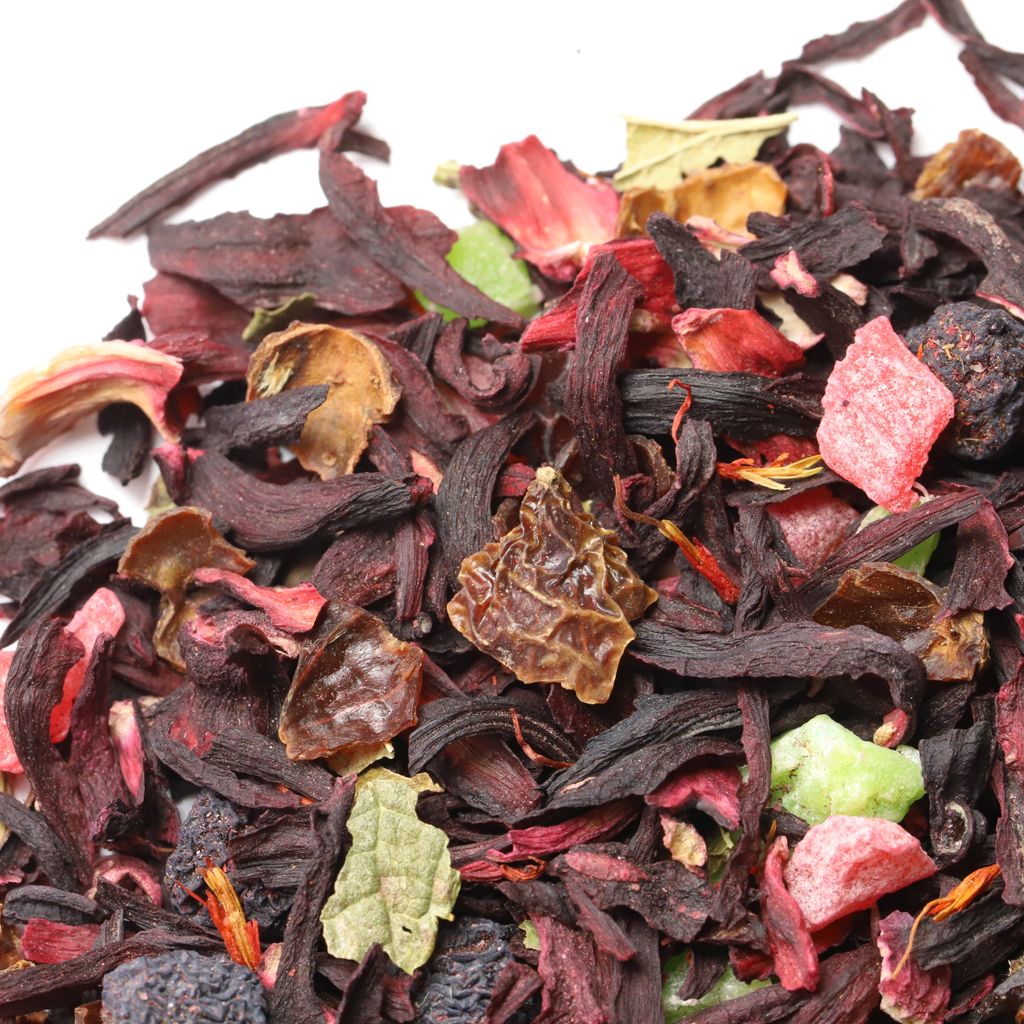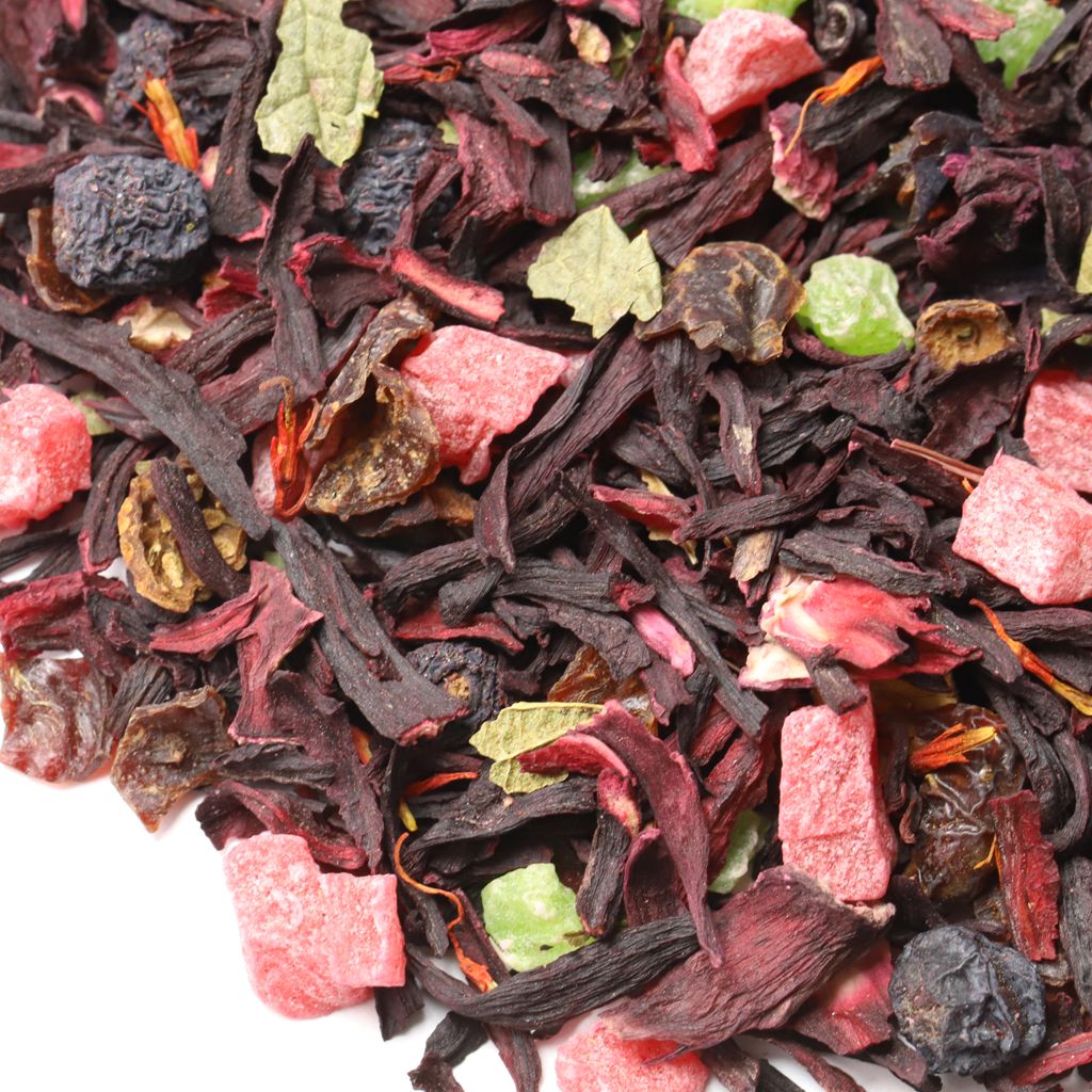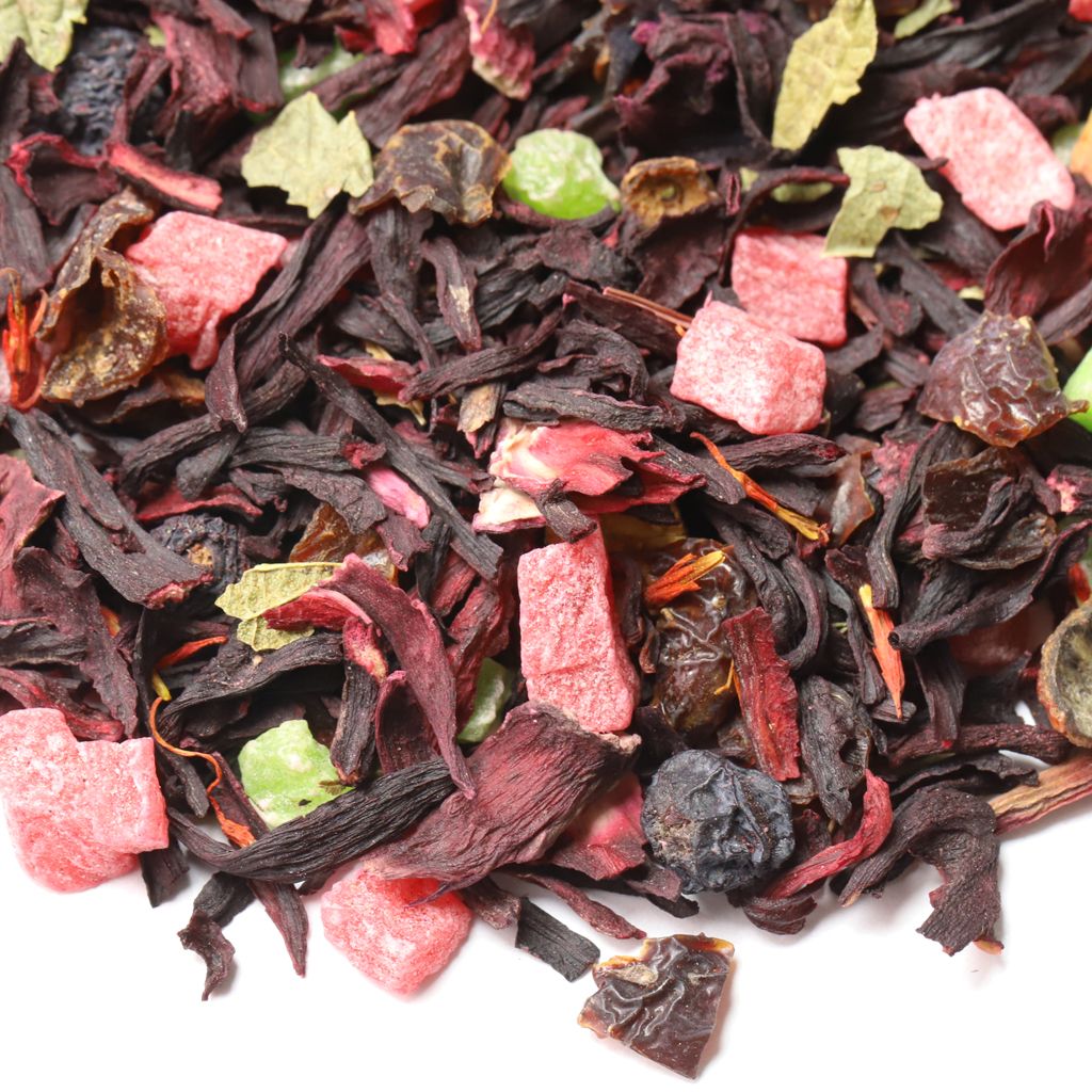 Ароматный легкий купаж на основе каркадэ, разбавленного кусочками ананаса, плодами аронии (рябины черноплодной) и измельченными плодами шиповника и дополненного листьями смородины и лепестками сафлора.