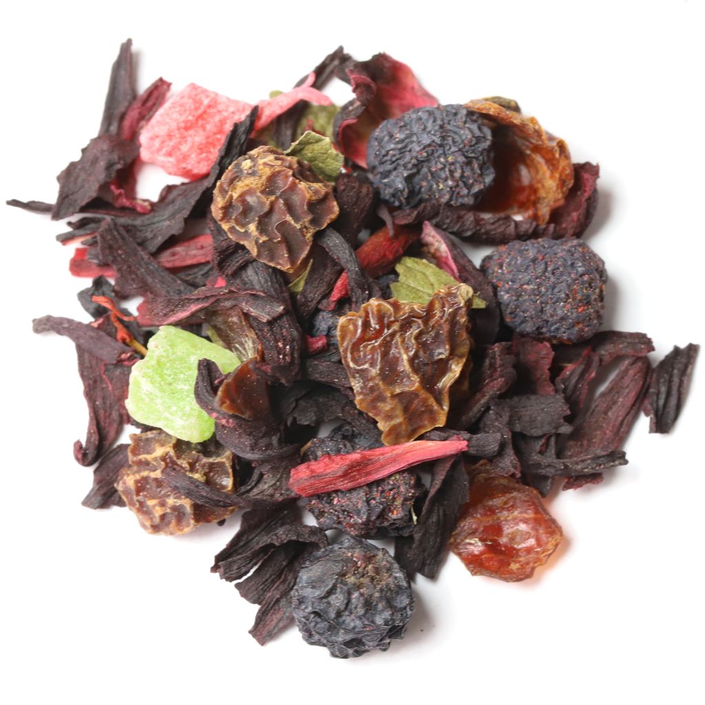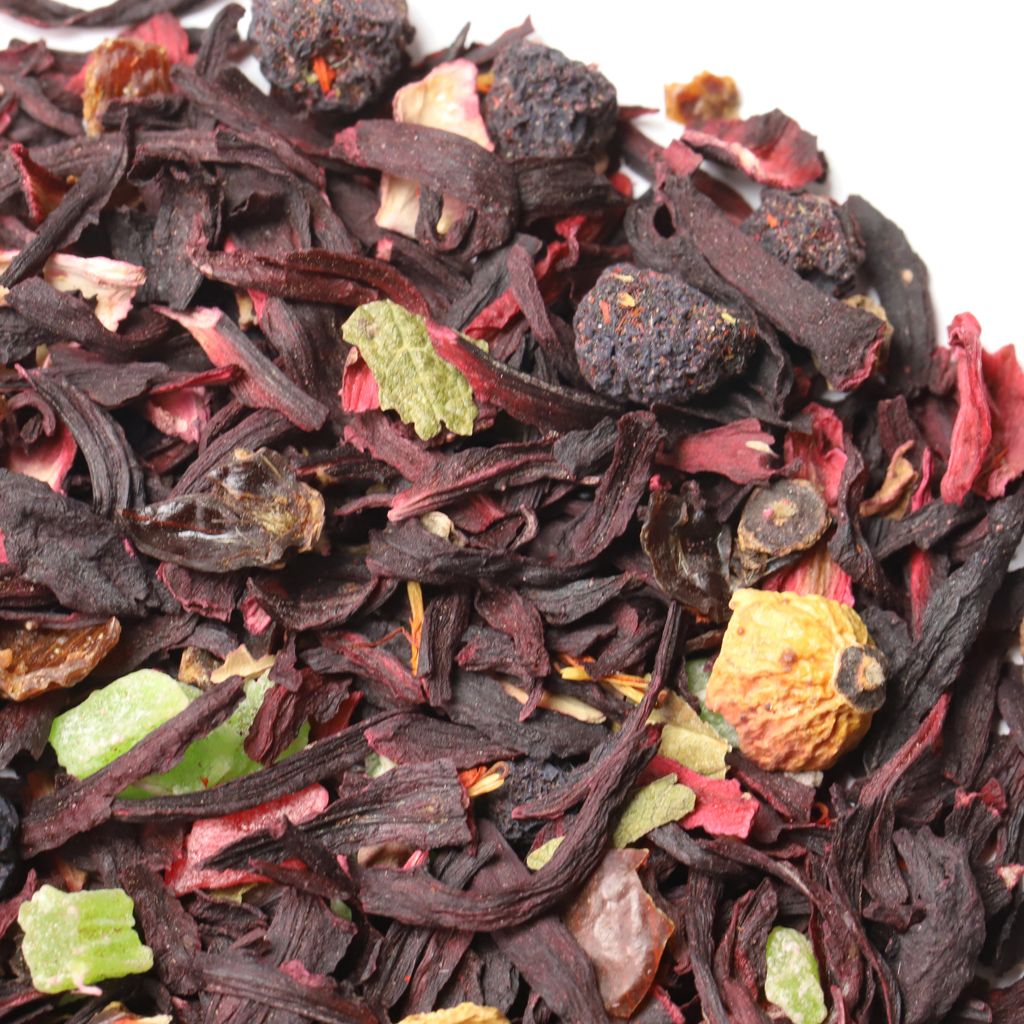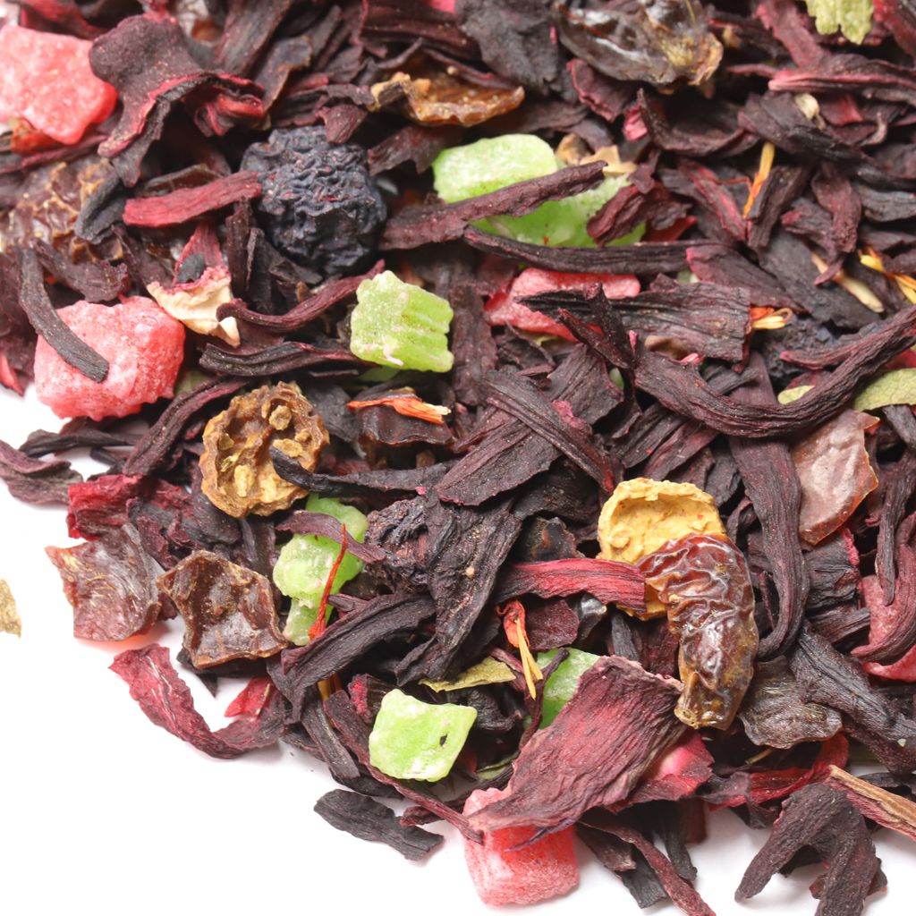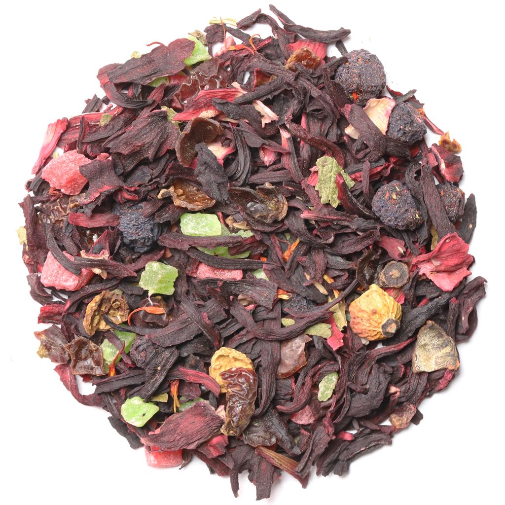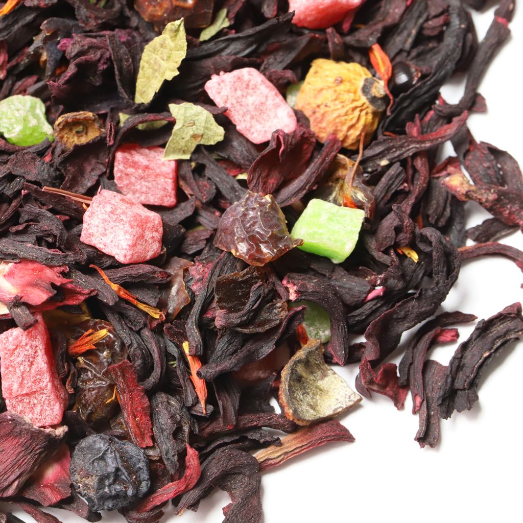 Ароматный легкий купаж на основе каркадэ, разбавленного кусочками ананаса, плодами аронии (рябины черноплодной) и измельченными плодами шиповника и дополненного листьями смородины и лепестками сафлора.