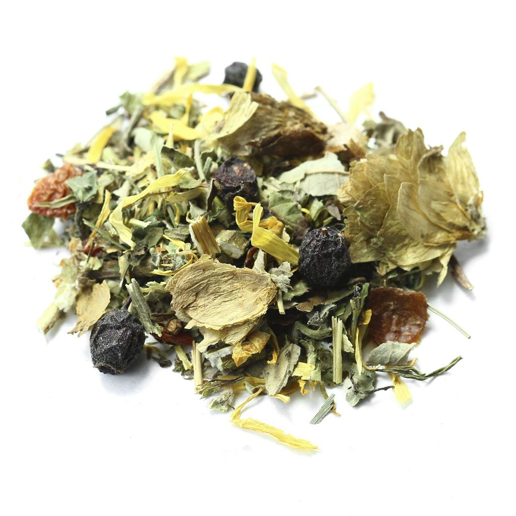 Плоды боярышника, пустырник, листья ежевики, мелисса, шиповник измельченный, плоды аронии, зверобой, листья мяты, шишки хмеля, лепестки календулы.