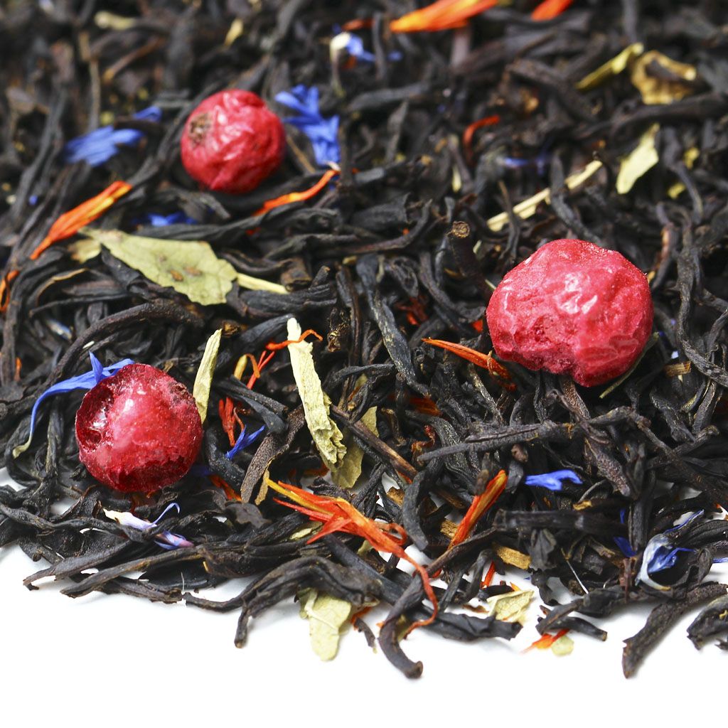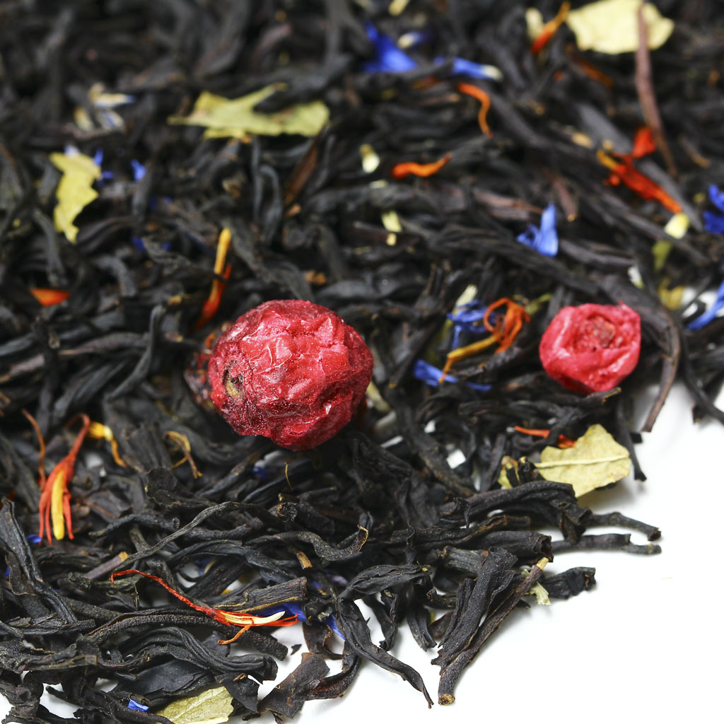 Черный индийский чай Ассам дополнен ягодами красной смородины, лепестками сафлора и василька, листьями смородины, аромат садовых ягод окутывает собой эту восхитительную композицию.