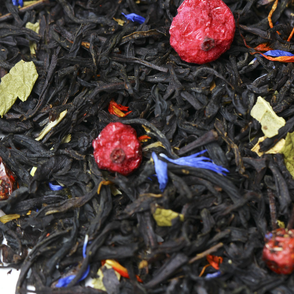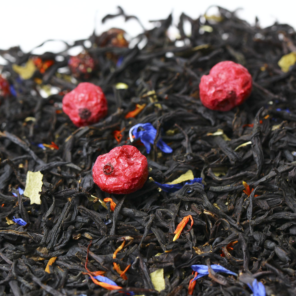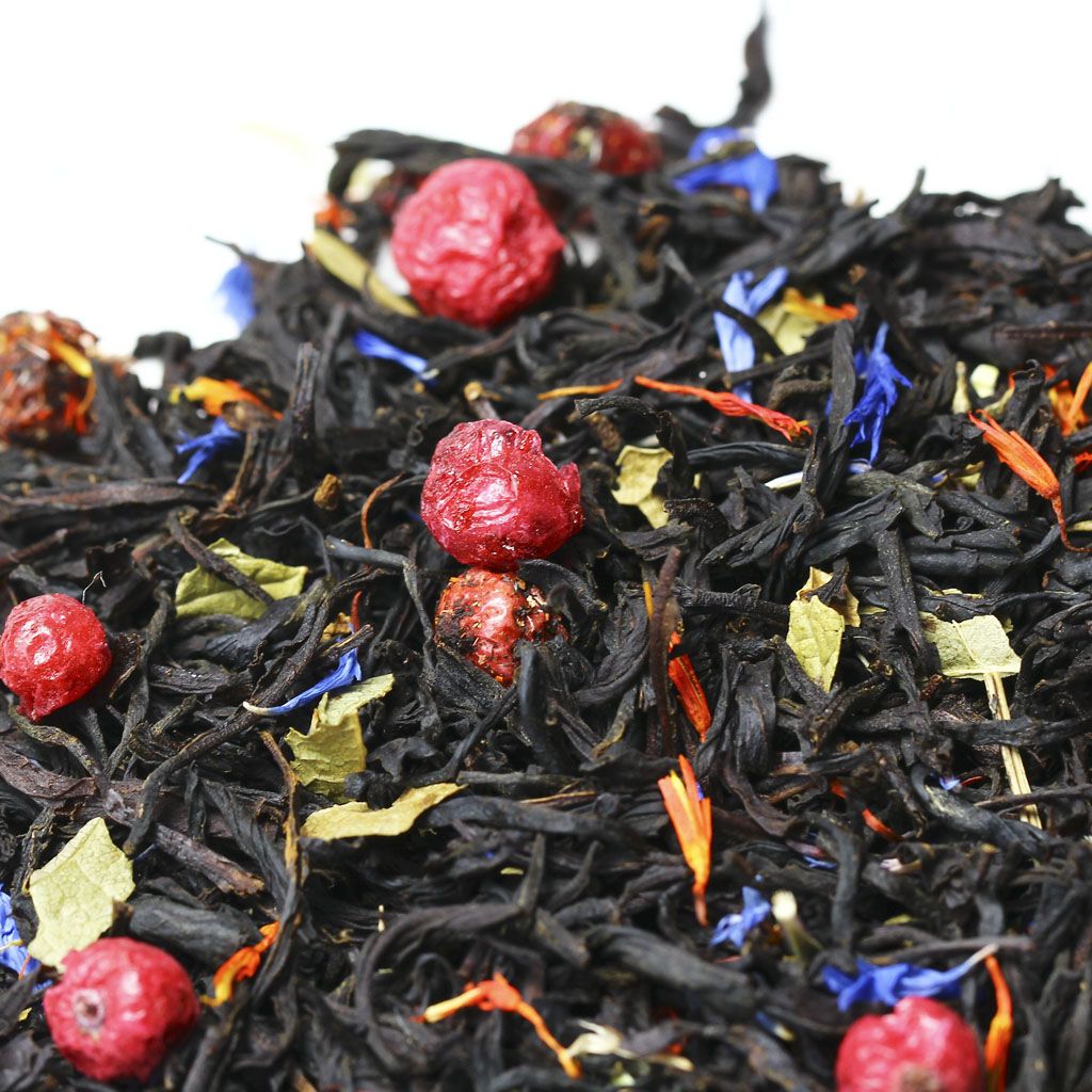 Красные бусины ягод, штрихи синих и оранжевых лепестков и вкрапления зеленого рассыпаны на черном бархате чайного листа.