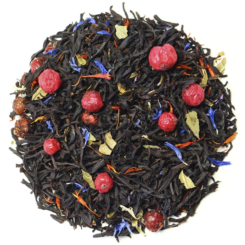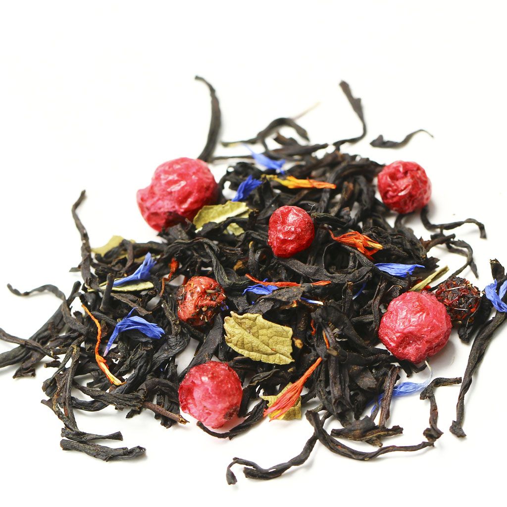 Чай черный индийский Ассам, ягоды красной смородины, лепестки сафлора, лепестки василька, листья смородины, аромат садовых ягод.