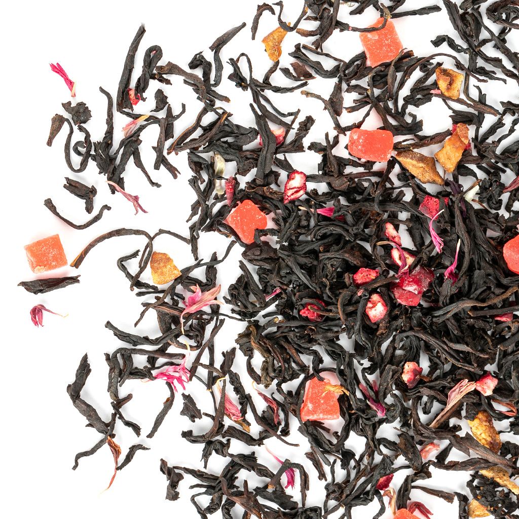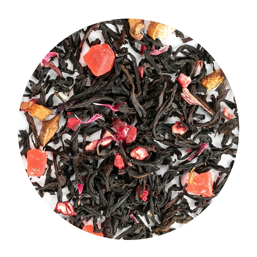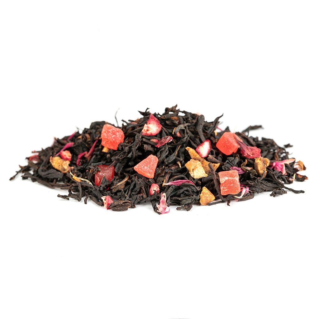 Чай черный цейлонский, кусочки ананаса, кусочки груши, кусочки клюквы, василек, аромат граната и груши.