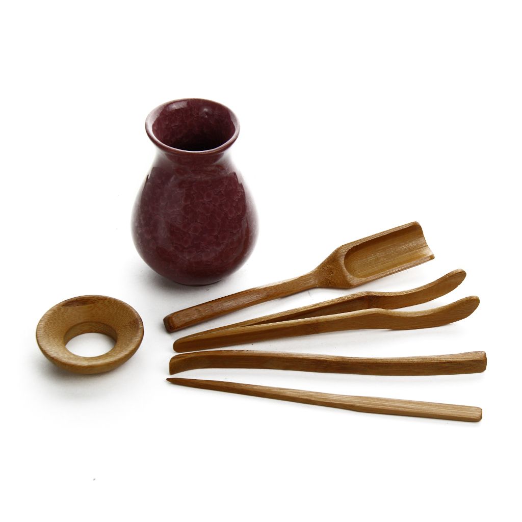 Набор чайных принадлежностей из светлого дерева в керамической подставке Колотый Лед, включает чайную иглу, пинцет, лопатку и совочек